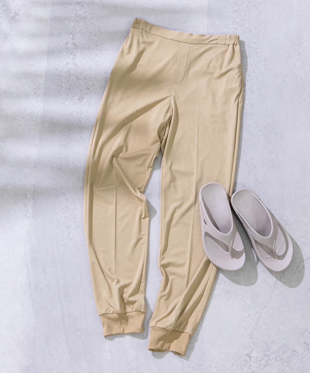 伸縮性のあるカット素材で仕上げたジョガーパンツ。後ろ裾にスリットを入れてカジュアルすぎない抜け感のあるデザインに仕上げ、足さばきの良さがポイント◎。撥水性・速乾性もあり、アイロン無しですぐに着られて忙しいママにも嬉しいアイテムです。
