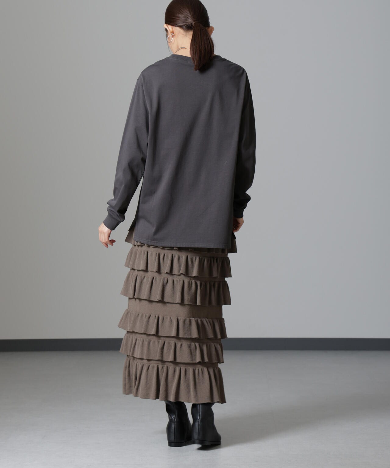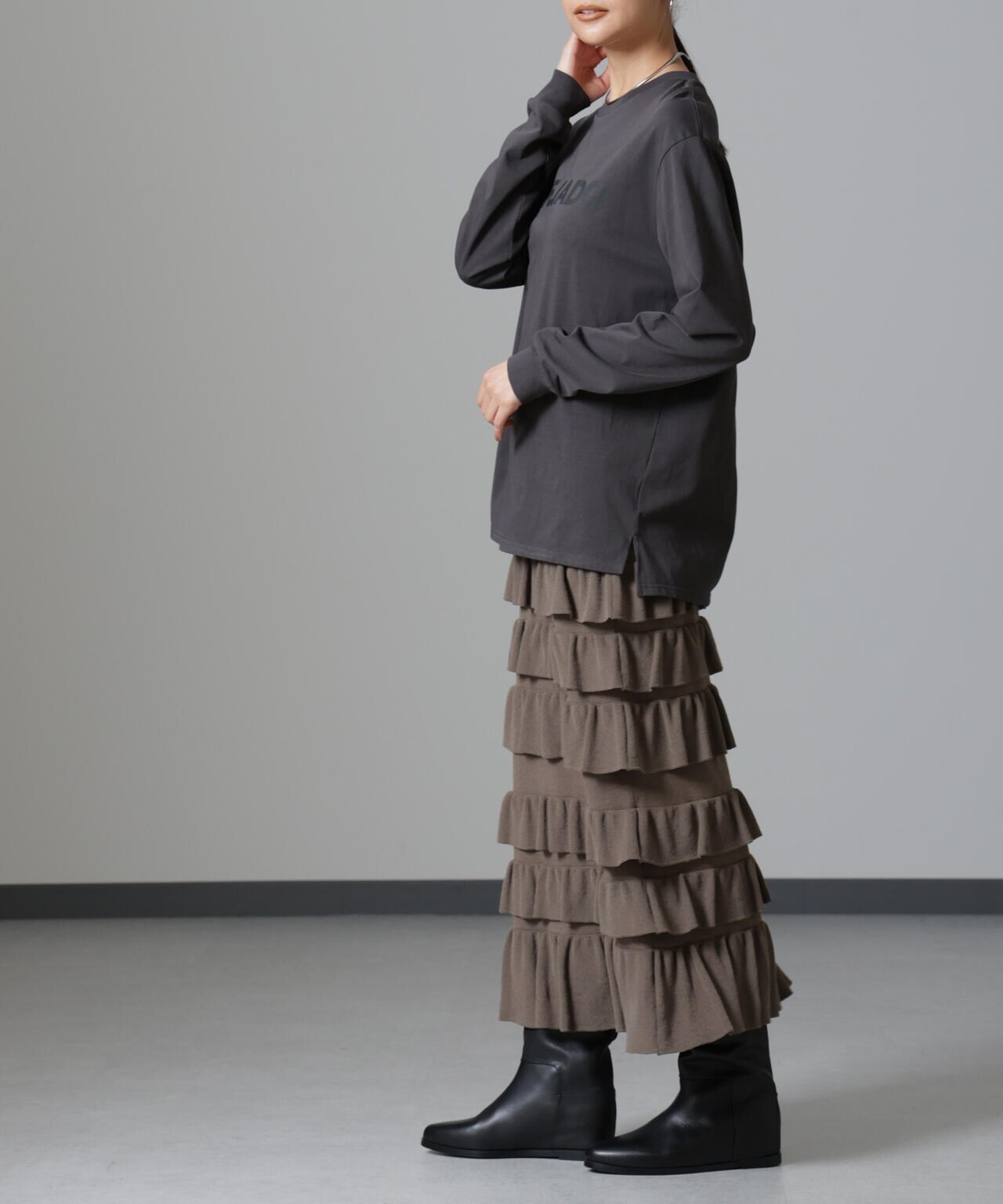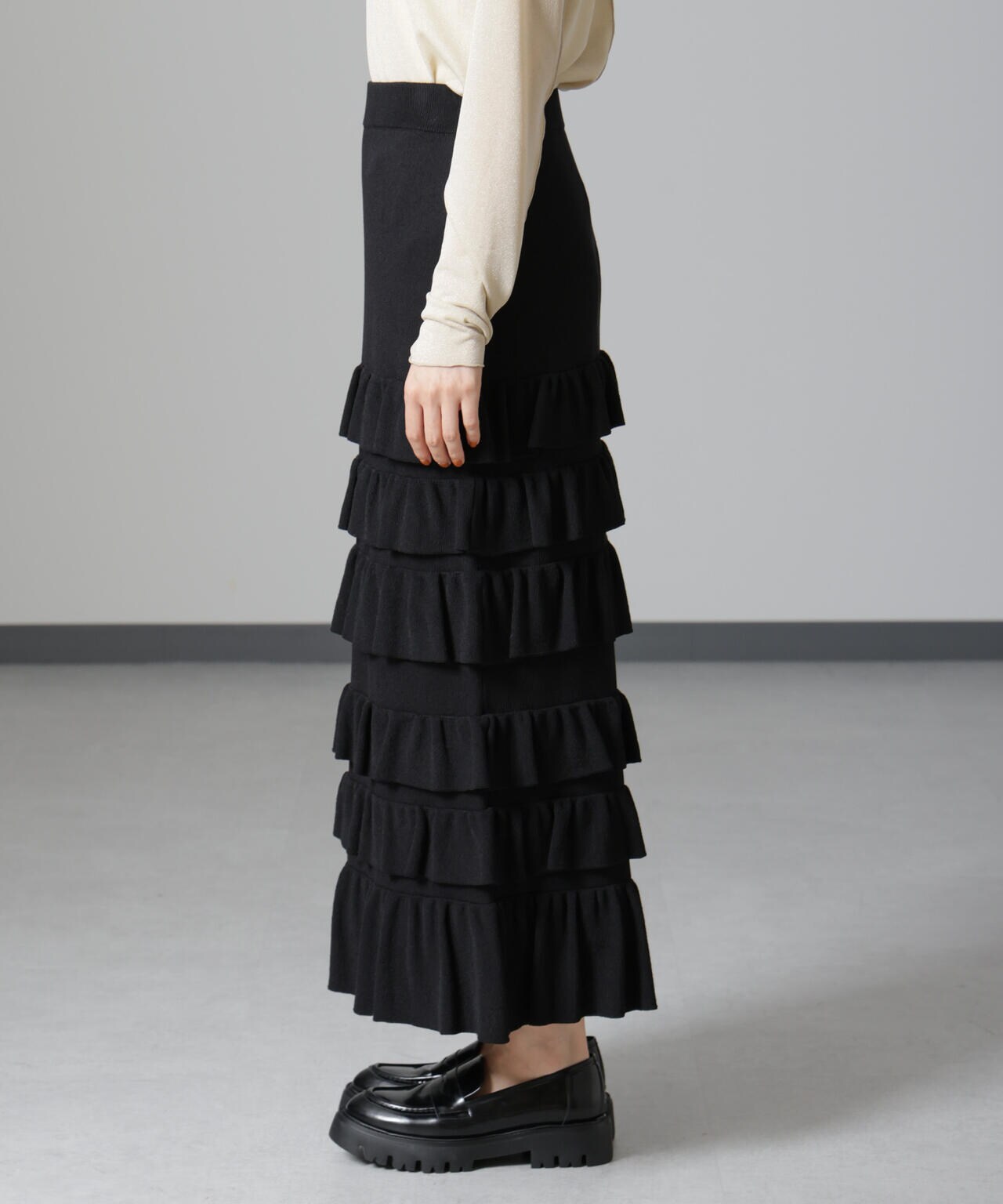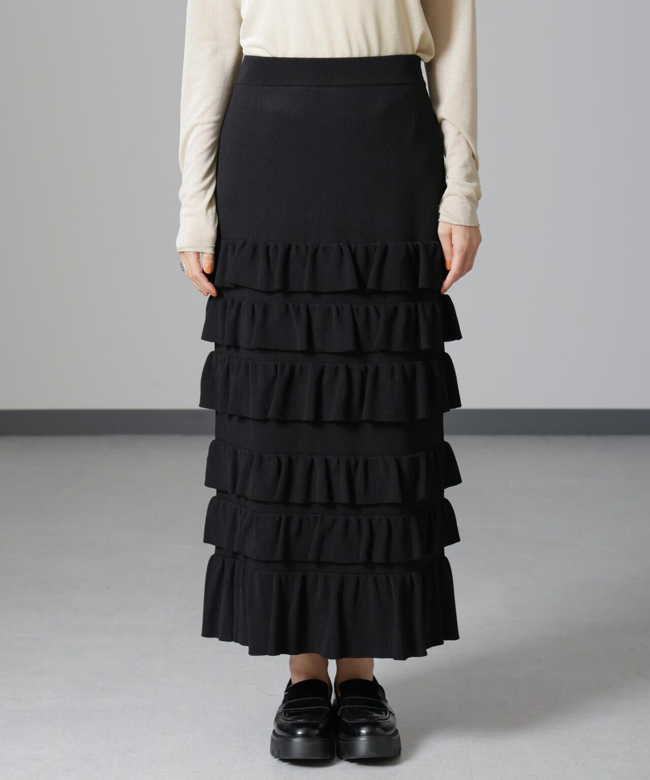 程よくボリューム感のある女性らしいフリルデザインのニットスカート。Iラインのシルエットなので、甘すぎずスタイリッシュにスタイリングできる主役級アイテム。
