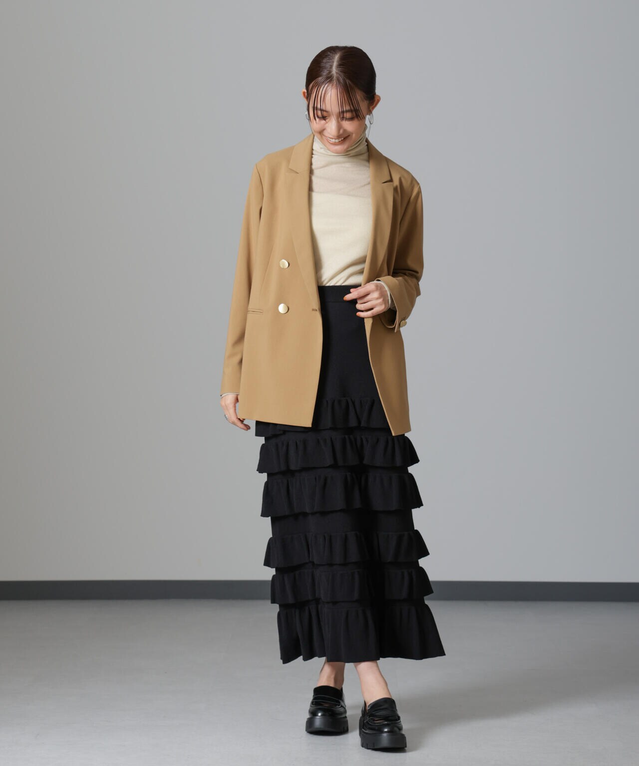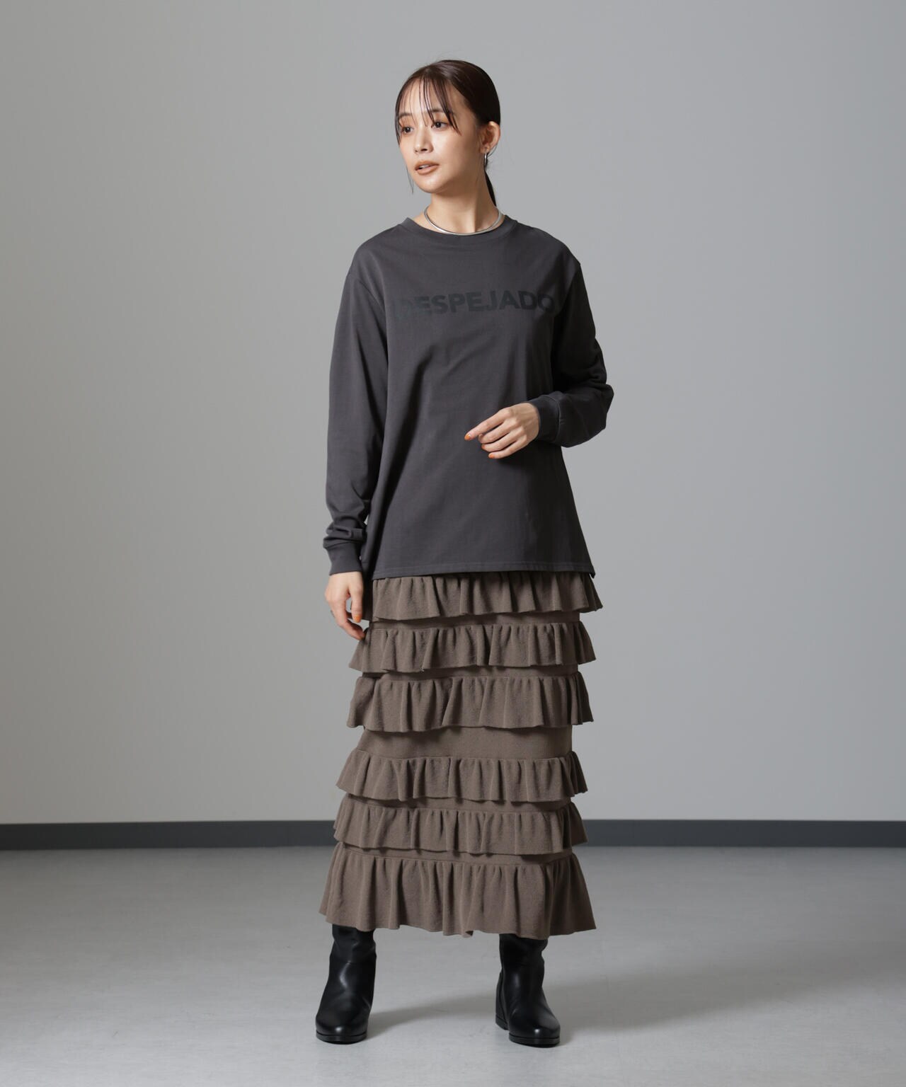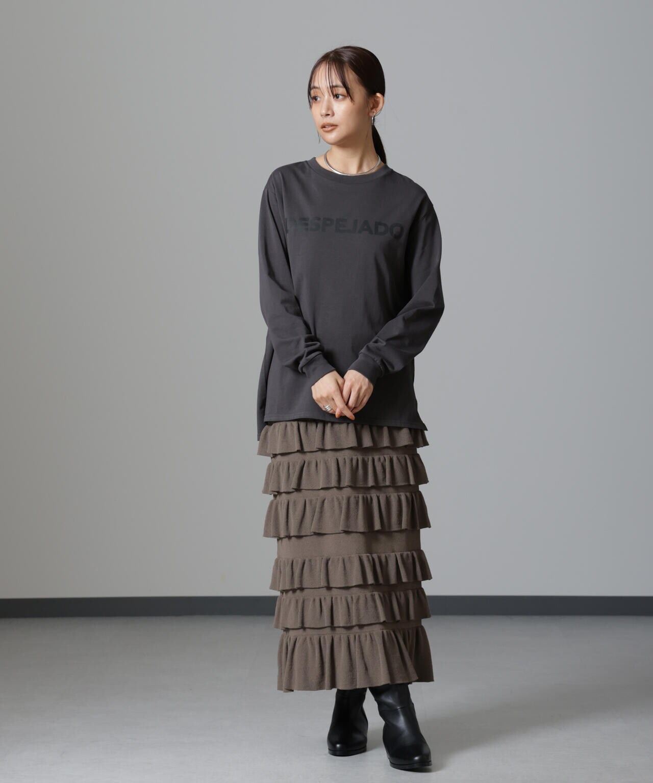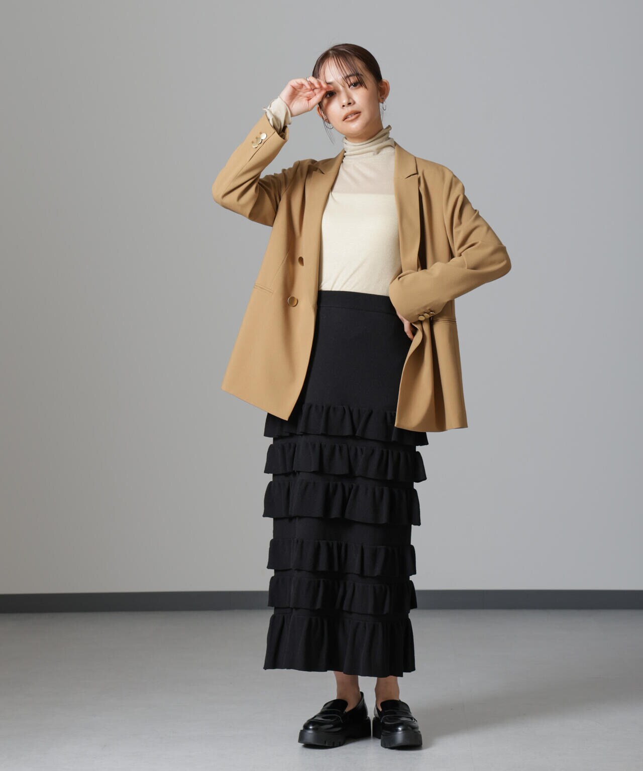程よくボリューム感のある女性らしいフリルデザインのニットスカート。Iラインのシルエットなので、甘すぎずスタイリッシュにスタイリングできる主役級アイテム。