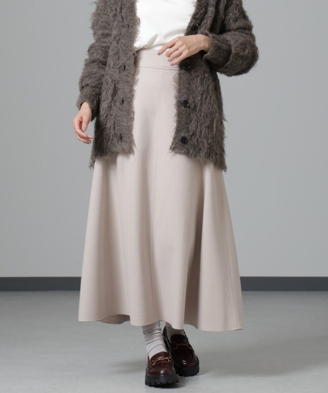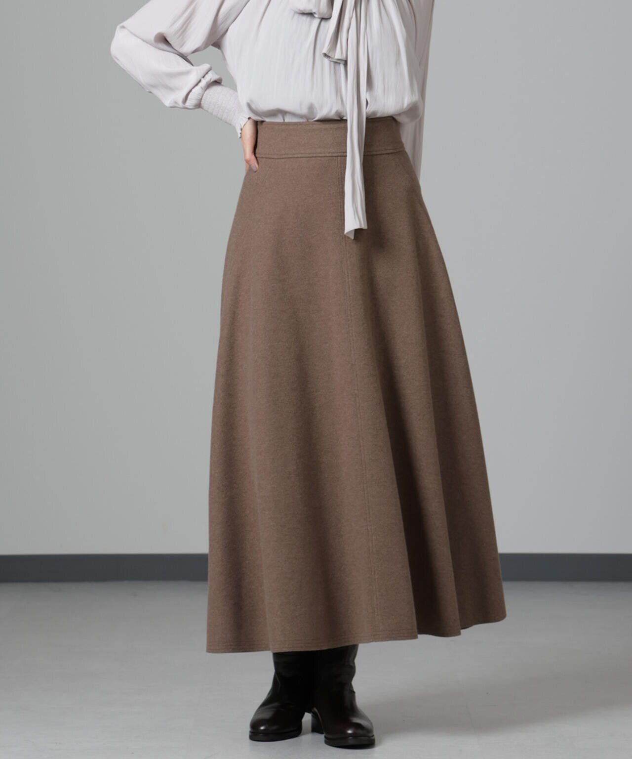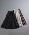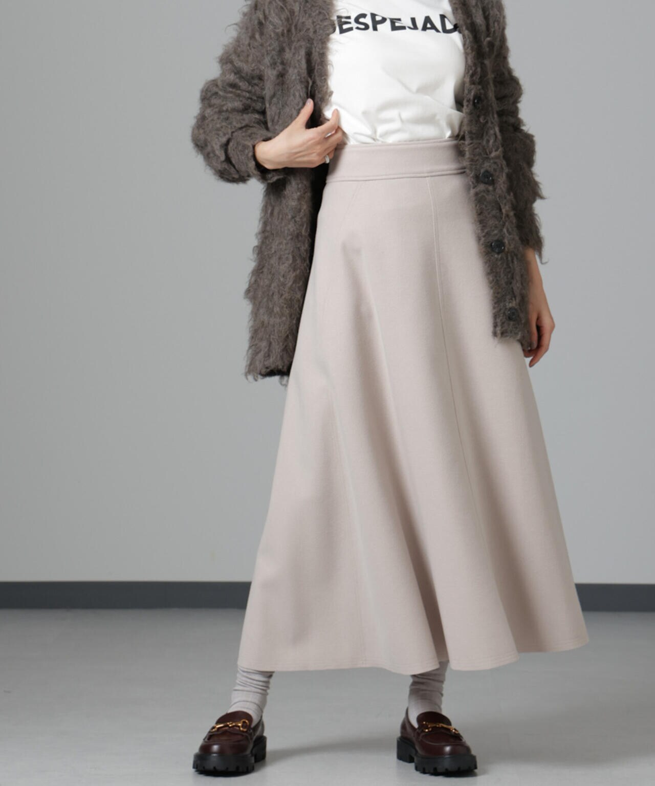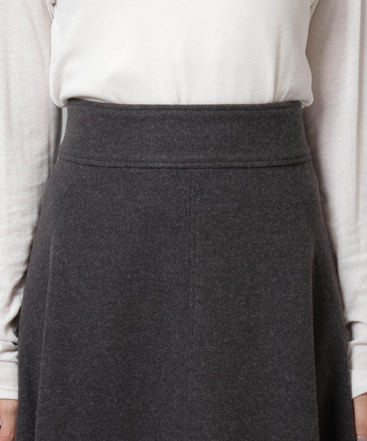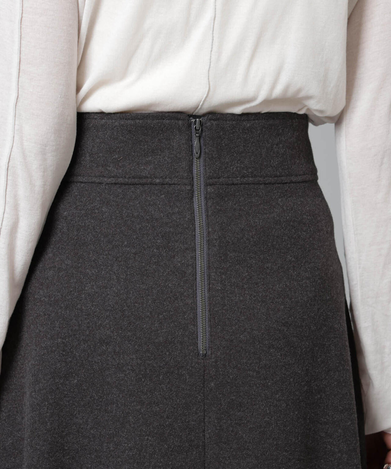腰回りからすそにかけて程よいすっきりとしたラインに仕上げの女性らしいフレアスカート。切り替えラインと裾は断ち切りにしているので、もたつかず裾の揺れ感が軽やかできれいなラインを作ってくれます。シンプルでどんなトップスにも合わせやすく、ワードローブに追加しておくと重宝しそう!