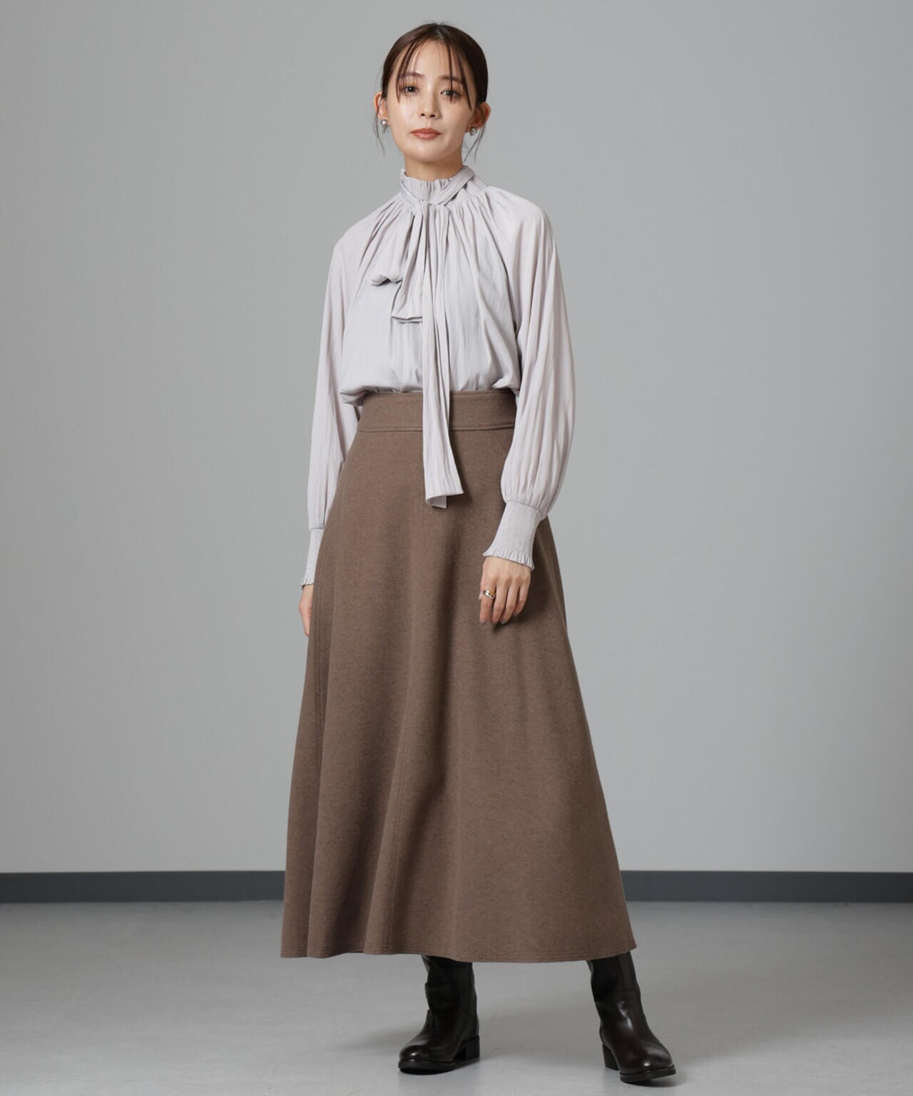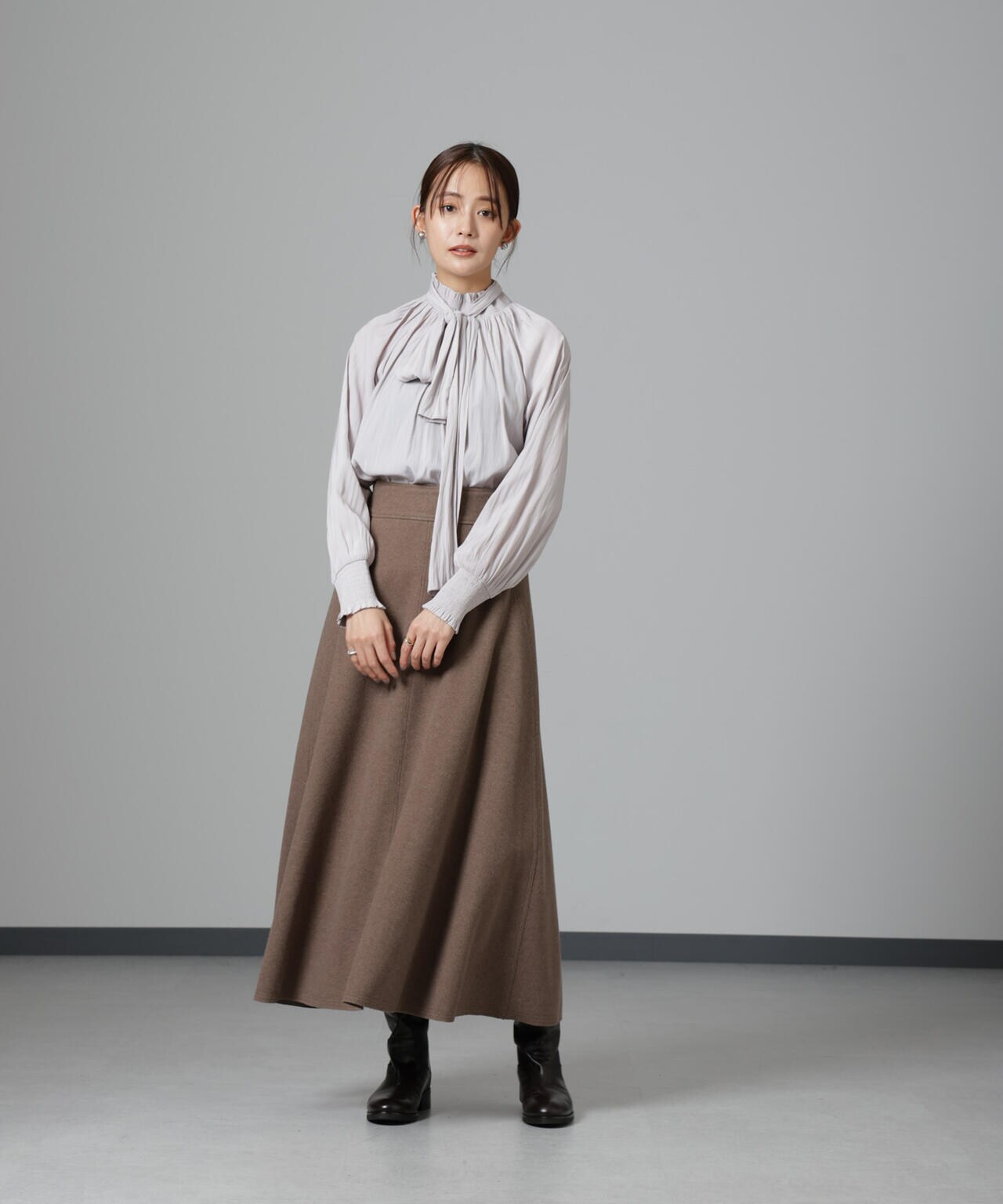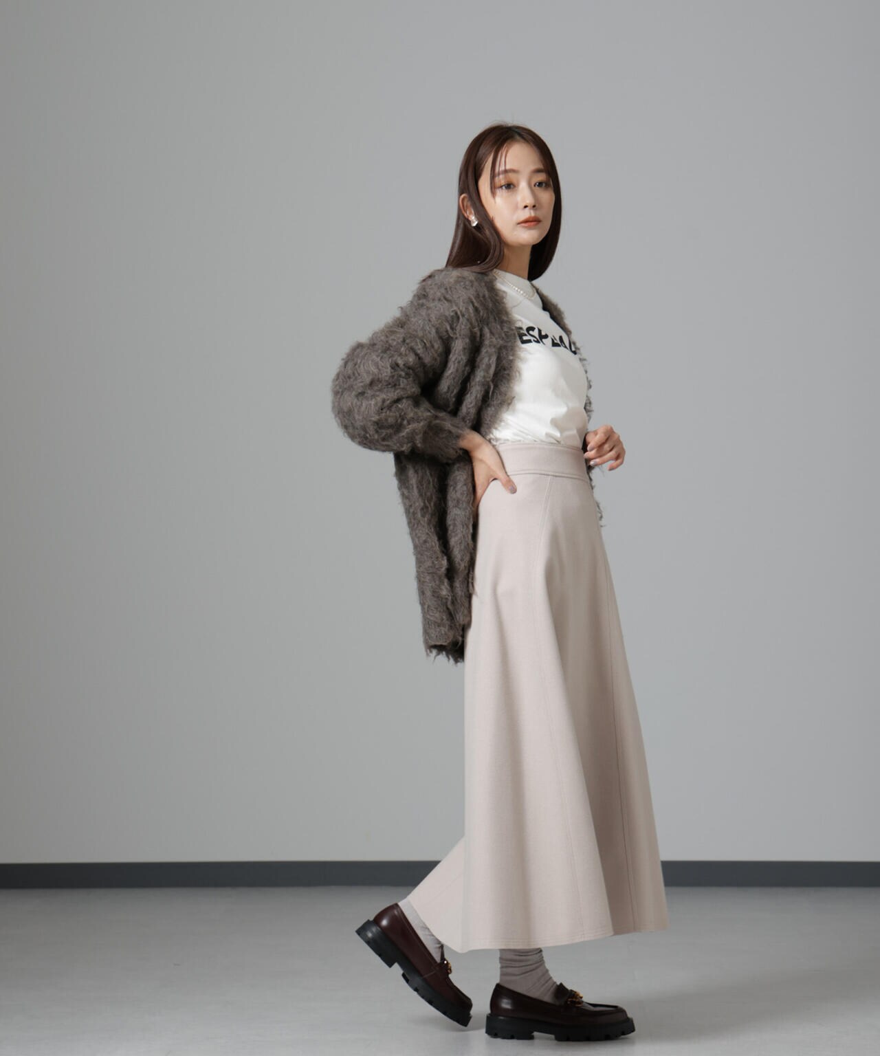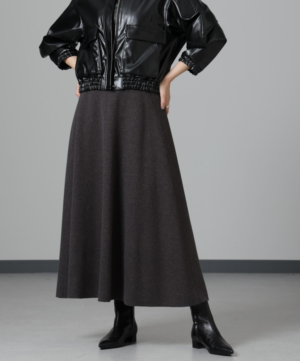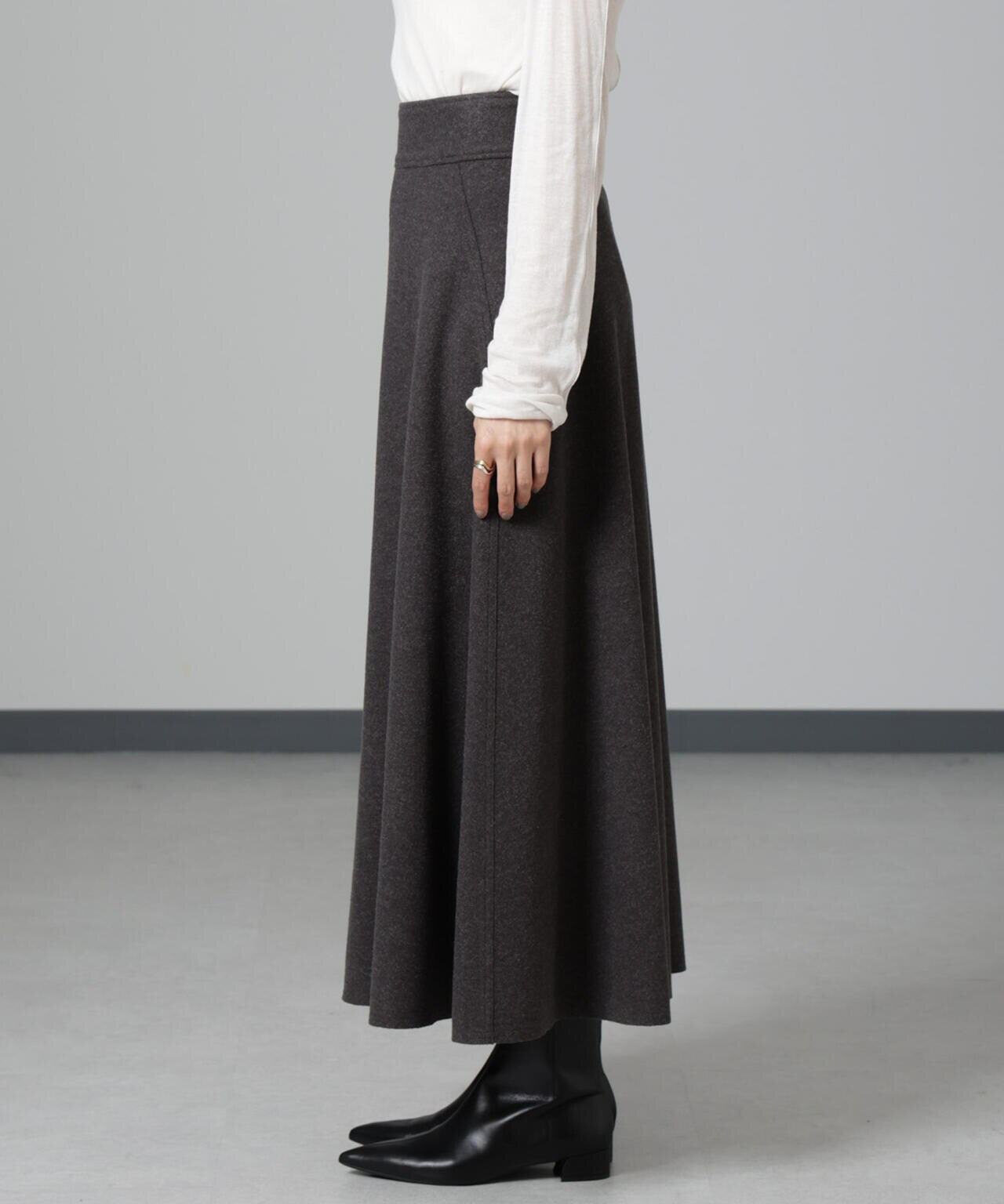 腰回りからすそにかけて程よいすっきりとしたラインに仕上げの女性らしいフレアスカート。切り替えラインと裾は断ち切りにしているので、もたつかず裾の揺れ感が軽やかできれいなラインを作ってくれます。シンプルでどんなトップスにも合わせやすく、ワードローブに追加しておくと重宝しそう!