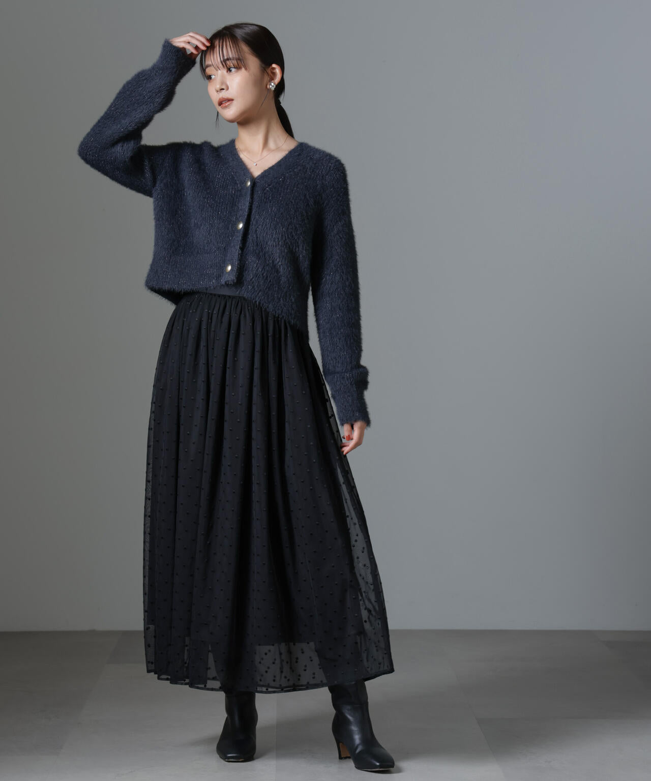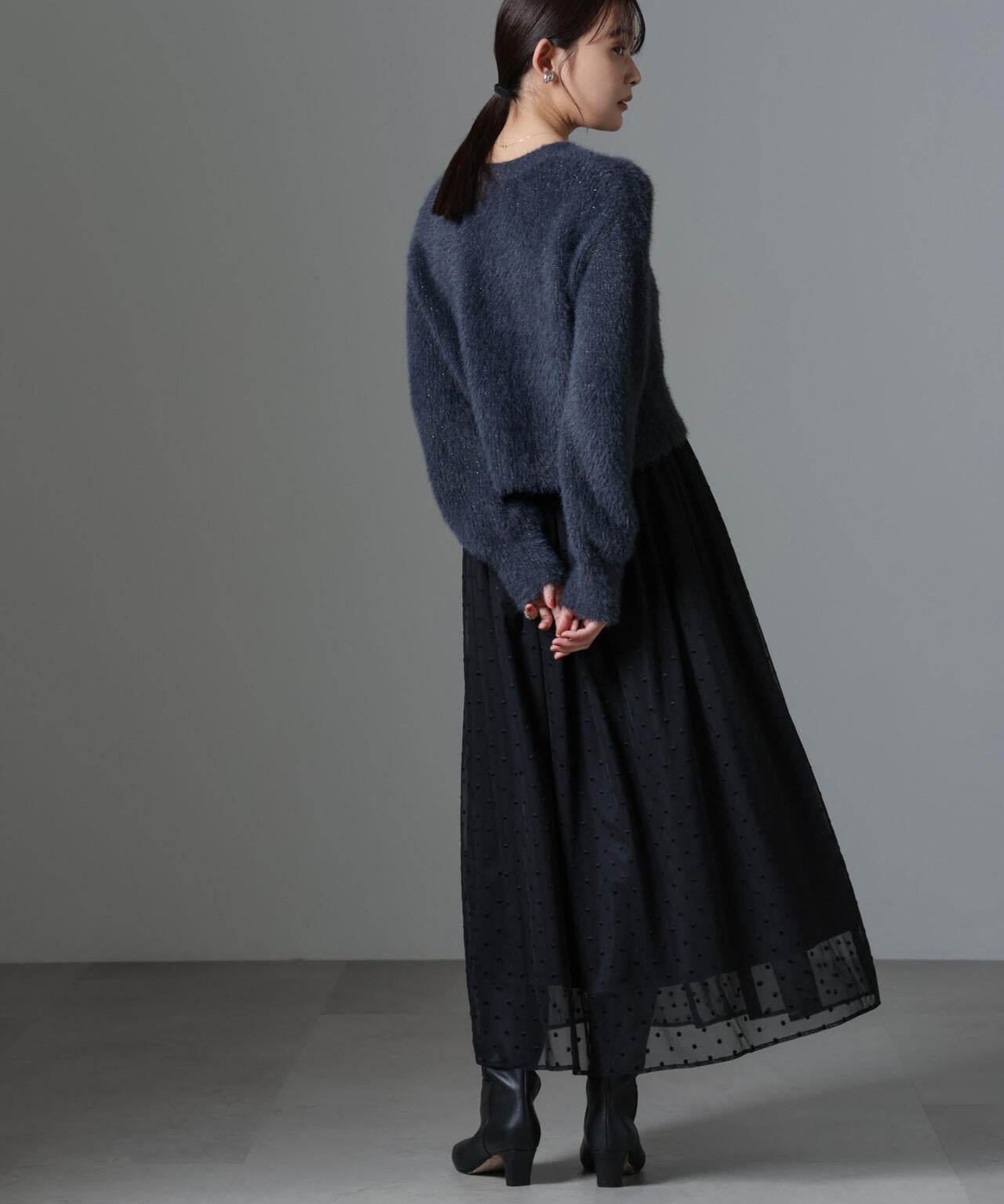 ・毛足のあるニットを合わせてデイリーの着回しにもおすすめ