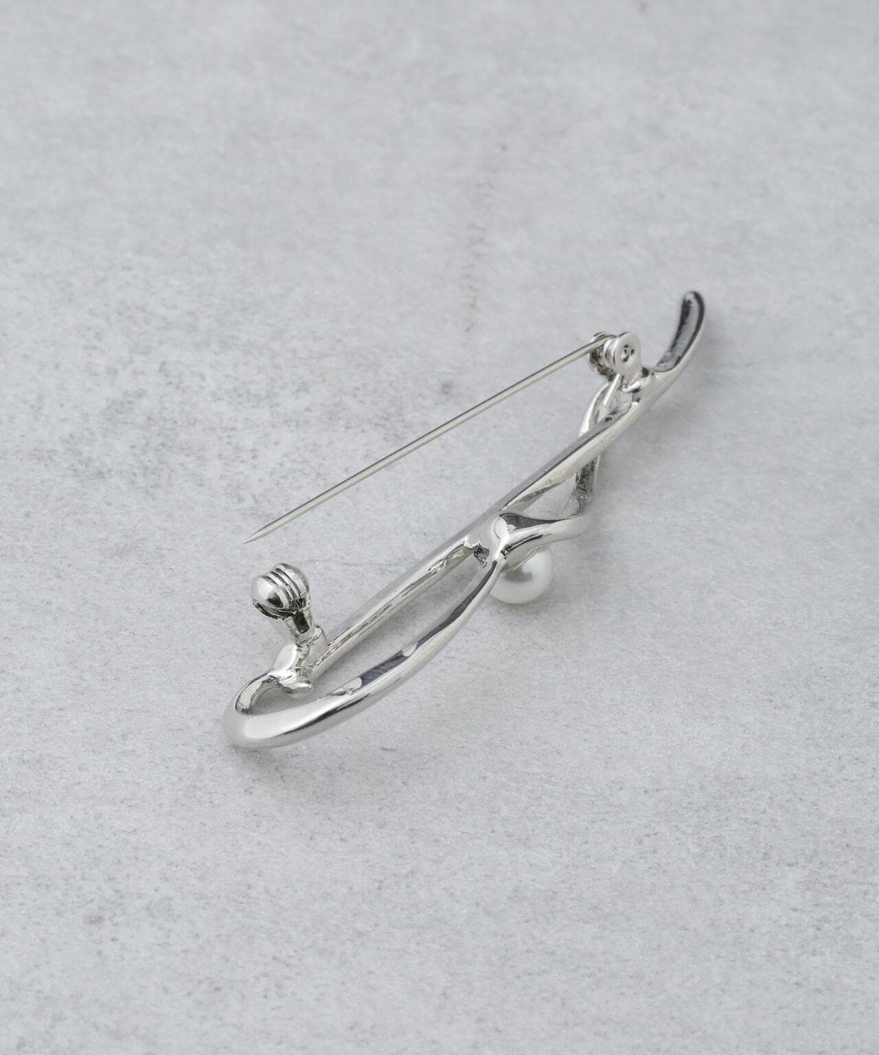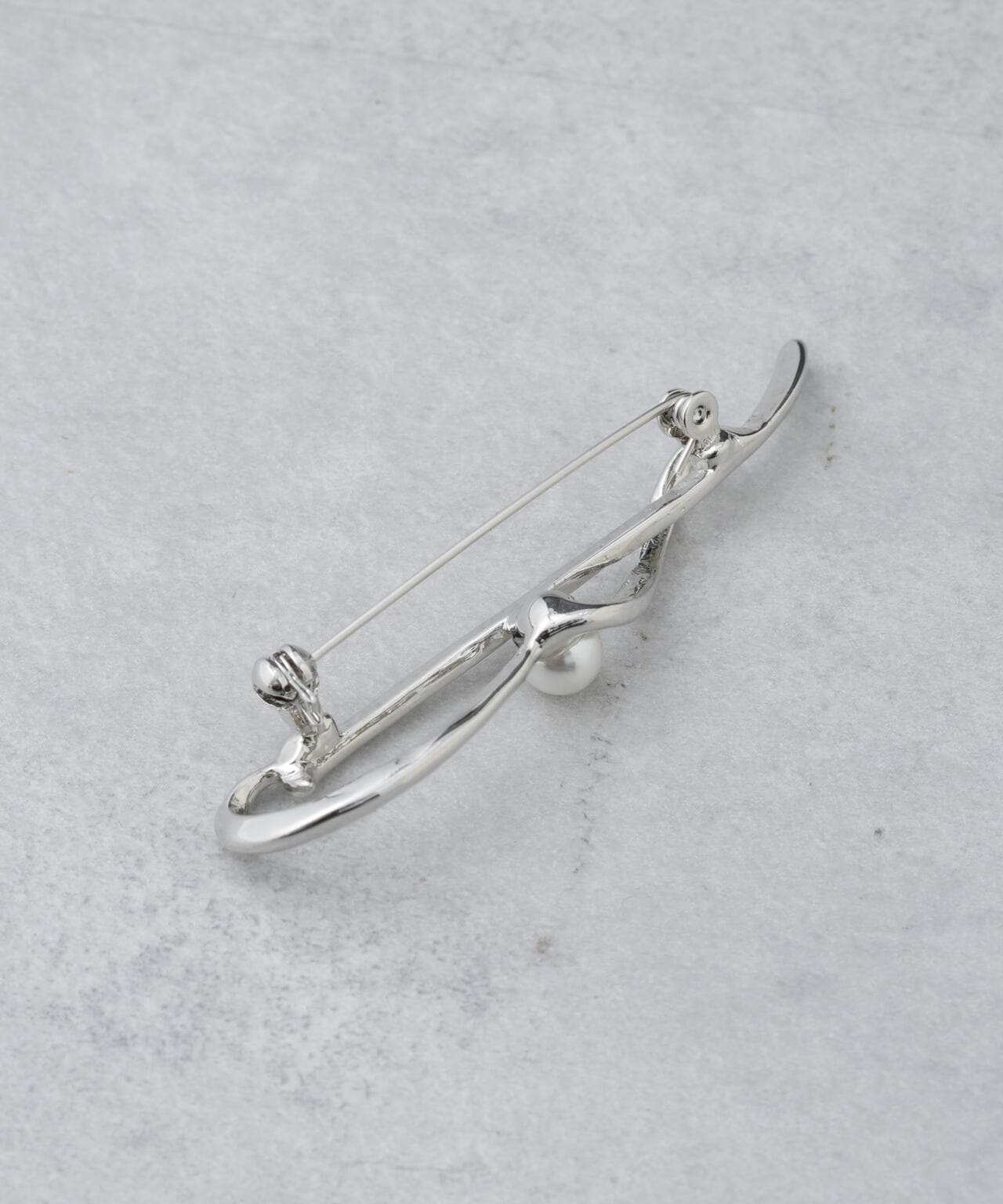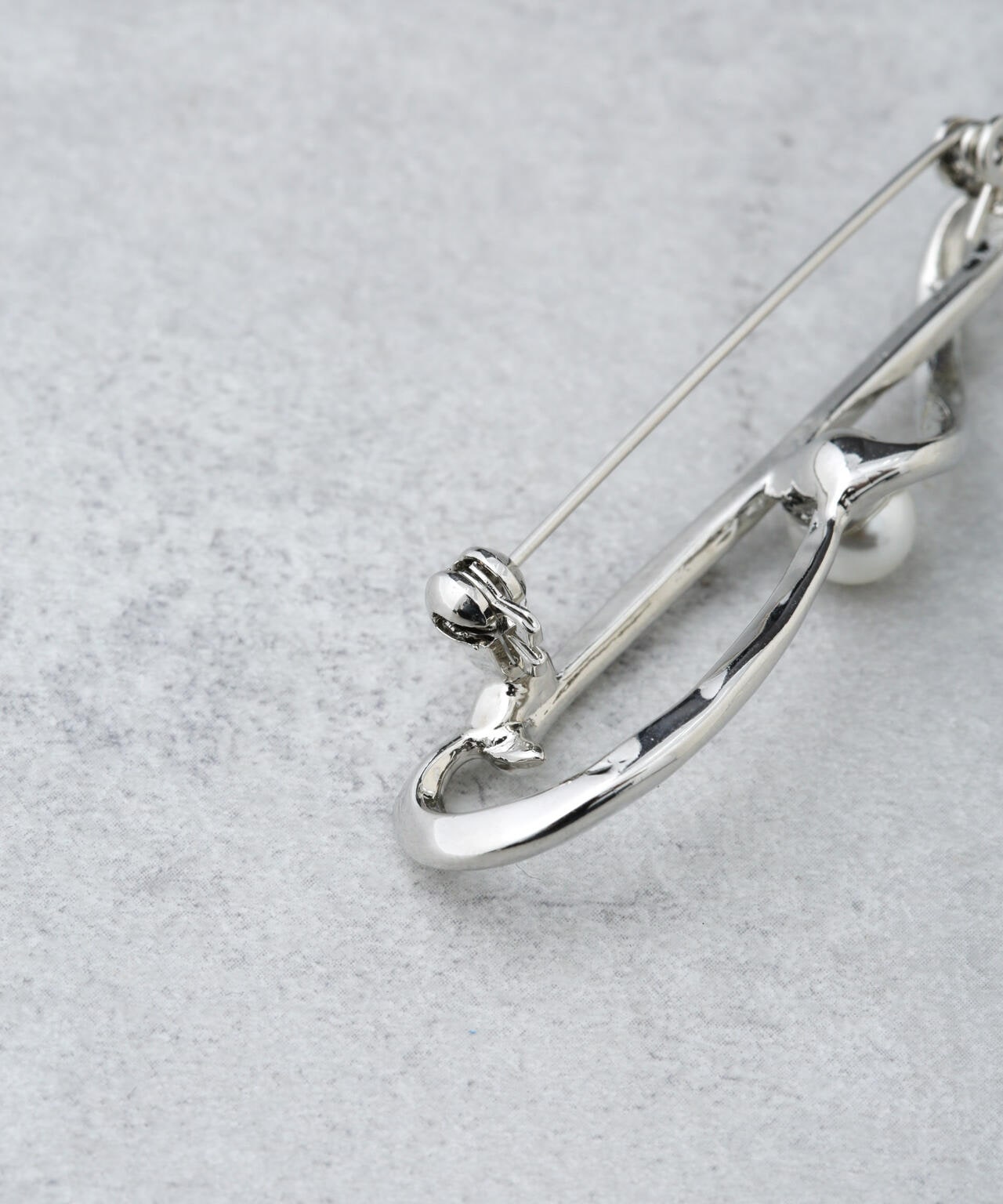 音符のようなカーブが目を引く上品なブローチ。柔らかな印象のカーブと1つだけポイントに付けた小さなパールデザインに◎メッキはあえてシルバーにすることで、大人っぽい印象に仕上げました。オケージョンシーンだけではなく、デイリーにジャケットやシャツなどトップスに付けて着て頂くと素敵です!