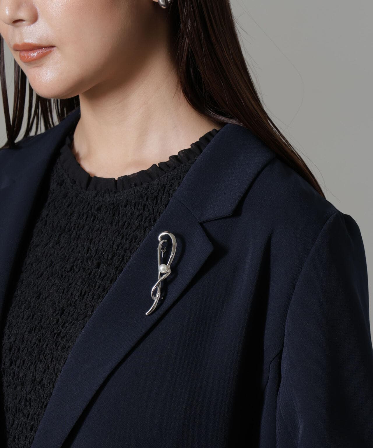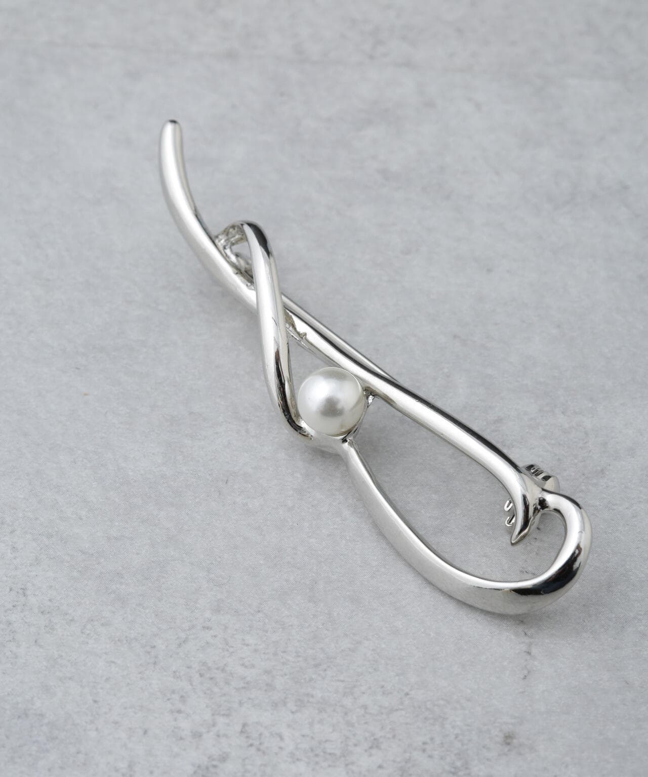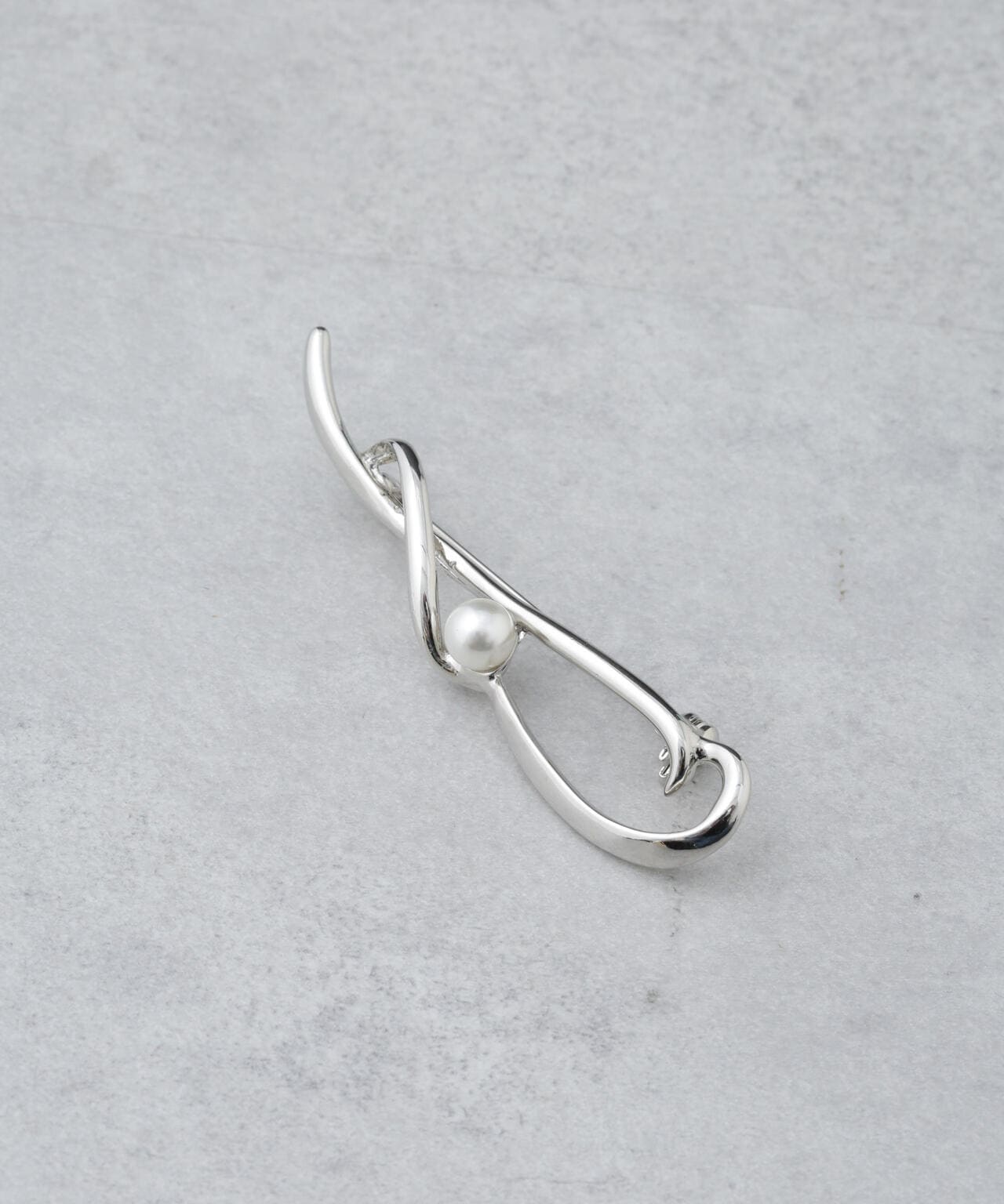 音符のようなカーブが目を引く上品なブローチ。柔らかな印象のカーブと1つだけポイントに付けた小さなパールデザインに◎メッキはあえてシルバーにすることで、大人っぽい印象に仕上げました。オケージョンシーンだけではなく、デイリーにジャケットやシャツなどトップスに付けて着て頂くと素敵です!