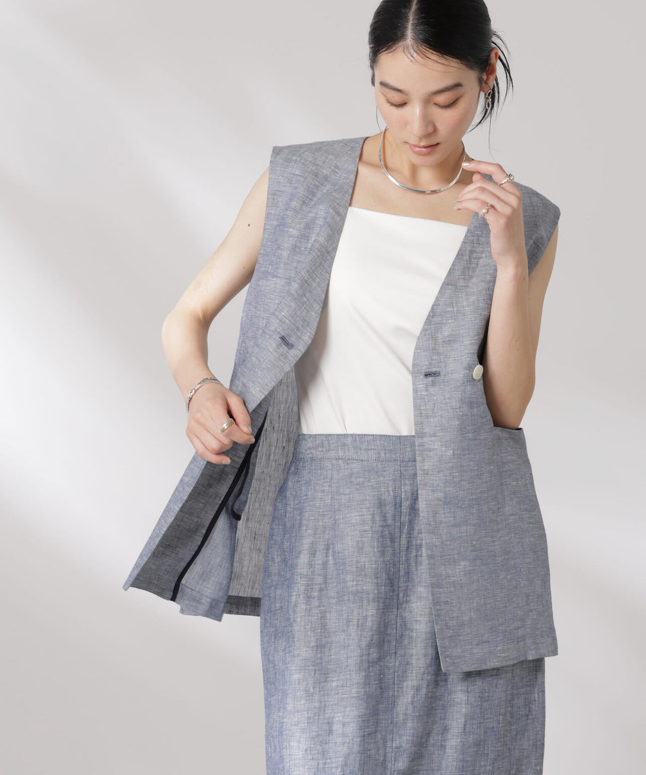 清涼感のあるリネン素材で仕立てたジレ。シャツやロンTとレイヤードしたり、ブラウス感覚で一枚で着たりとシーズンや気温に合わせてスタイリングを楽しめる一着です。