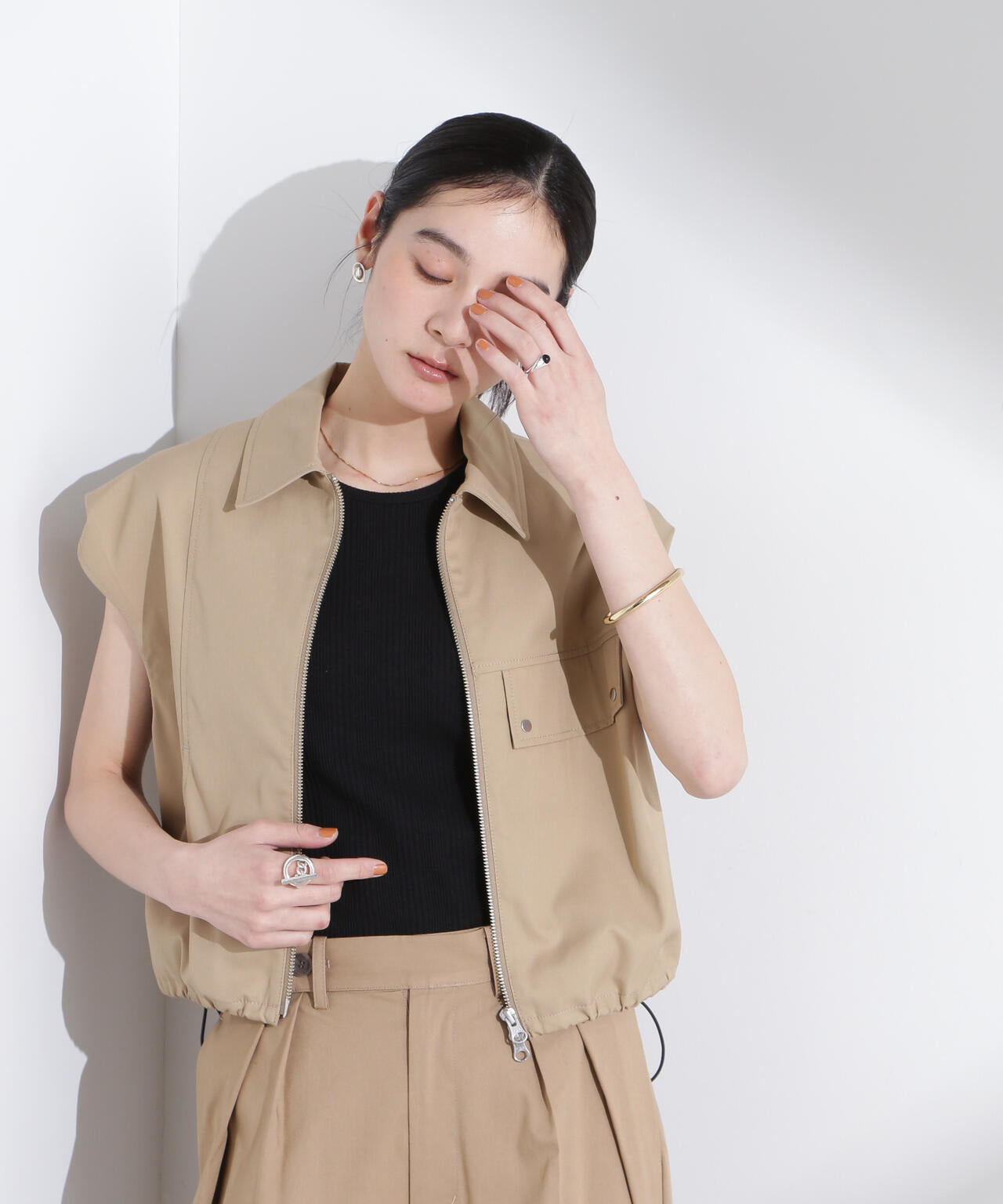 トレンチ素材を使用したトレンド感のあるワークテイストのベスト。コンパクトながらも程よくゆとりがある身頃と、肩まで隠れる長さのスリーブですっきりとした印象にまとまったアイテム。コンパクトなクロップ丈でスタイルアップ効果が期待できる一枚です。