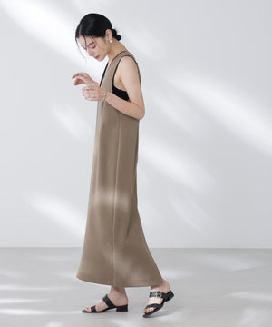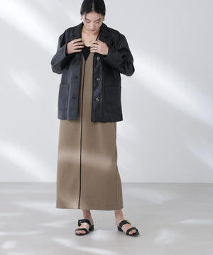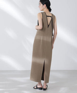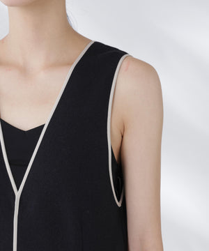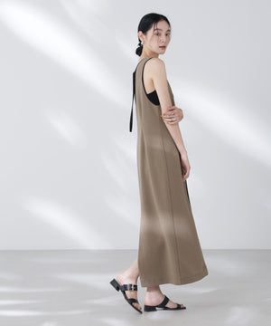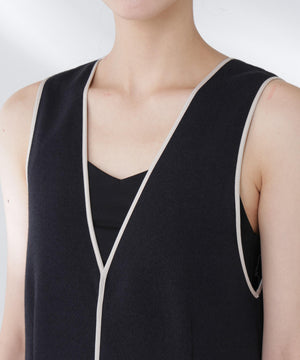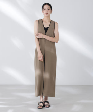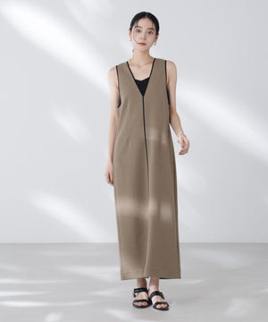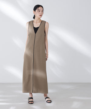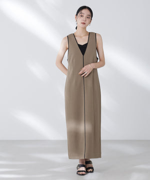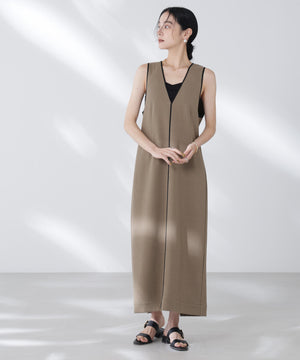 配色パイピングの効いたジャンパースカート型のブークレワンピース。前後深Vネックや背中に垂れるデザインベルトなど、夏に一枚で着た際もサマになるアイテムです。