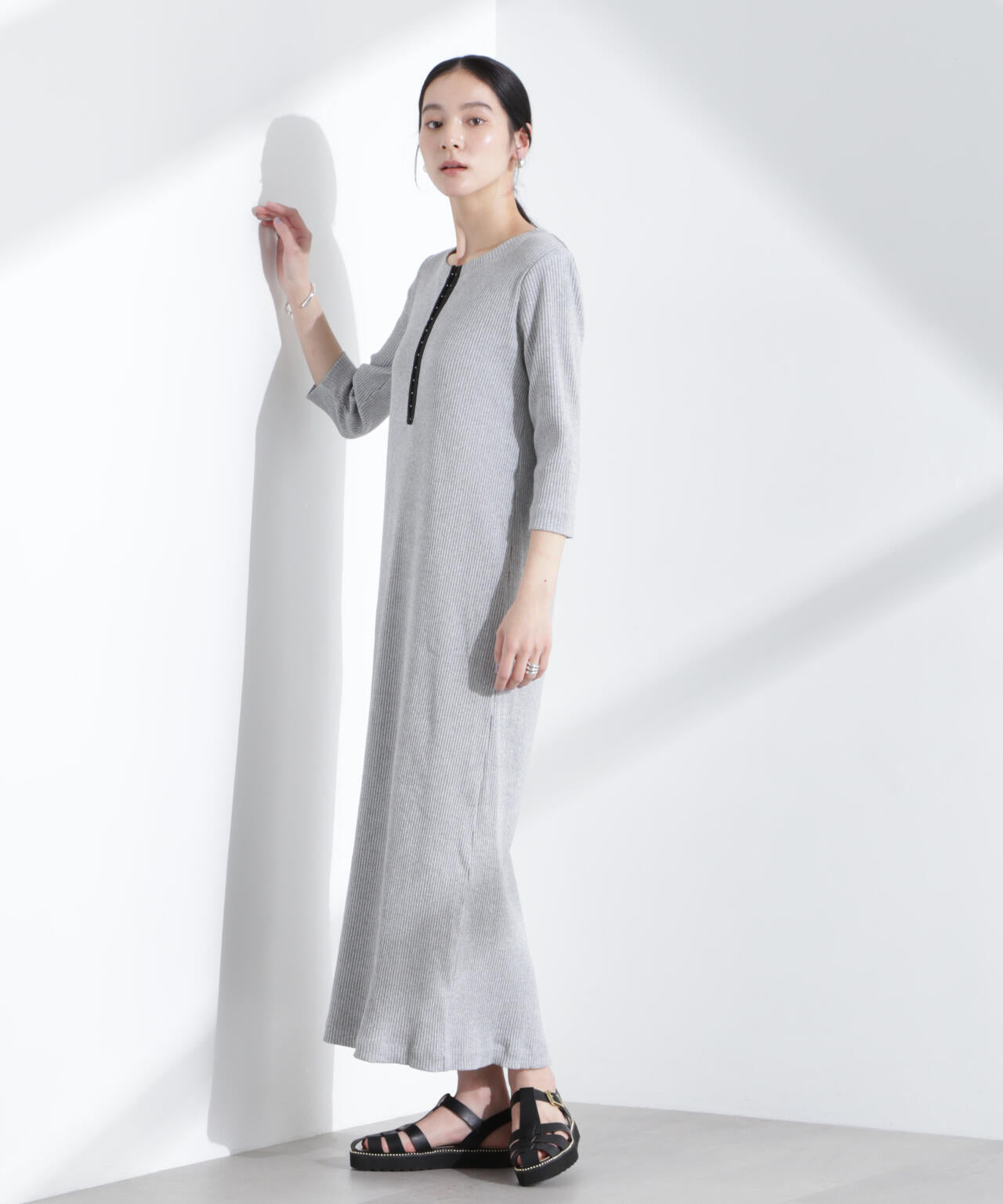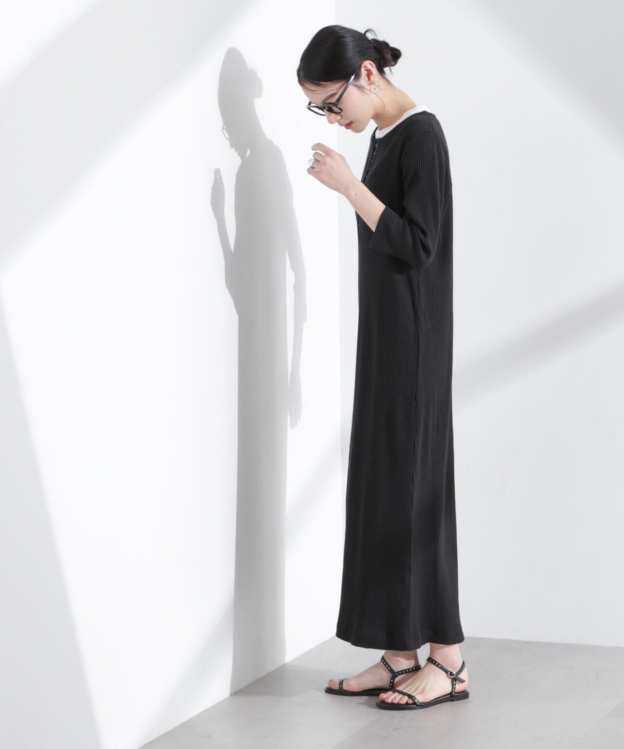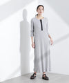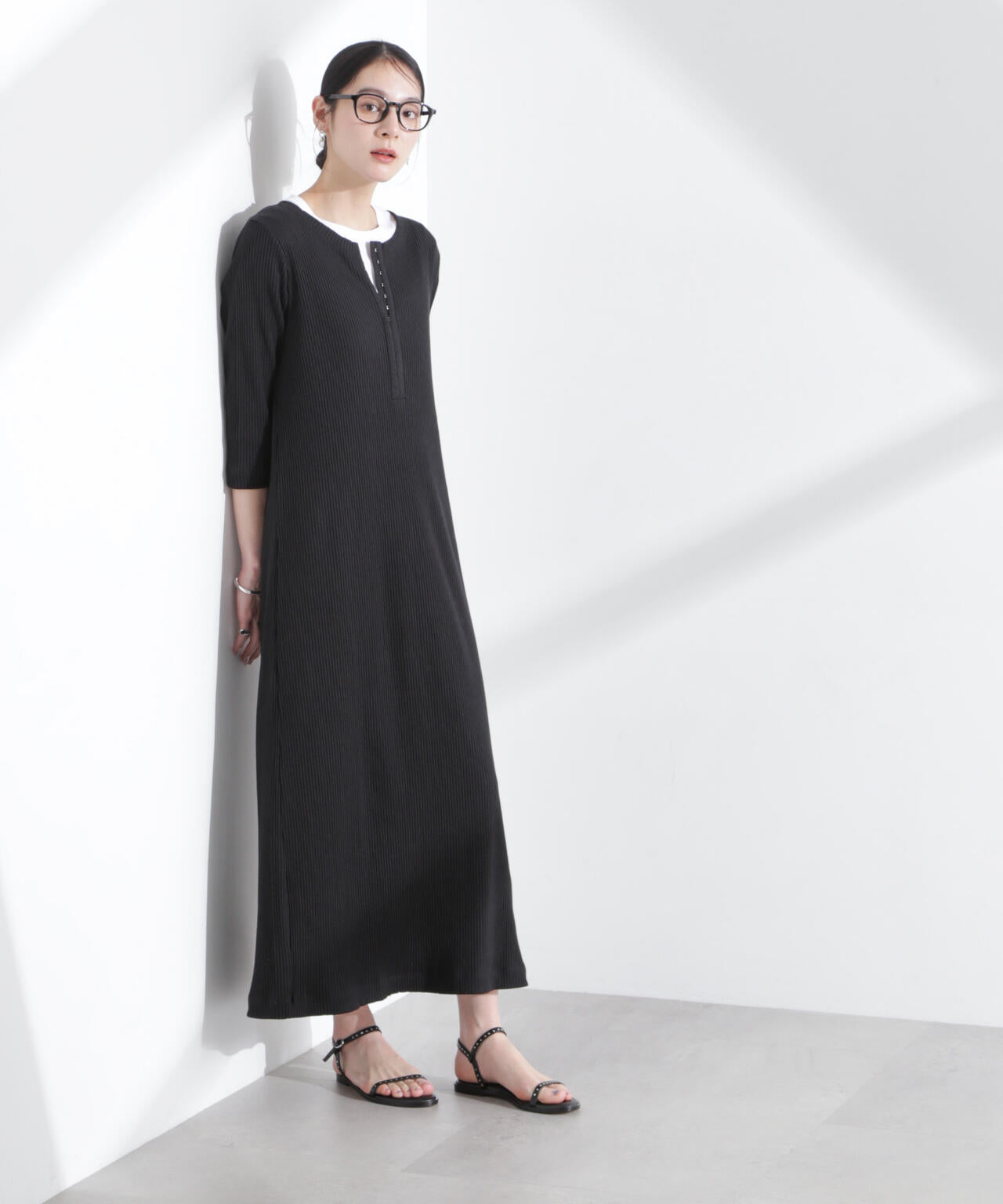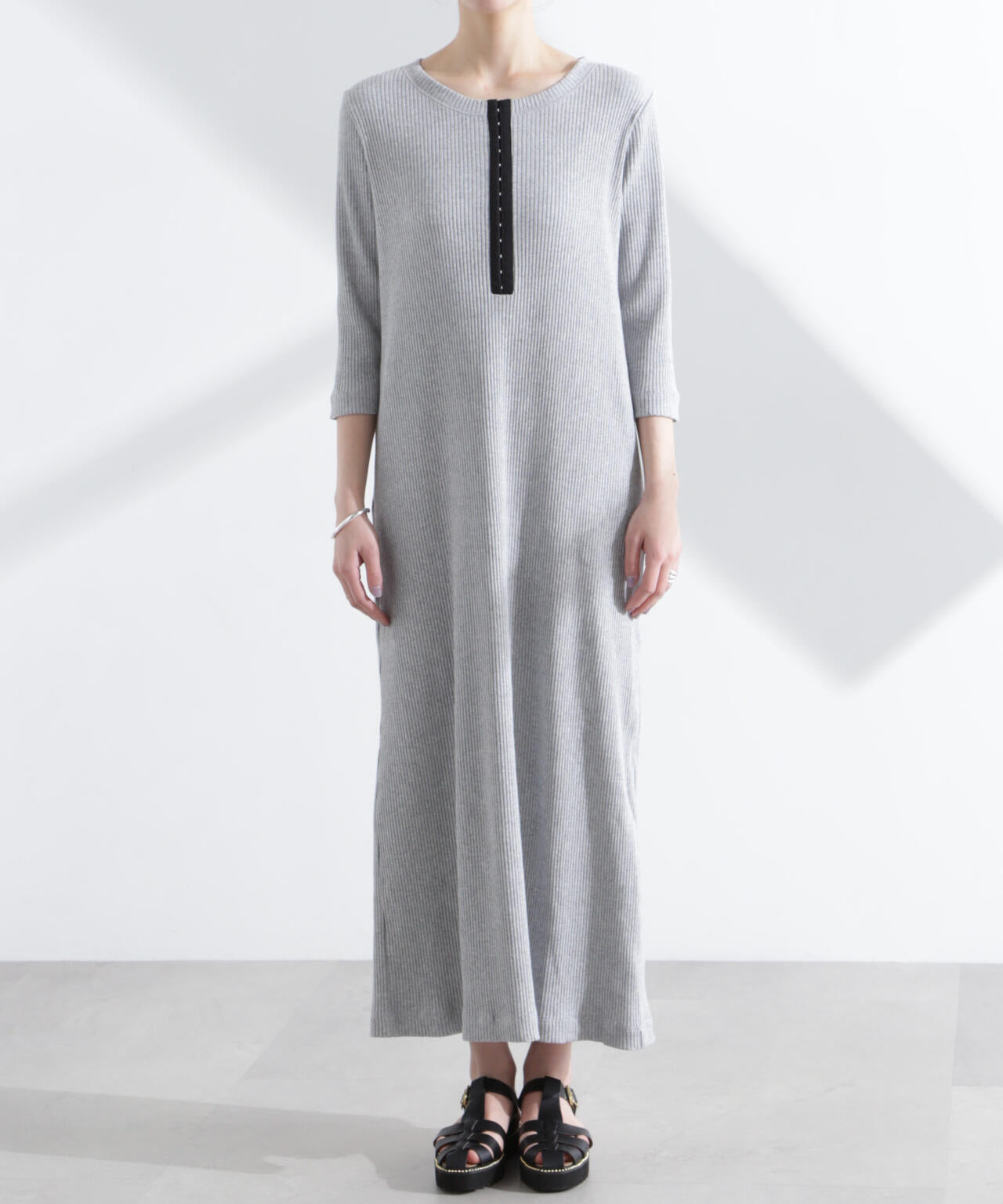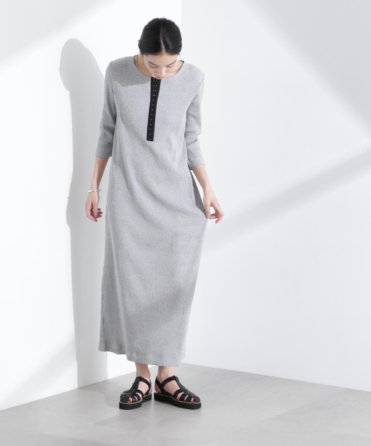 端境期に重宝する五分袖丈のカジュアルカットソーワンピース。トレンド感のあるフロントのホックテープをポイントに、マキシ丈の縦長シルエットが大人見えする一着です。