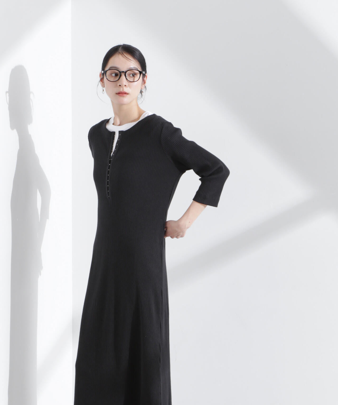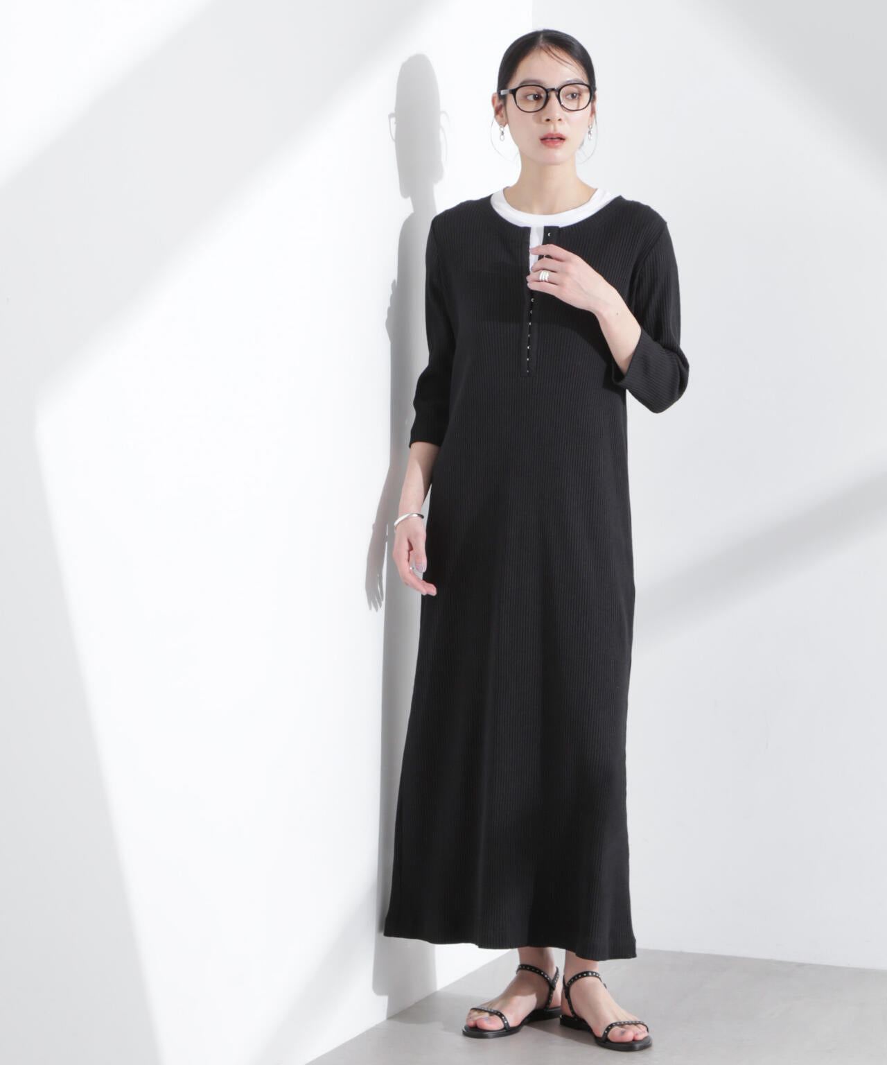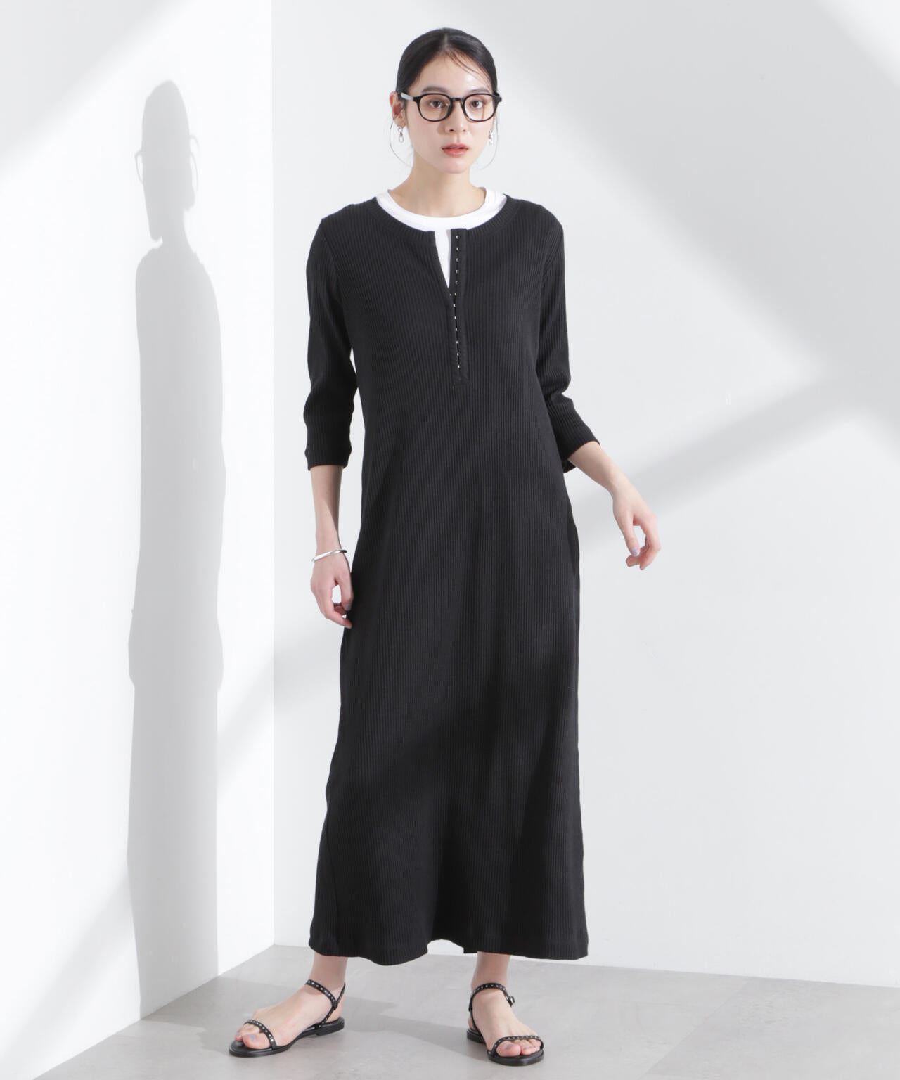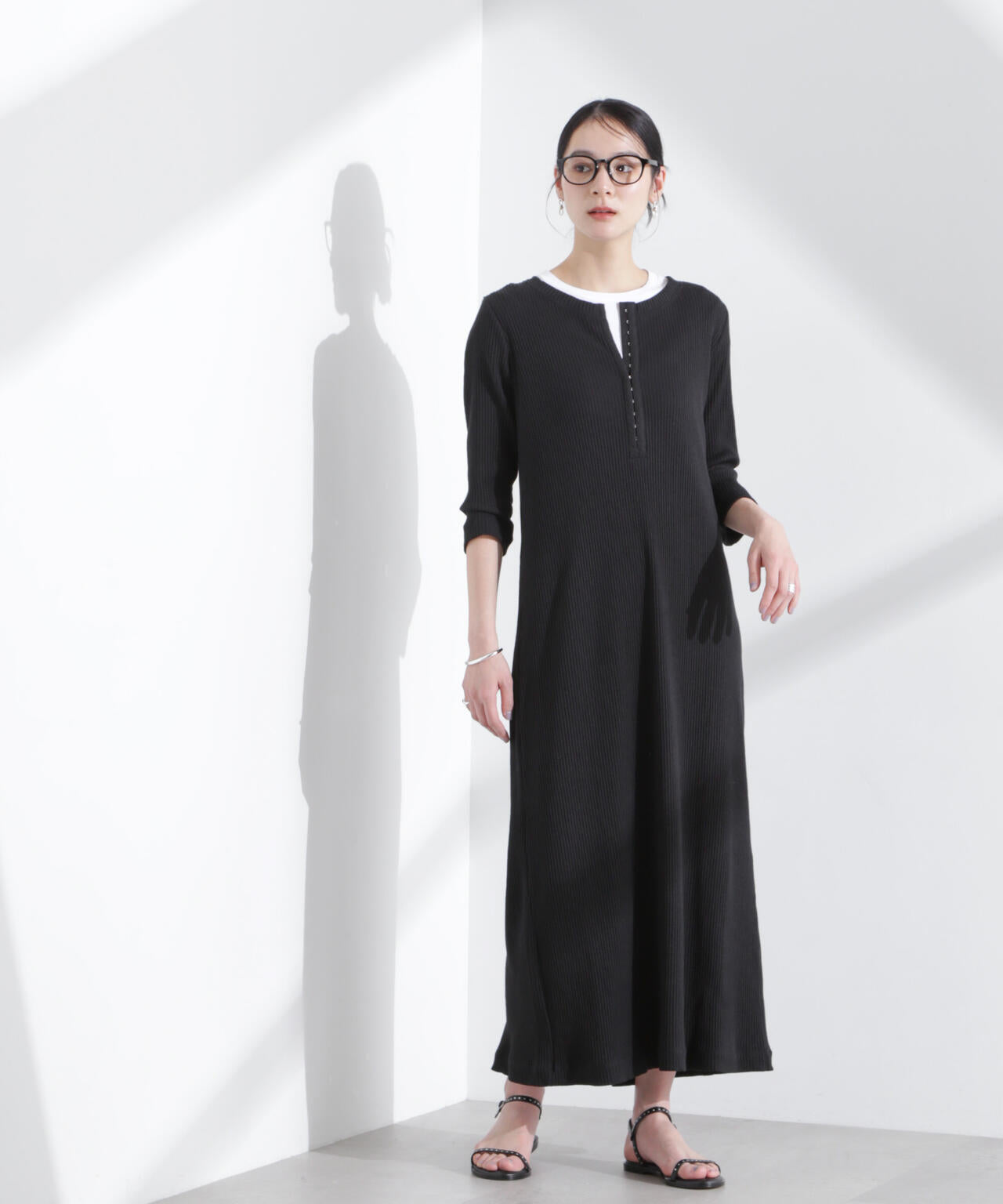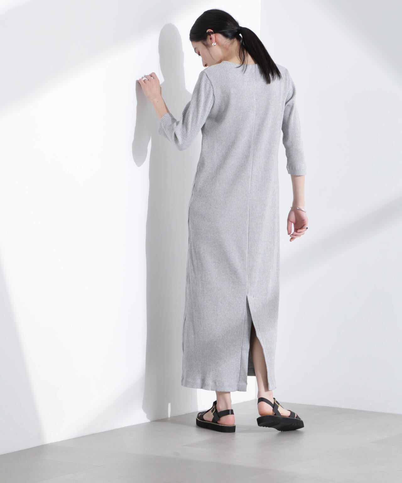 端境期に重宝する五分袖丈のカジュアルカットソーワンピース。トレンド感のあるフロントのホックテープをポイントに、マキシ丈の縦長シルエットが大人見えする一着です。