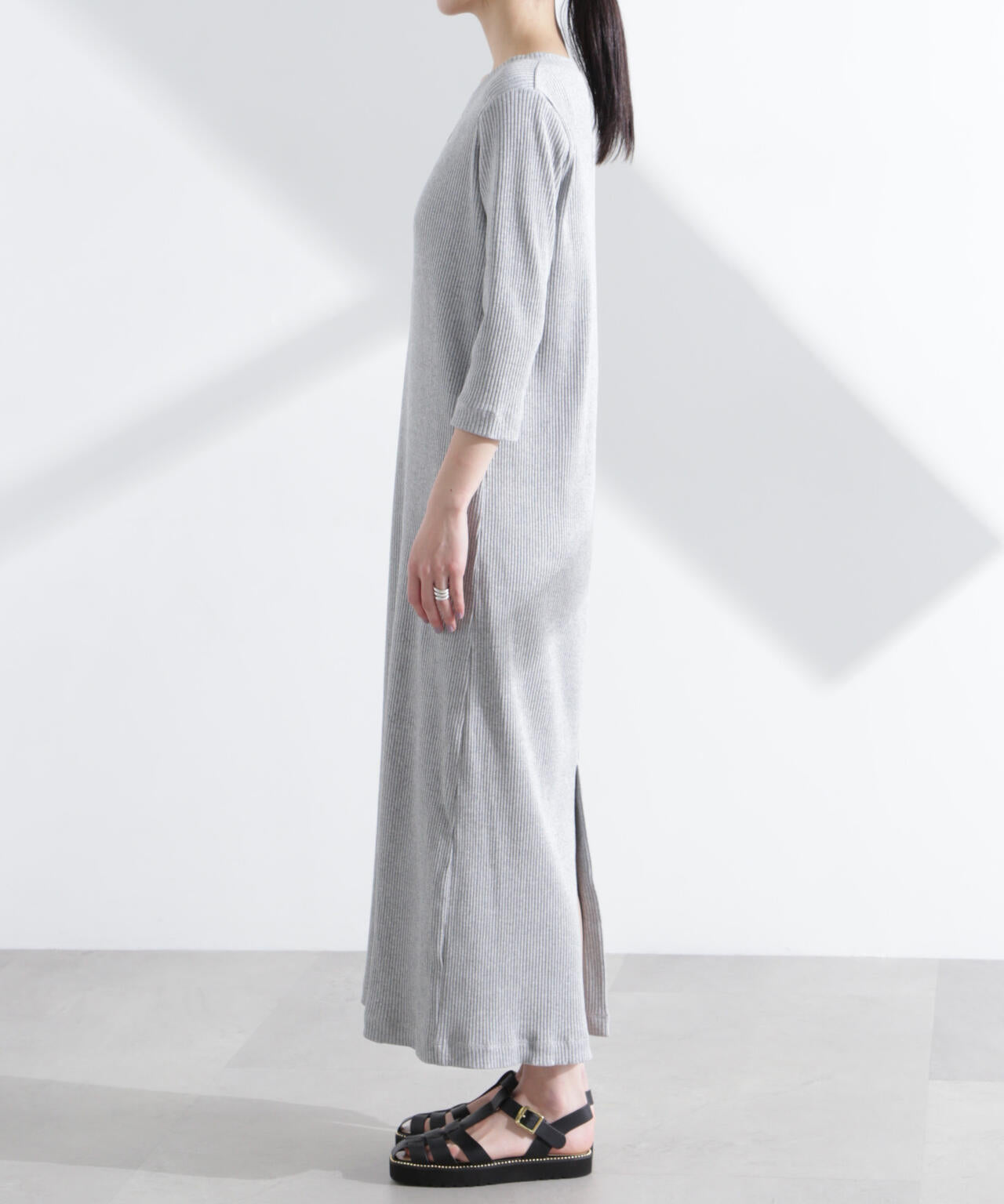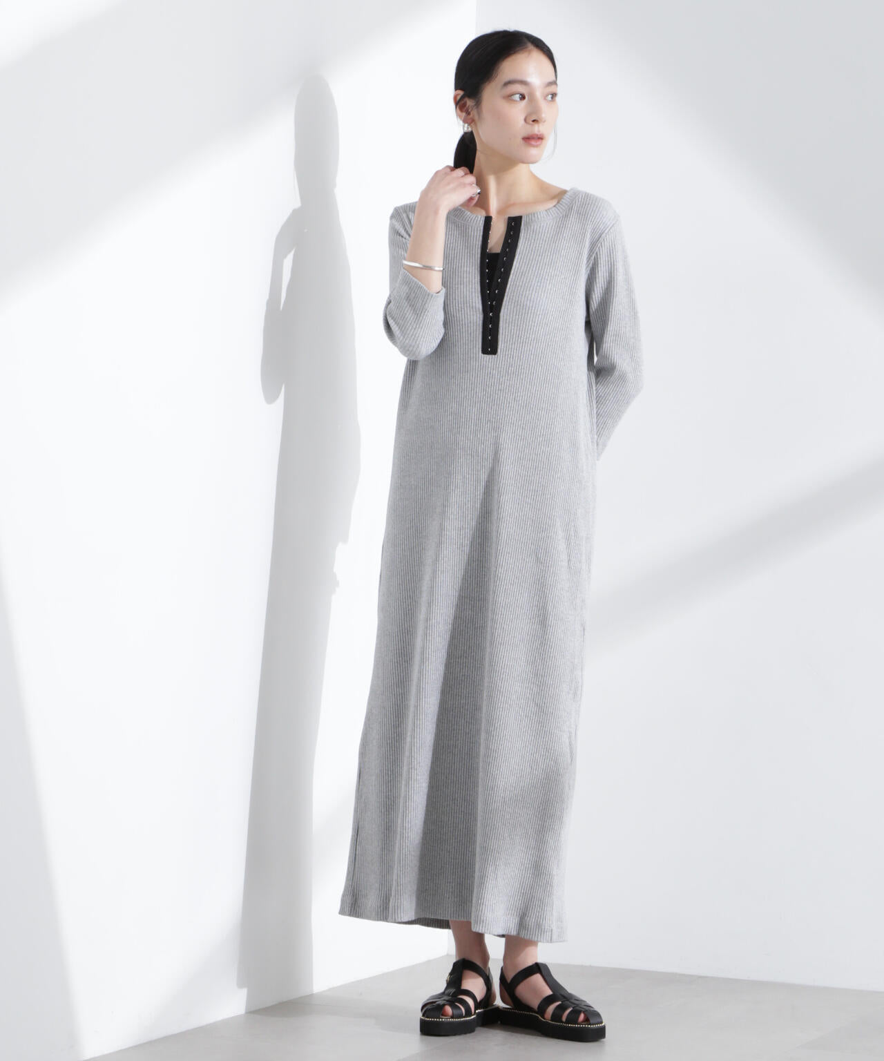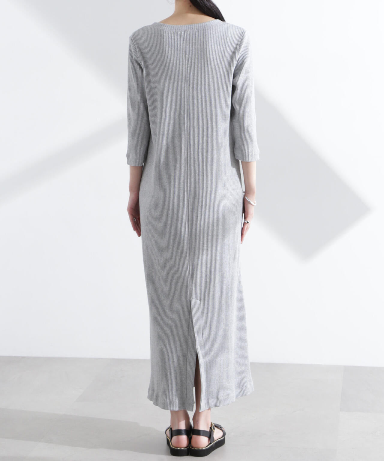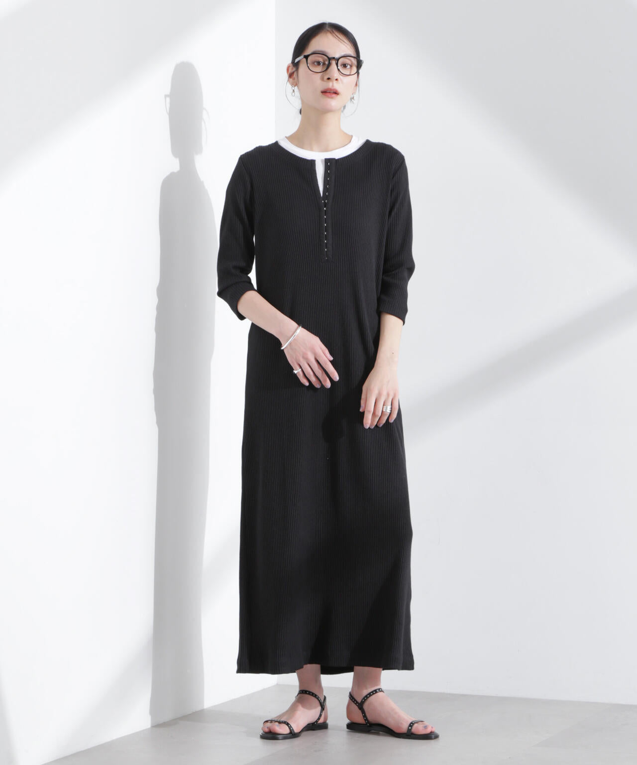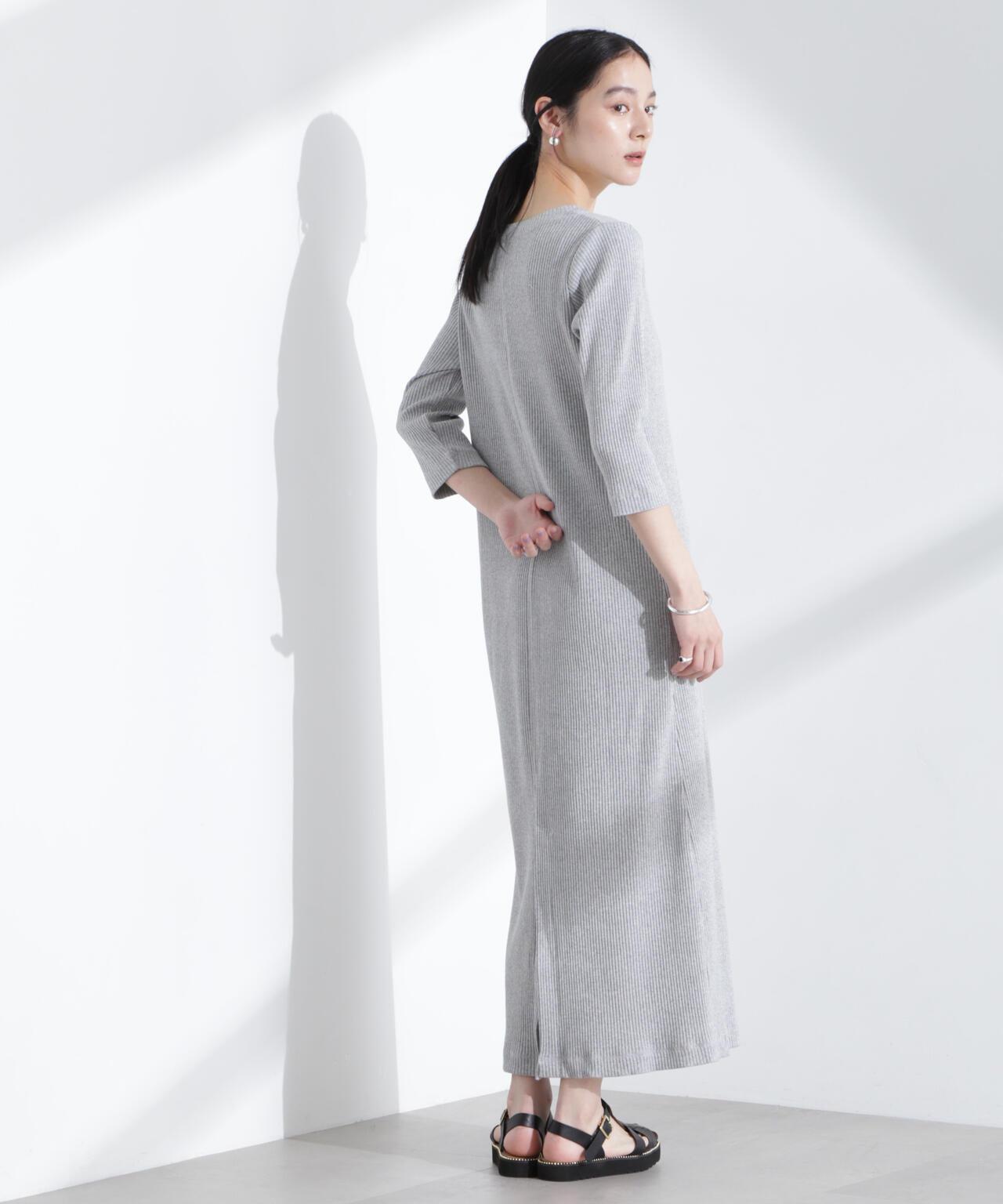 端境期に重宝する五分袖丈のカジュアルカットソーワンピース。トレンド感のあるフロントのホックテープをポイントに、マキシ丈の縦長シルエットが大人見えする一着です。