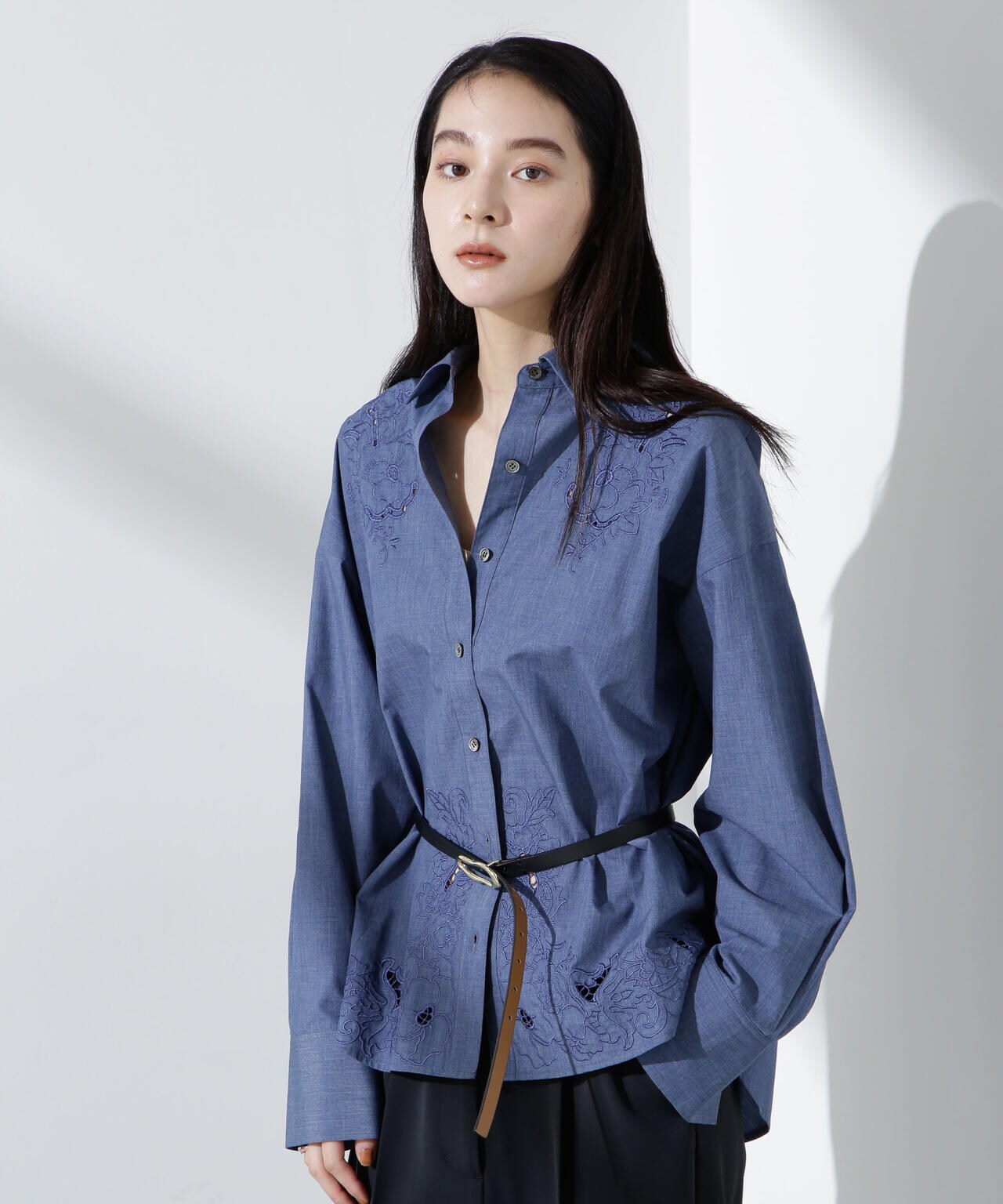 女性らしいレース柄刺しゅうを施したこだわったオーバーシャツ。刺しゅうは程よく光沢感のある糸を使用し、柄も大きめにすることで、華やかな上品な印象に。羽織にしたり、タックインで着用したりと気温差に激しい春に着回しの効く一枚です。