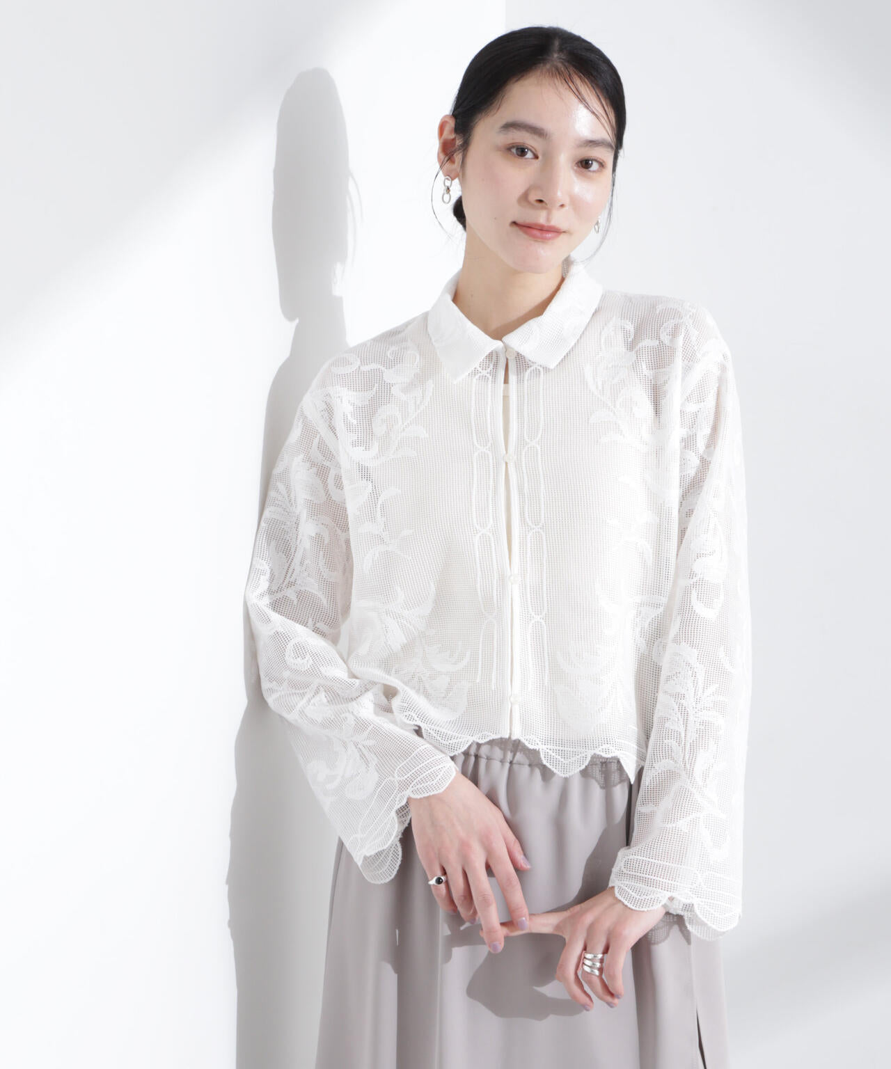 ビンテージ感が香る、ふっくらとした大ぶりの刺繍レース柄シャツ。スタイルアップ効果が期待できるトレンドのクロップド丈で、きちんと感があるのでON/OFFで重宝しそう。