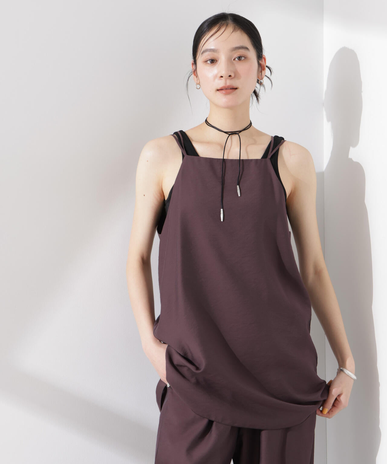 シアー素材がトレンド感のあるミディ丈のキャミソール。シンプルな一枚ながら、ダブルストラップと背中の深いVの開きが大人の女性らしさを演出。レイヤード次第で幅広いコーディネートを楽しめるのはもちろん、同素材展開のワイドパンツと合わせた抜け感のあるセットアップスタイルもおすすめです。