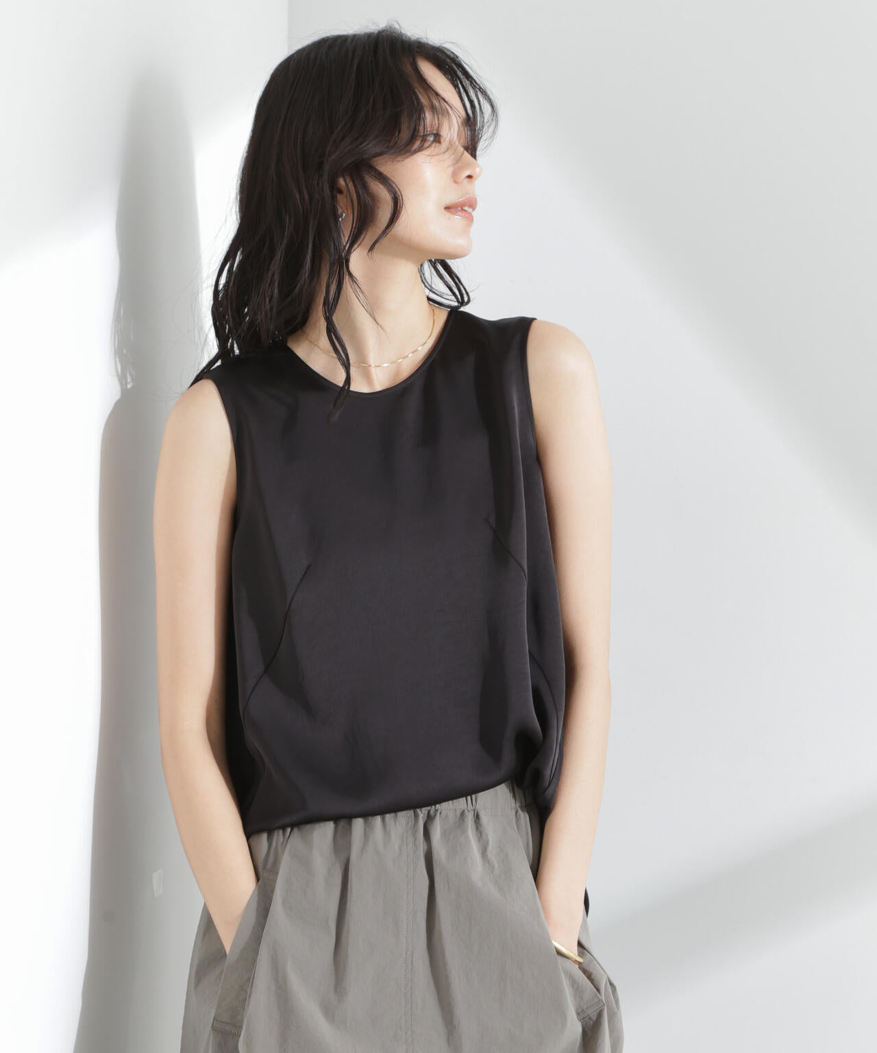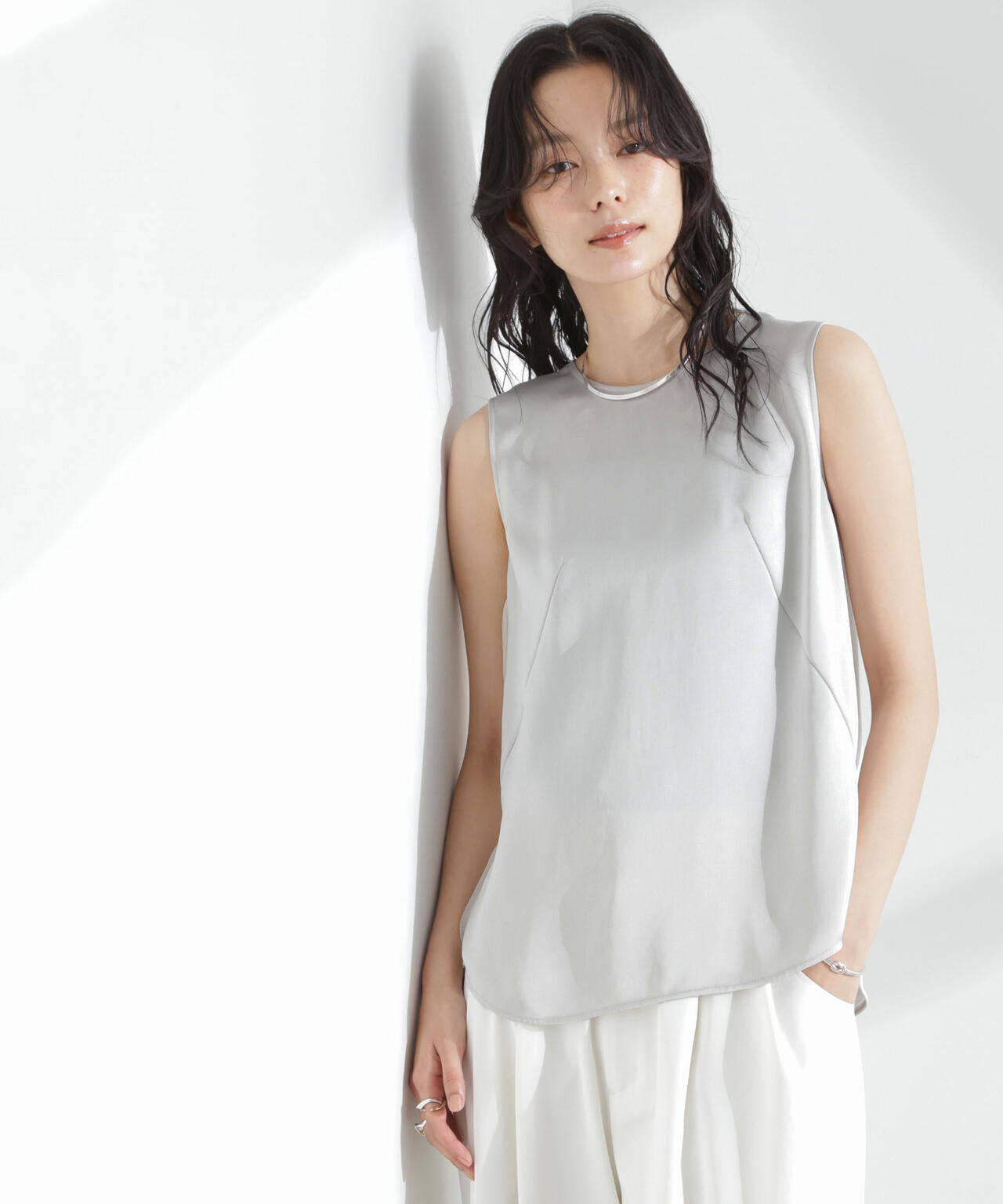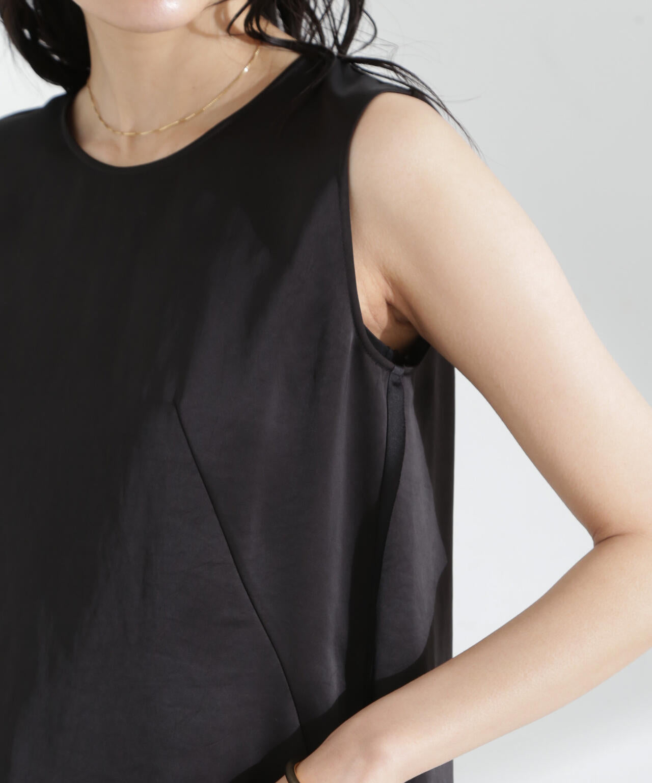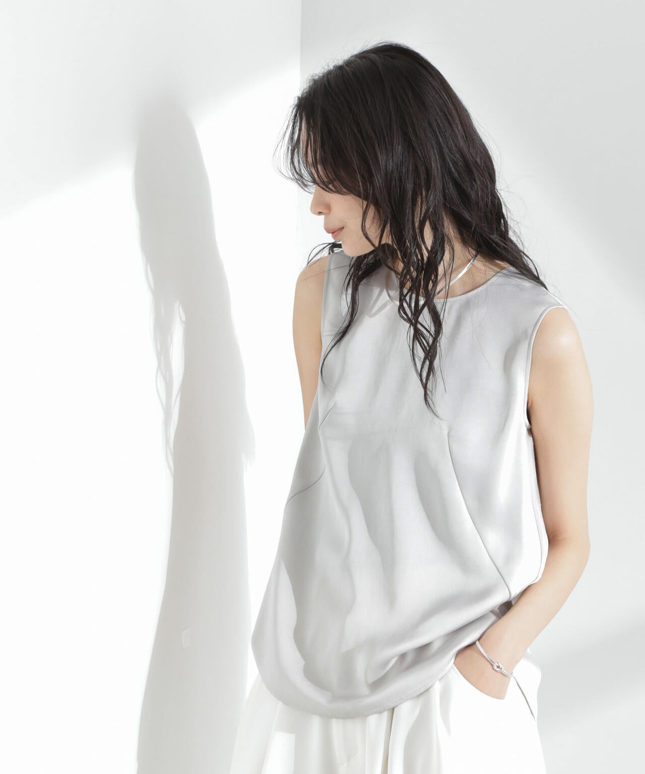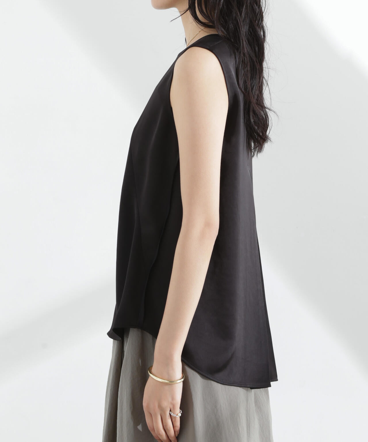 程良いヴィンテージ感とシルクのような風合いが魅力のダブルサテンで仕立てたノースリーブトップス。カットオフの別布を挟み込んだサイドや、シンプルなルックスに映える特徴的なダーツの斜めラインがポイント。どんなスタイリングにも合わせやすい一着です。