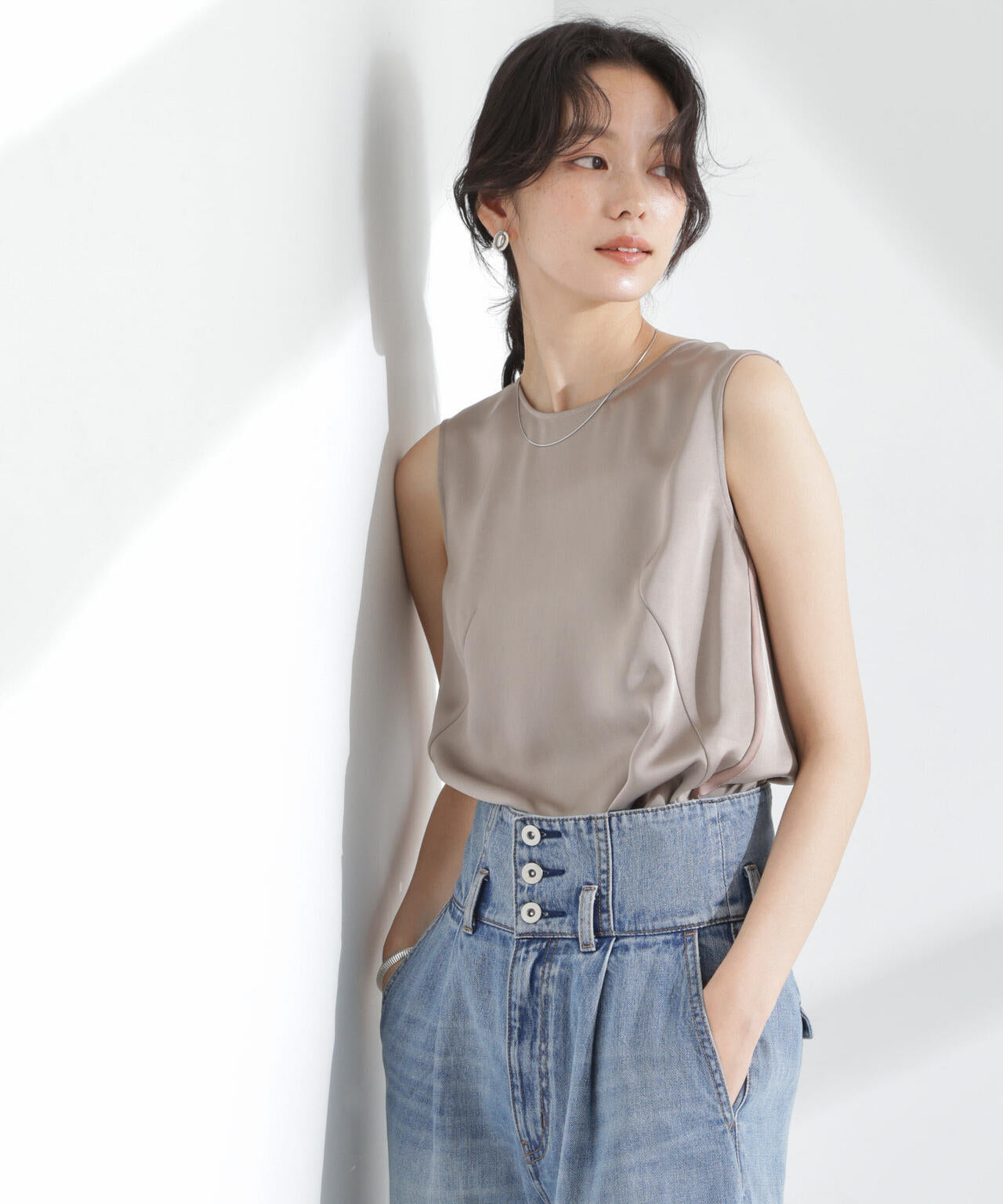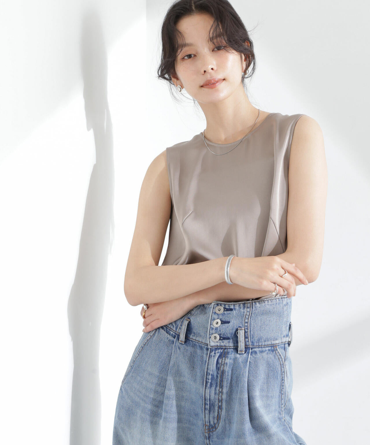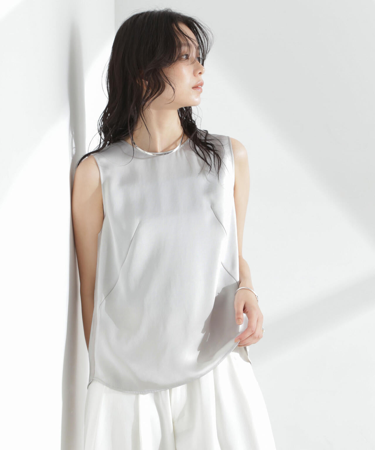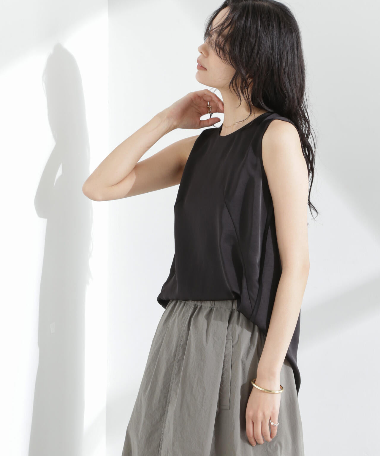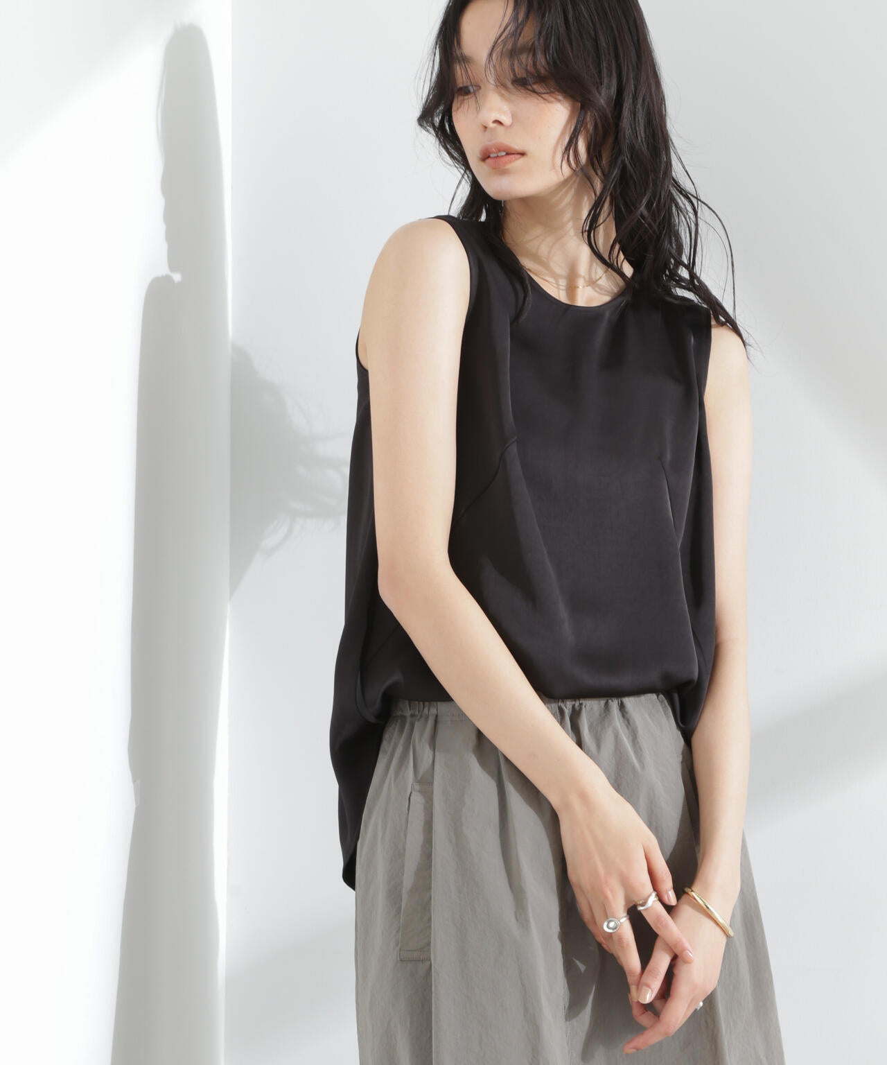 程良いヴィンテージ感とシルクのような風合いが魅力のダブルサテンで仕立てたノースリーブトップス。カットオフの別布を挟み込んだサイドや、シンプルなルックスに映える特徴的なダーツの斜めラインがポイント。どんなスタイリングにも合わせやすい一着です。
