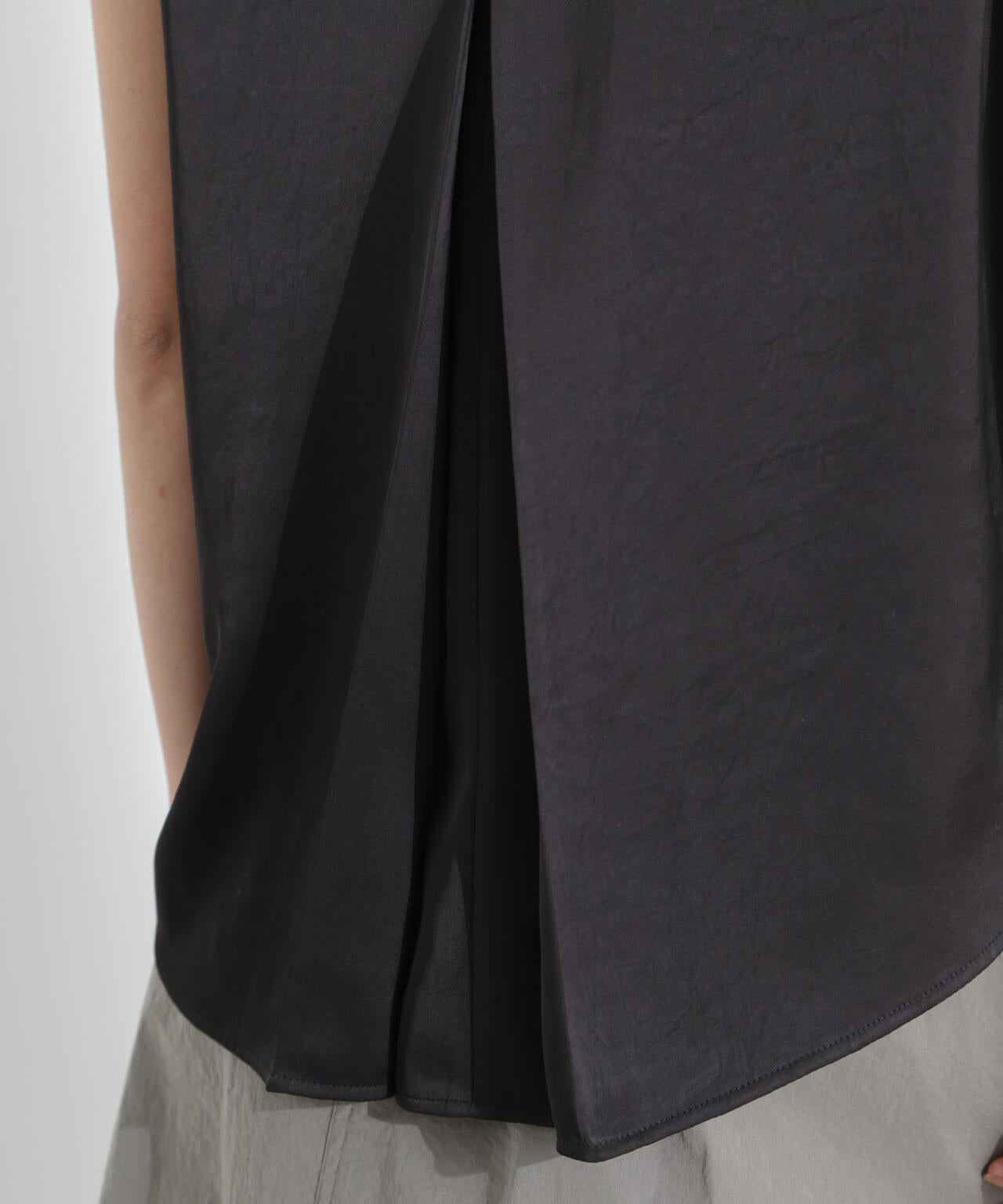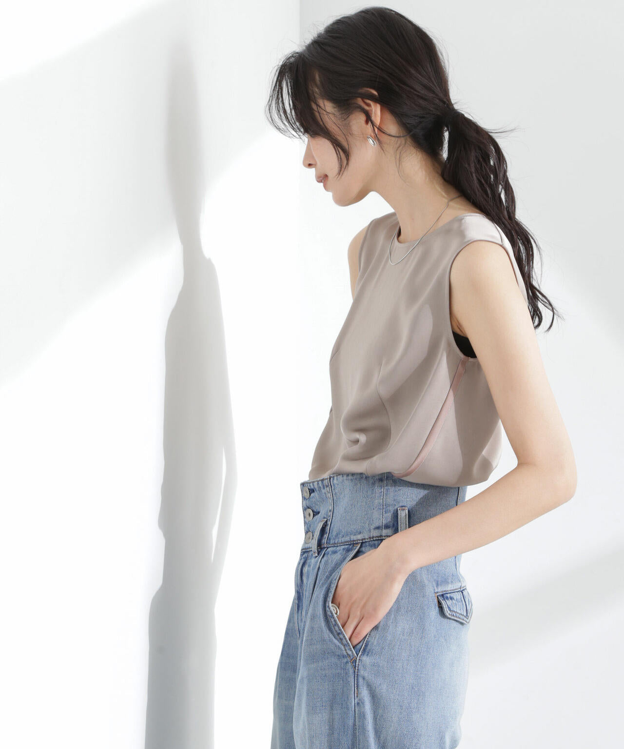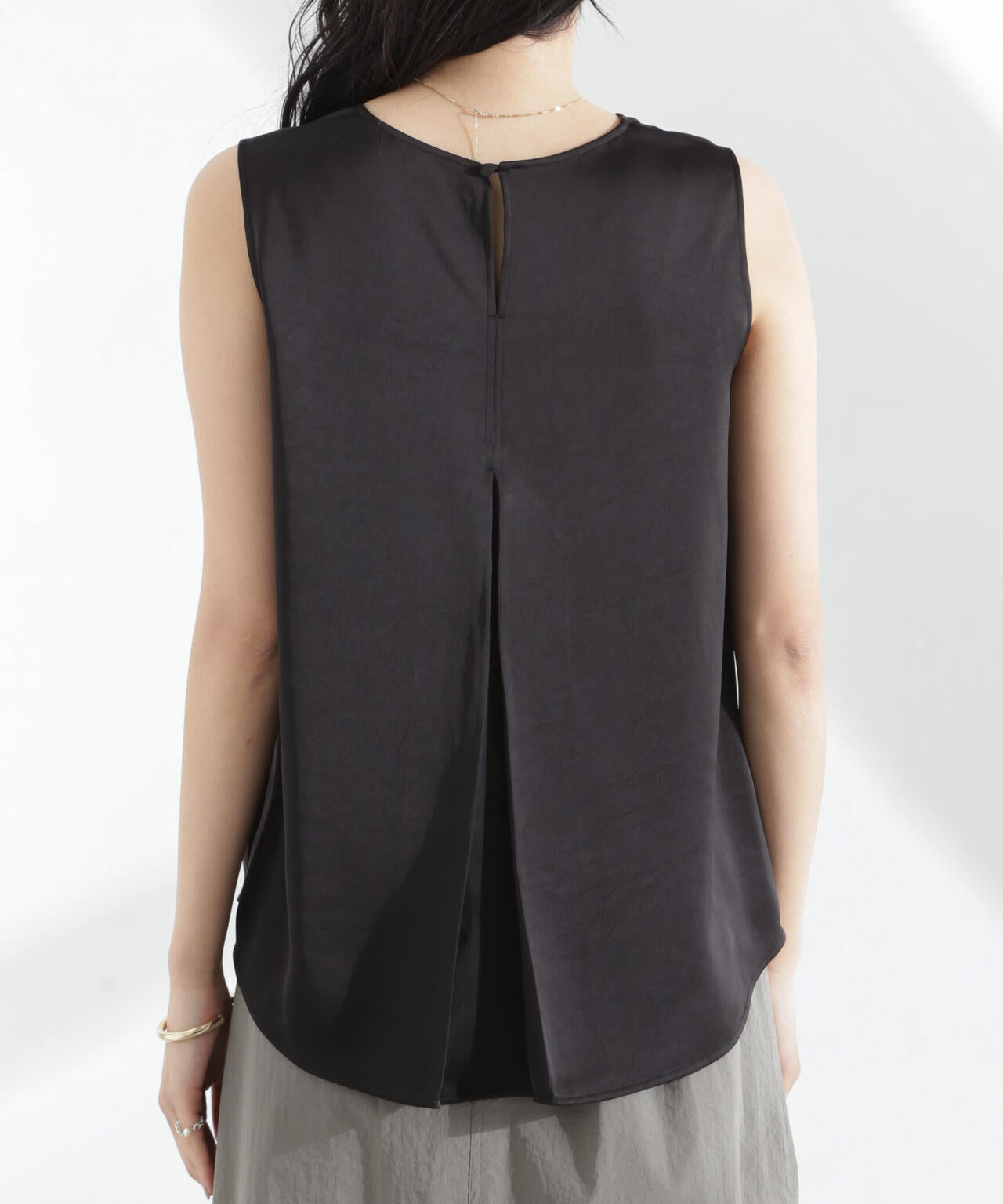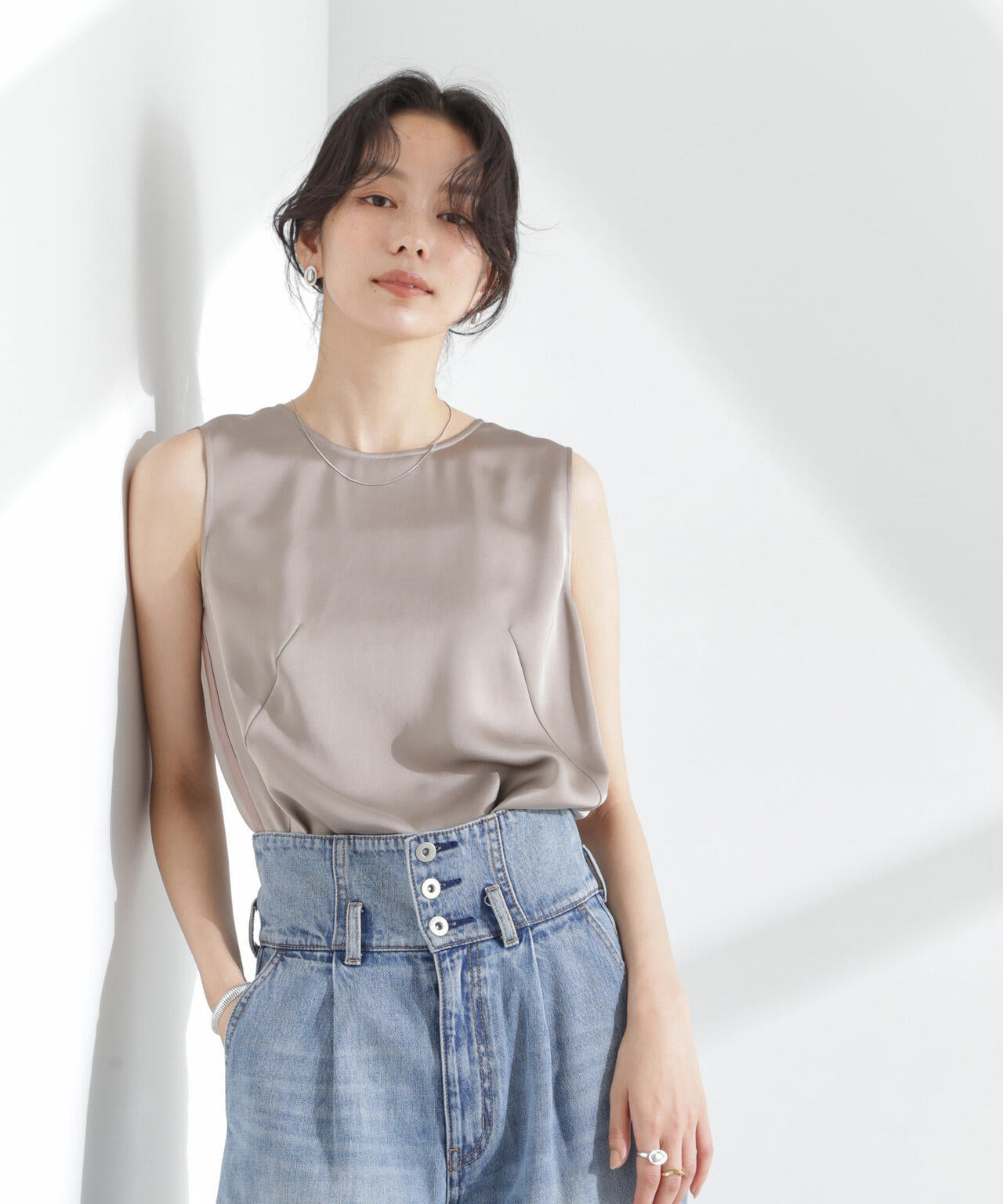 程良いヴィンテージ感とシルクのような風合いが魅力のダブルサテンで仕立てたノースリーブトップス。カットオフの別布を挟み込んだサイドや、シンプルなルックスに映える特徴的なダーツの斜めラインがポイント。どんなスタイリングにも合わせやすい一着です。
