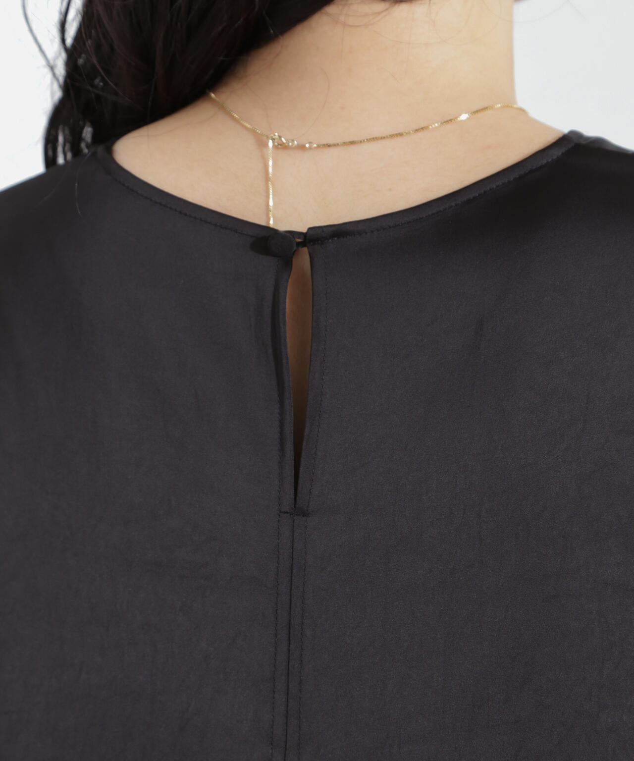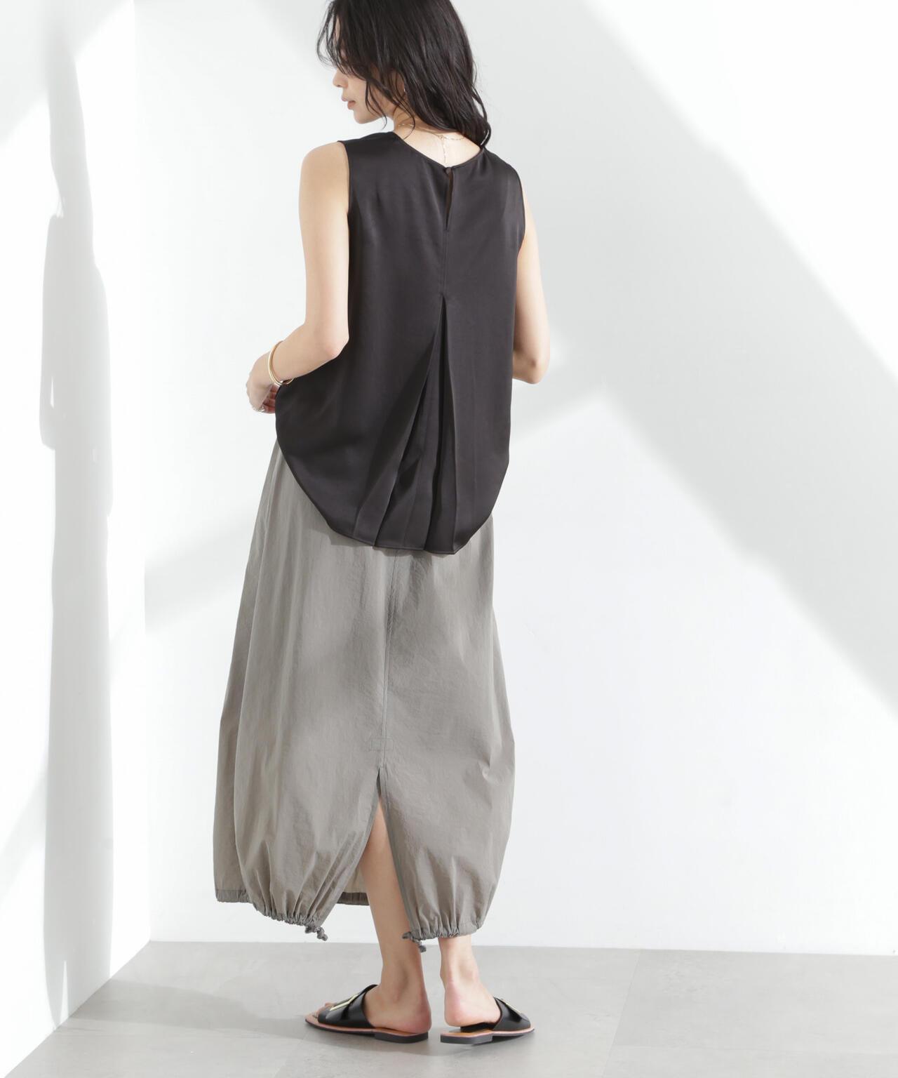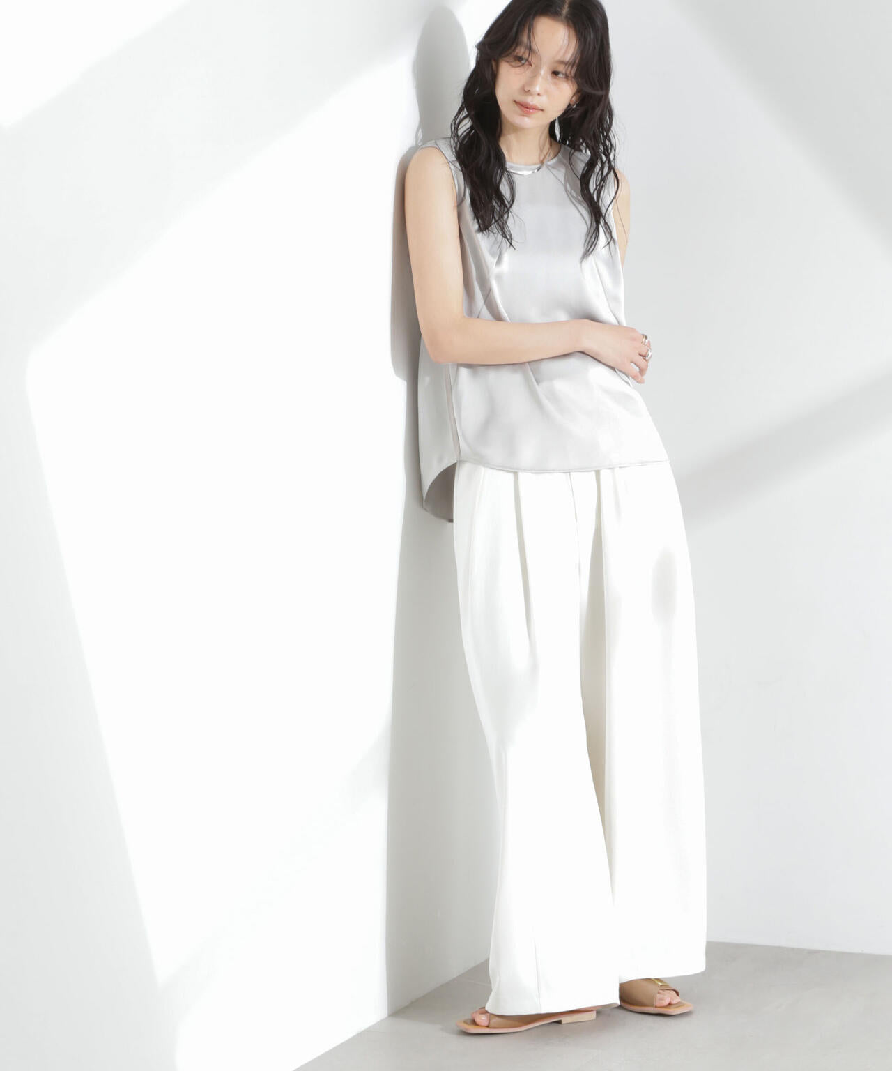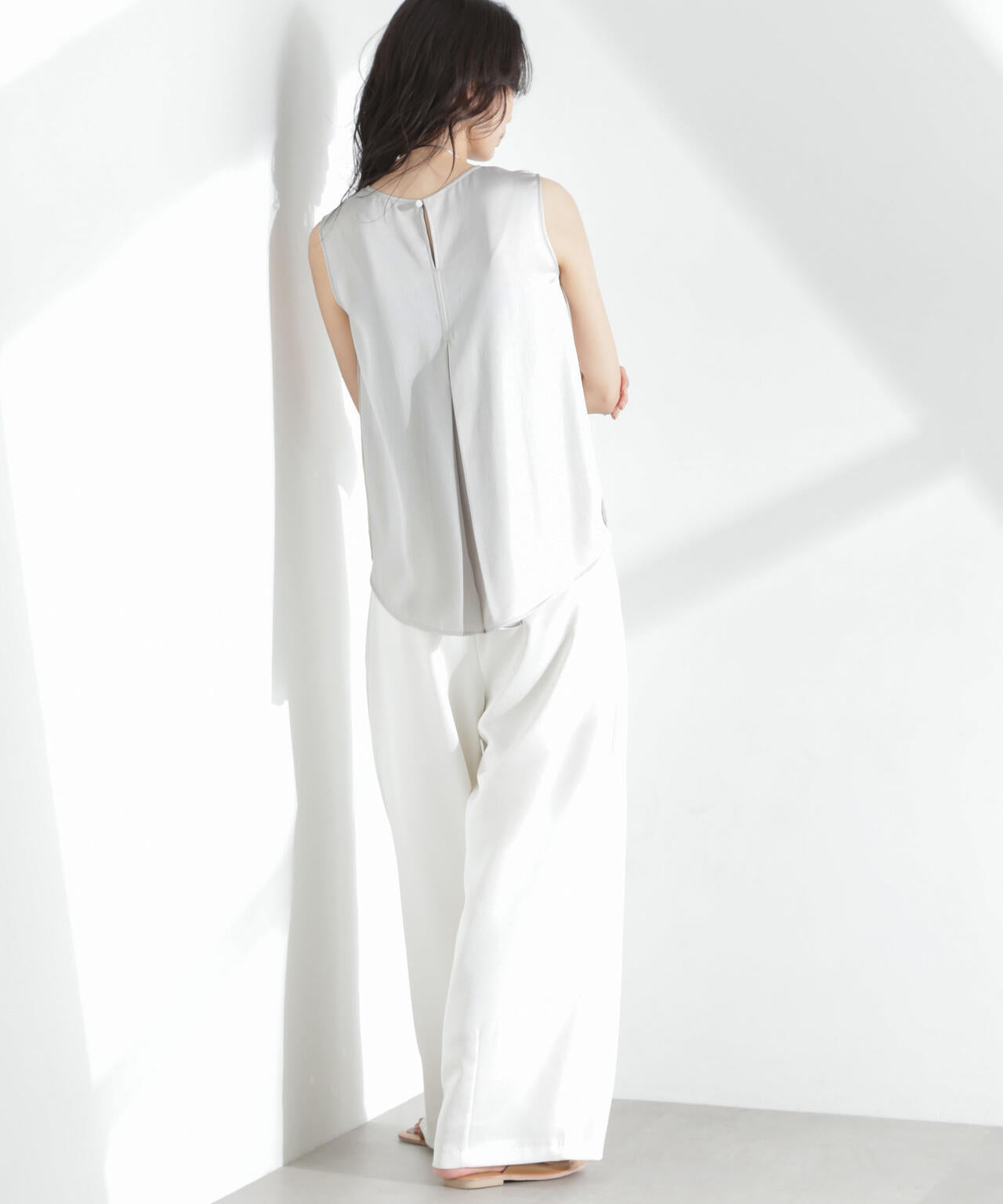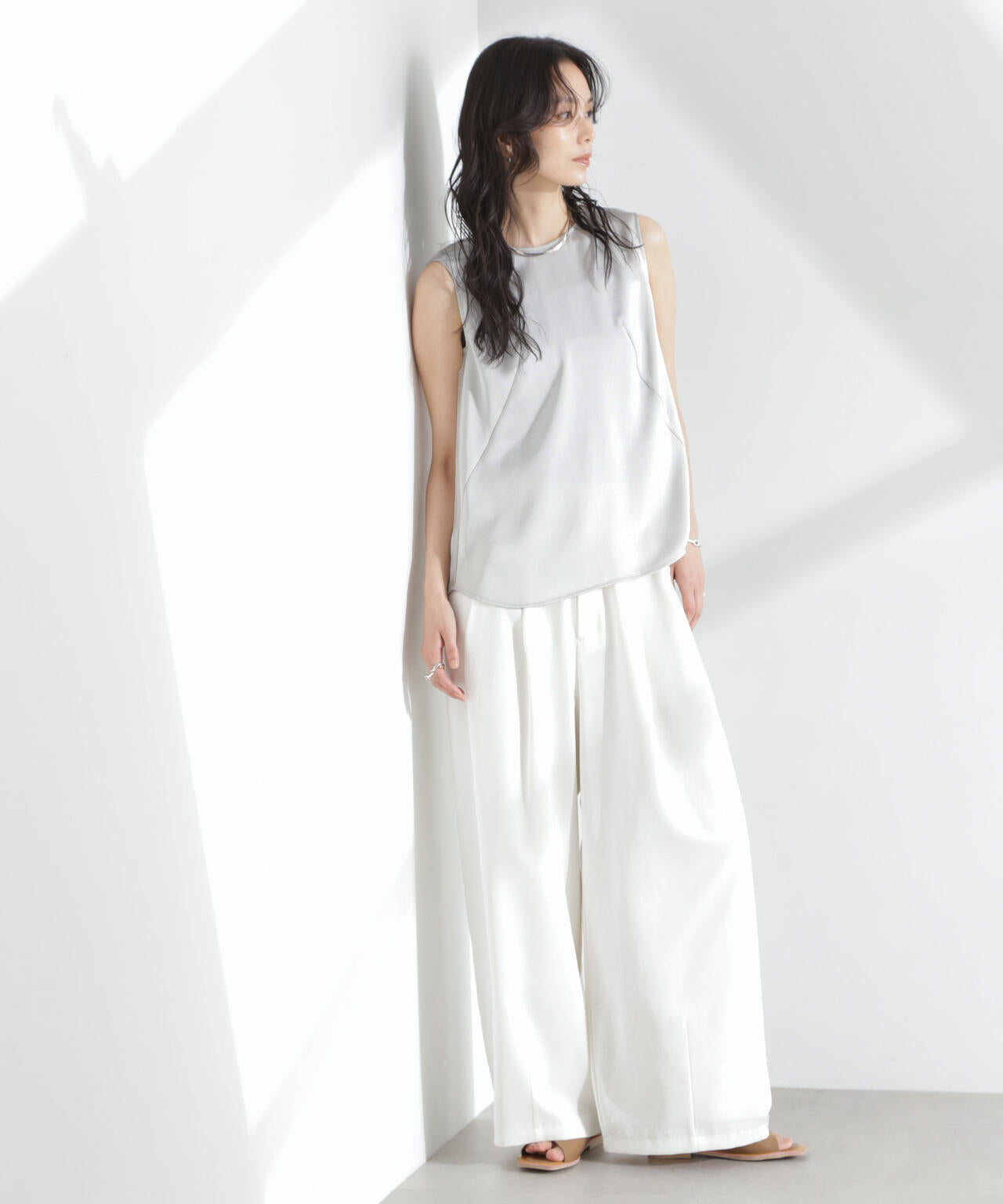 程良いヴィンテージ感とシルクのような風合いが魅力のダブルサテンで仕立てたノースリーブトップス。カットオフの別布を挟み込んだサイドや、シンプルなルックスに映える特徴的なダーツの斜めラインがポイント。どんなスタイリングにも合わせやすい一着です。