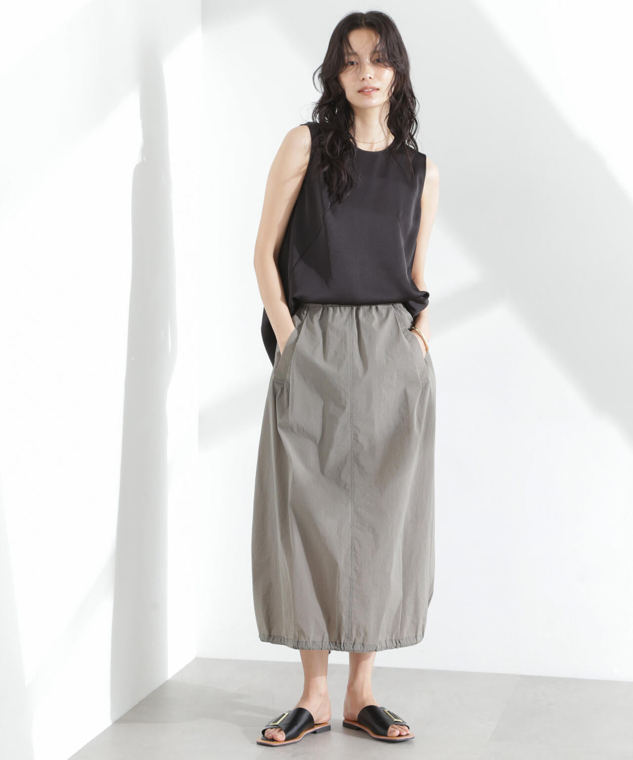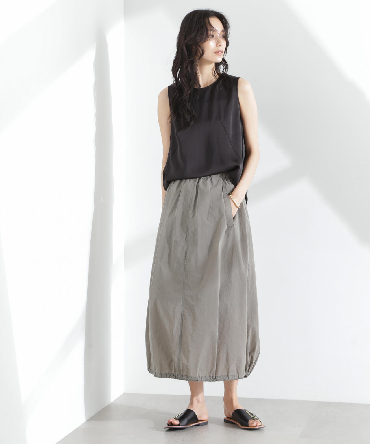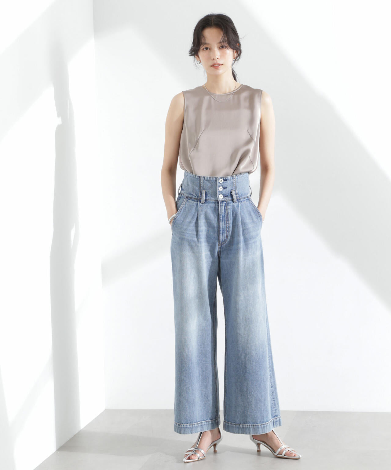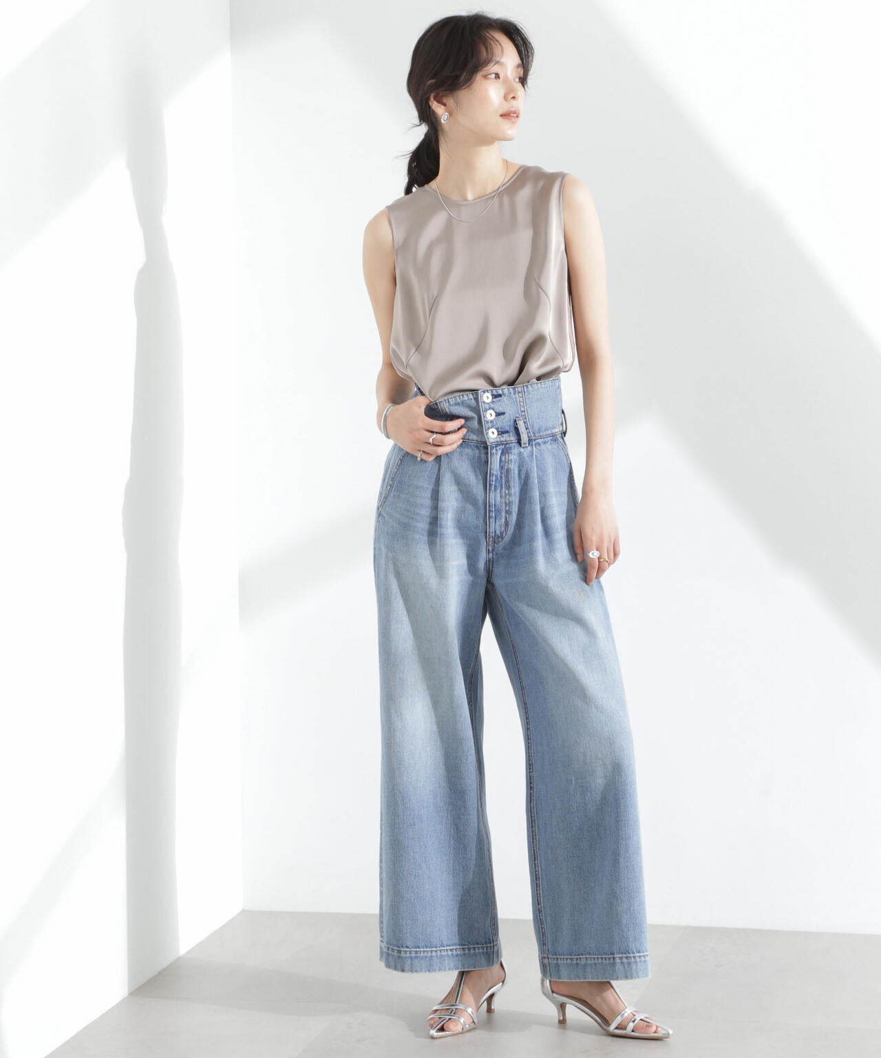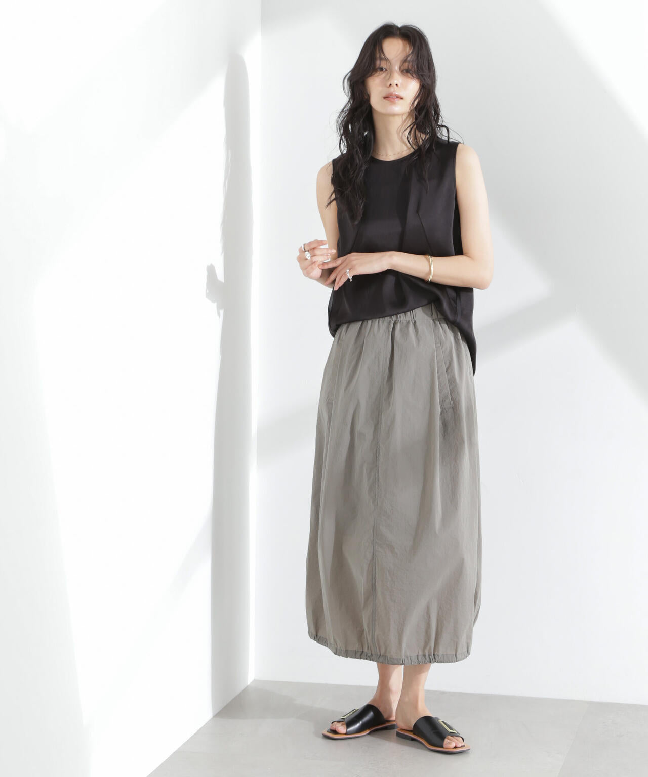 程良いヴィンテージ感とシルクのような風合いが魅力のダブルサテンで仕立てたノースリーブトップス。カットオフの別布を挟み込んだサイドや、シンプルなルックスに映える特徴的なダーツの斜めラインがポイント。どんなスタイリングにも合わせやすい一着です。