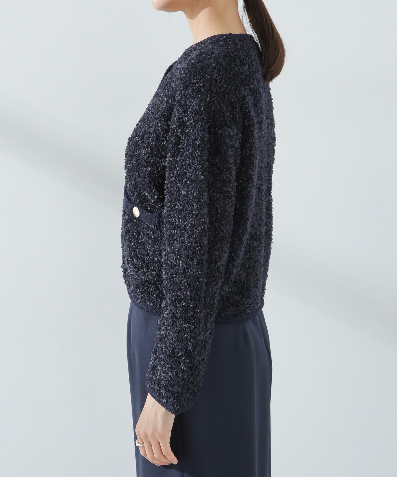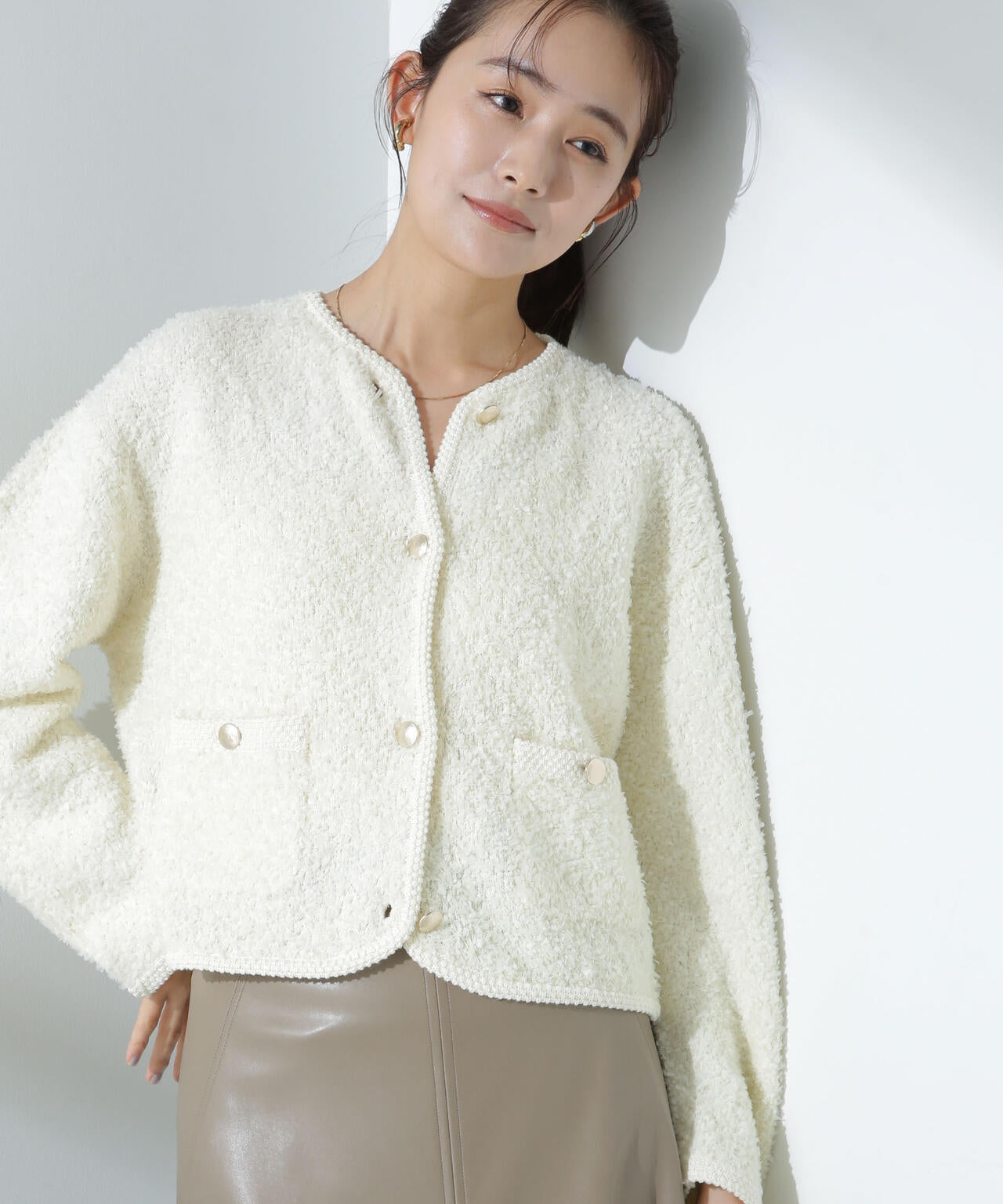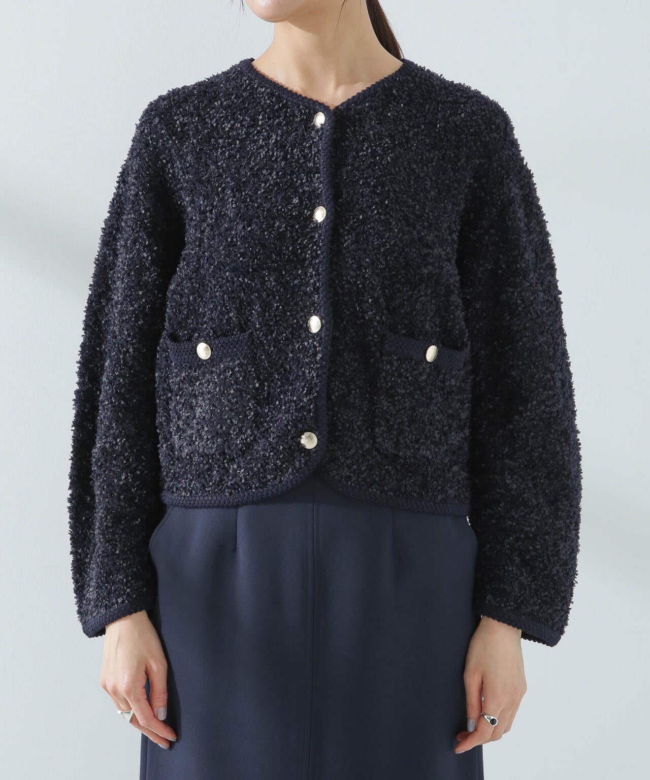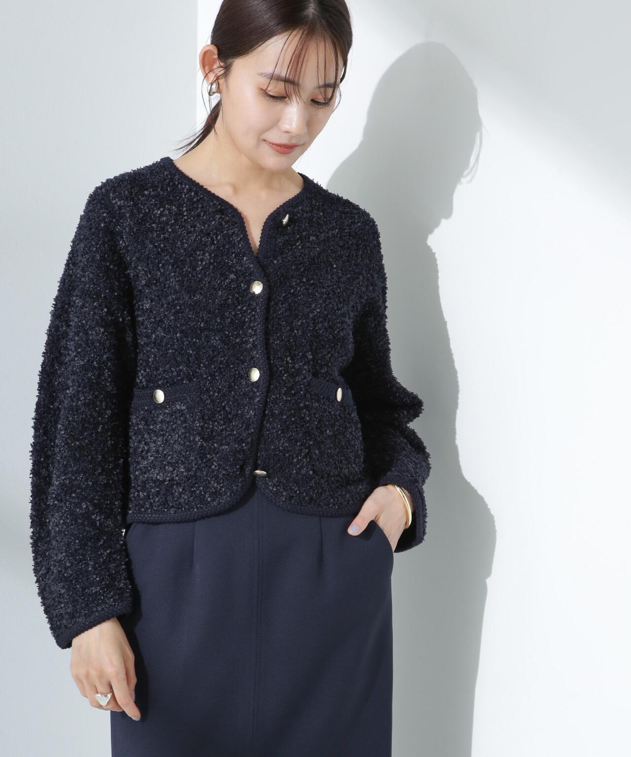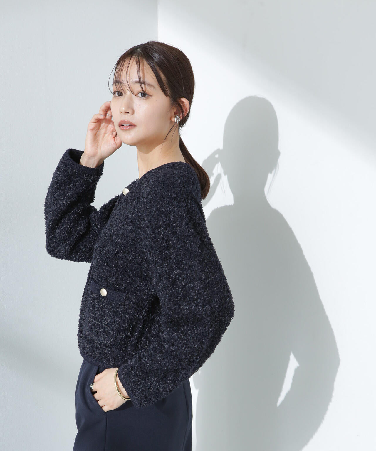 フサフサとしたリボンヤーンが華やかなニットジャケット。ツイードジャケットのような華やかさでしっかりとした見え方もありながらも、ニット特有の着心地の良さがありジャケットとカーディガンの間のようなアイテムです。