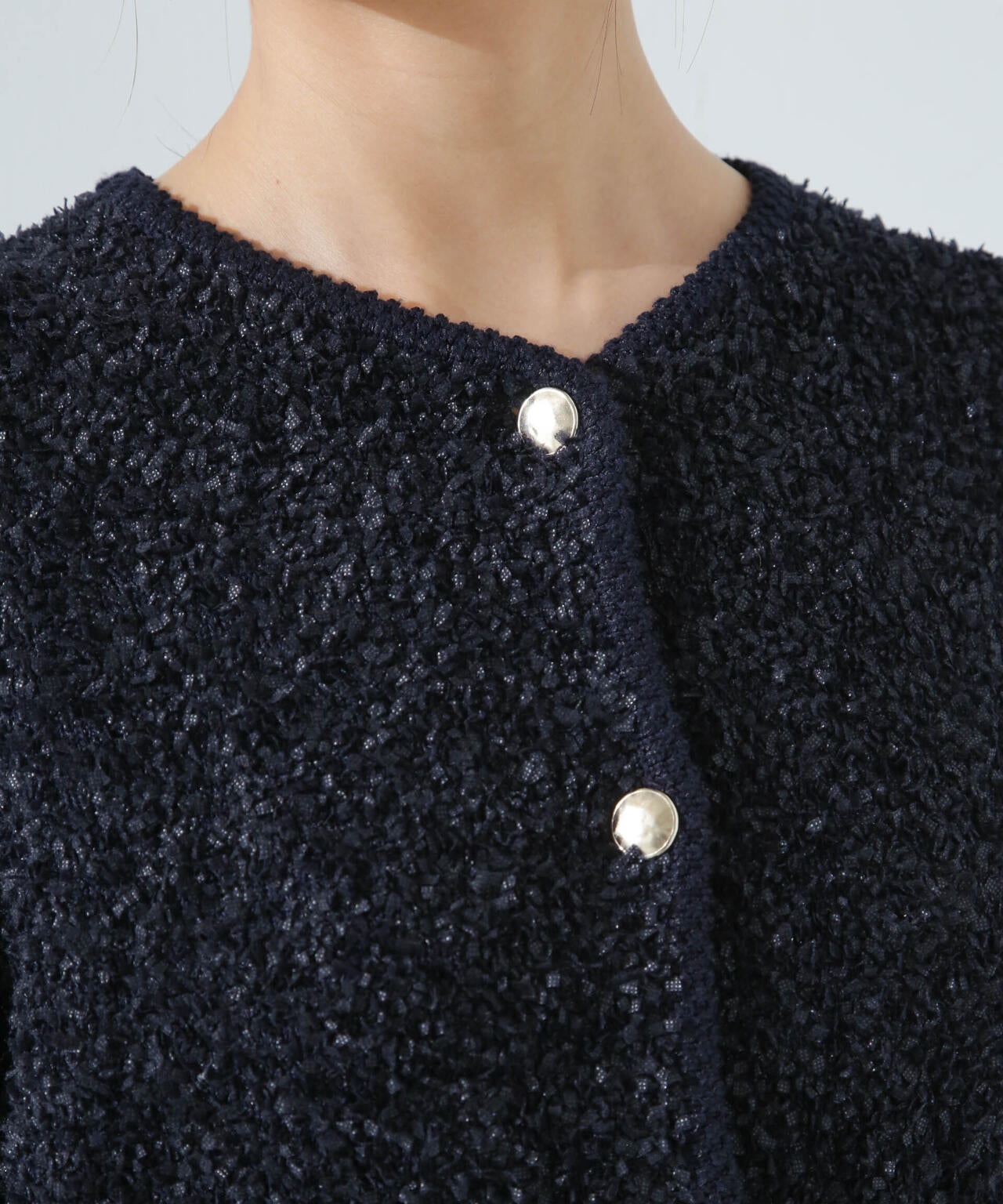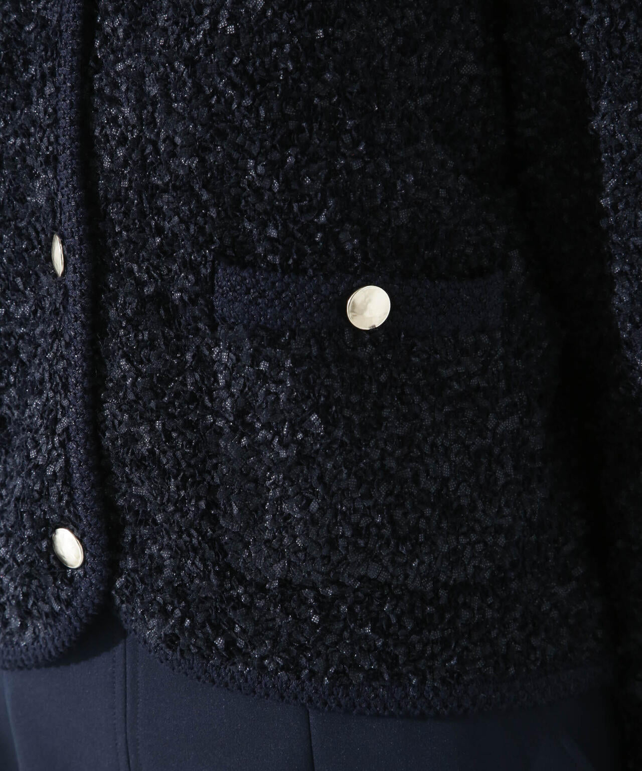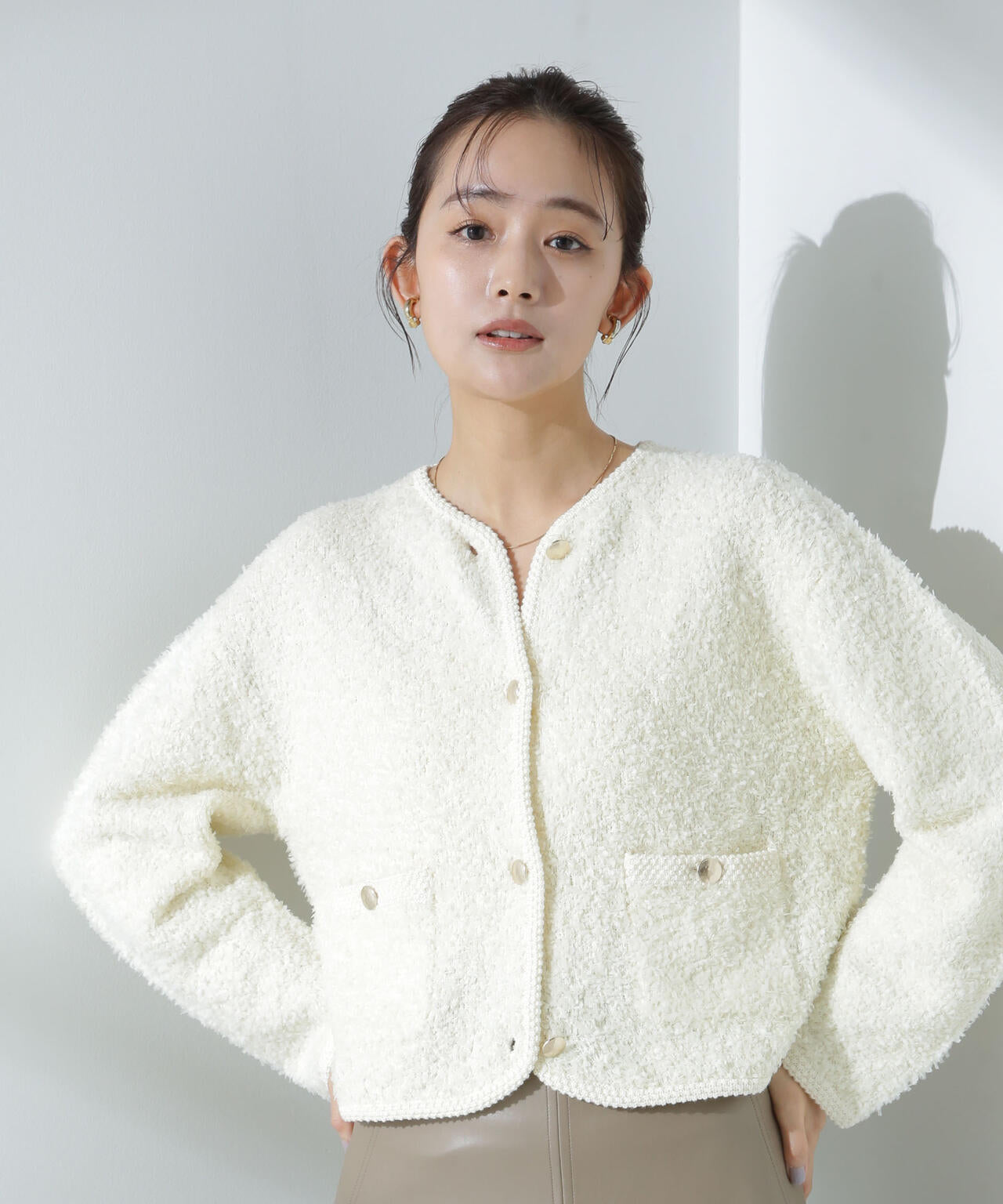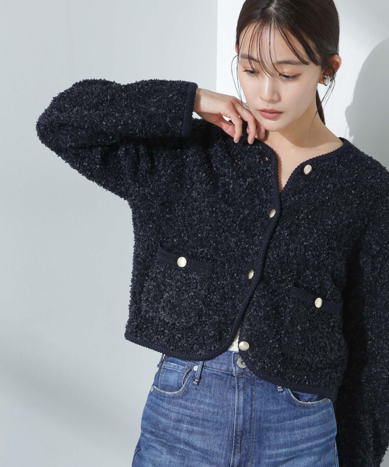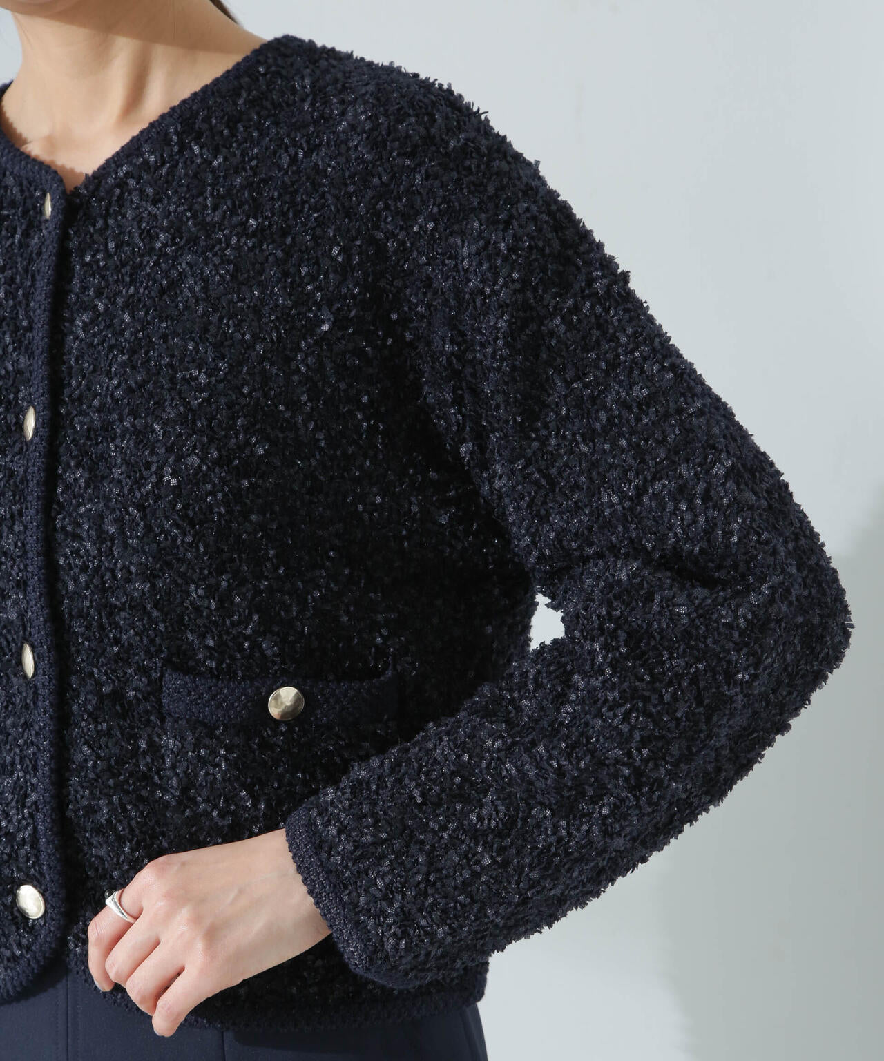 フサフサとしたリボンヤーンが華やかなニットジャケット。ツイードジャケットのような華やかさでしっかりとした見え方もありながらも、ニット特有の着心地の良さがありジャケットとカーディガンの間のようなアイテムです。