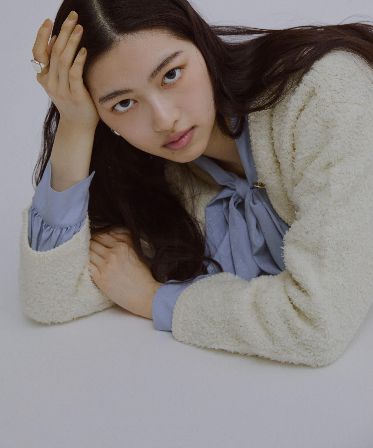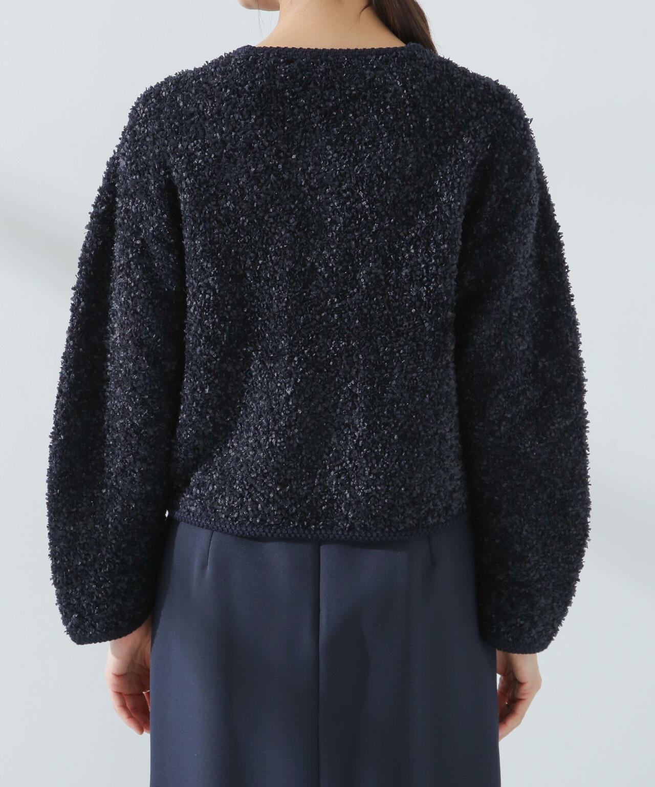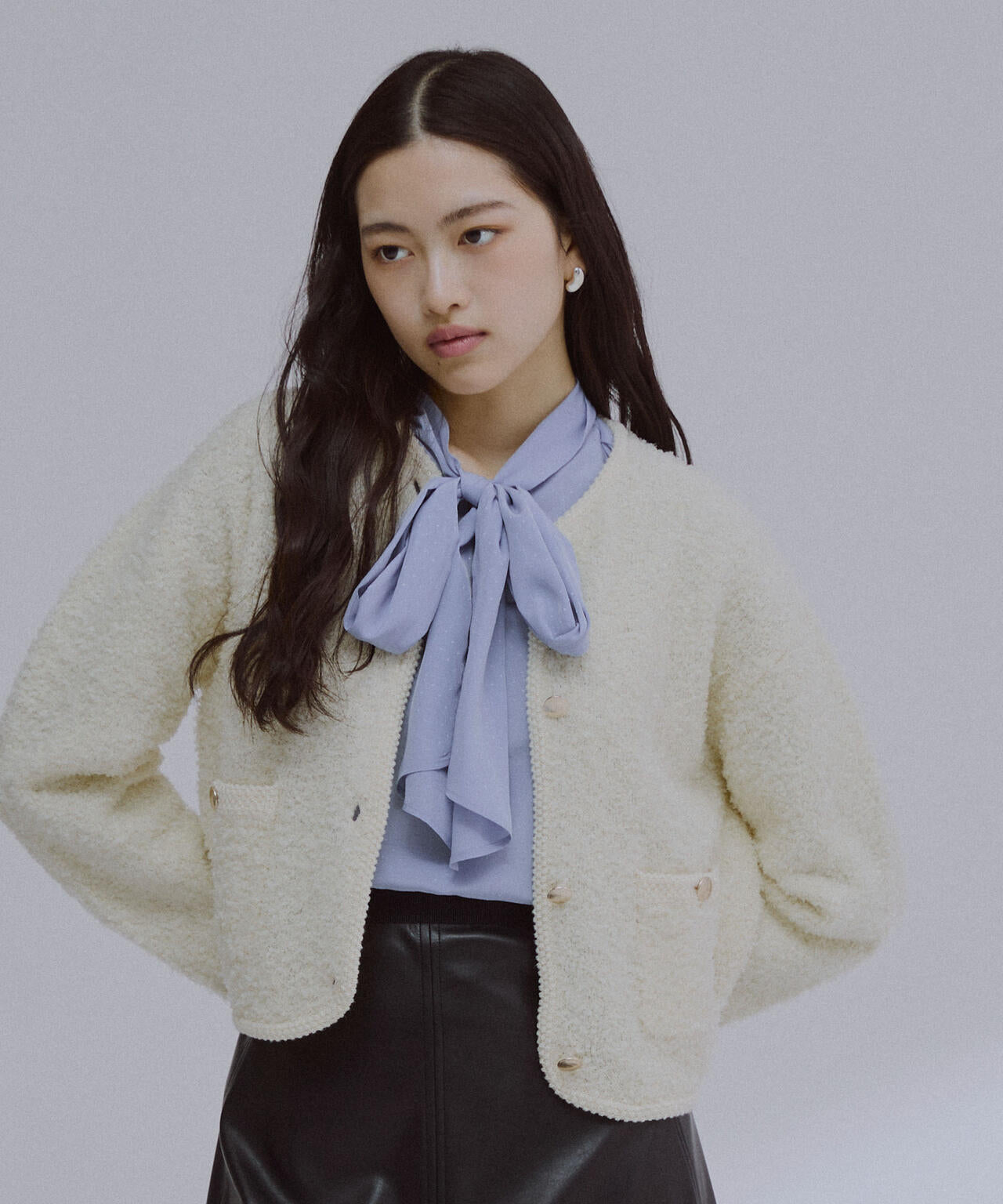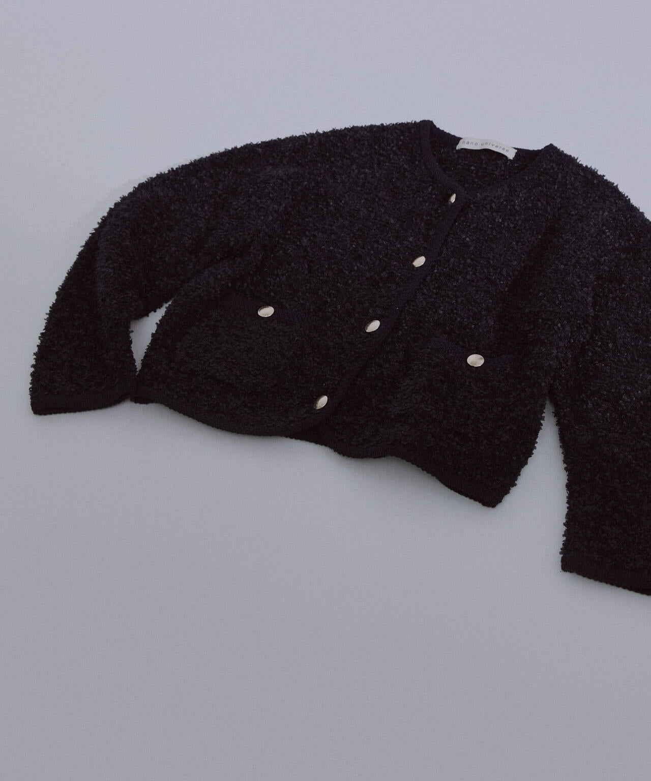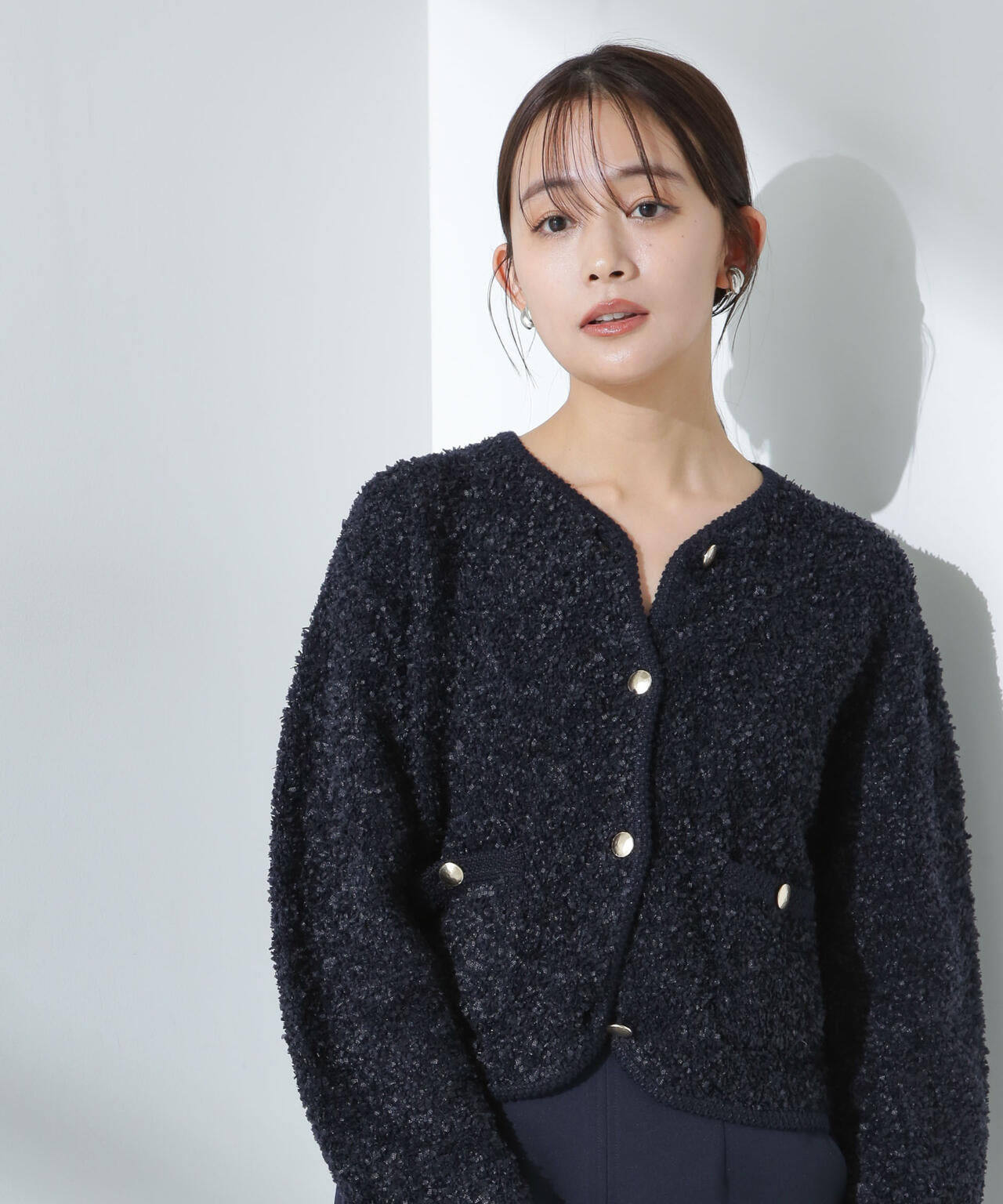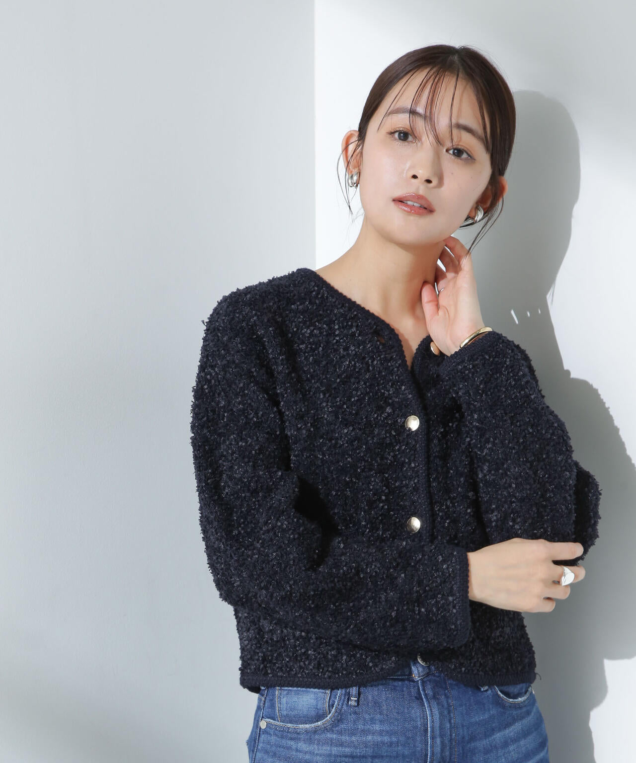 フサフサとしたリボンヤーンが華やかなニットジャケット。ツイードジャケットのような華やかさでしっかりとした見え方もありながらも、ニット特有の着心地の良さがありジャケットとカーディガンの間のようなアイテムです。