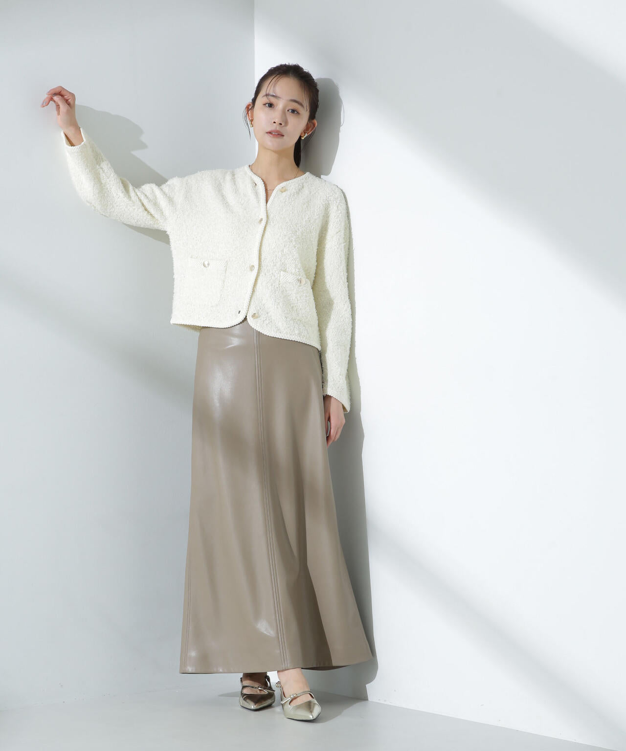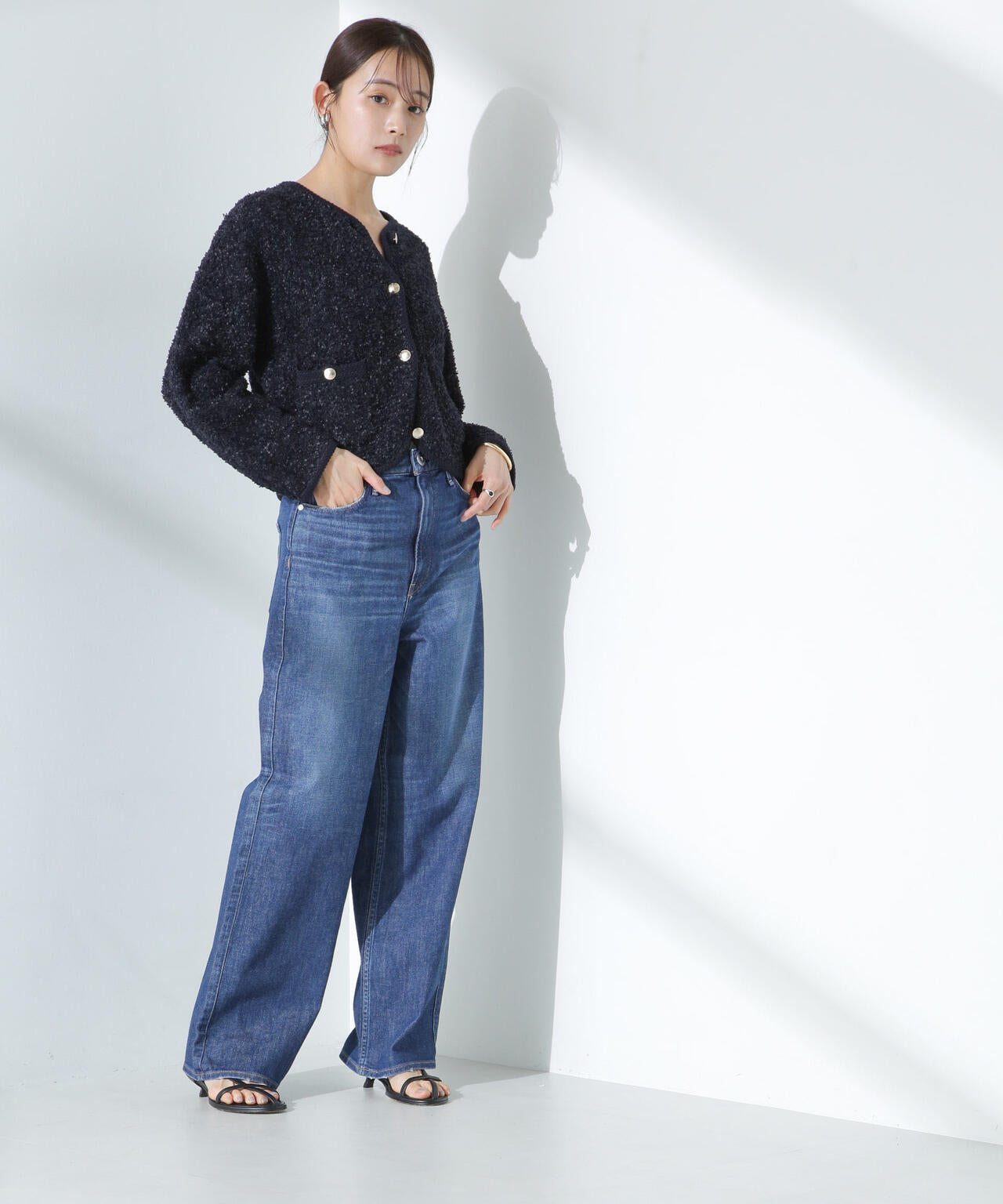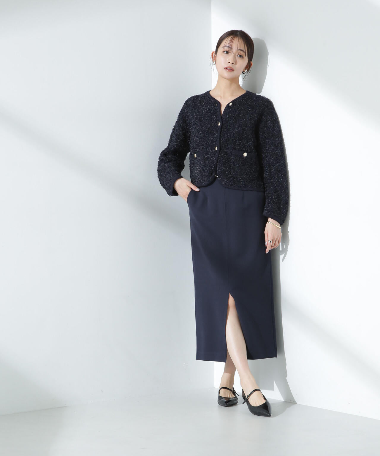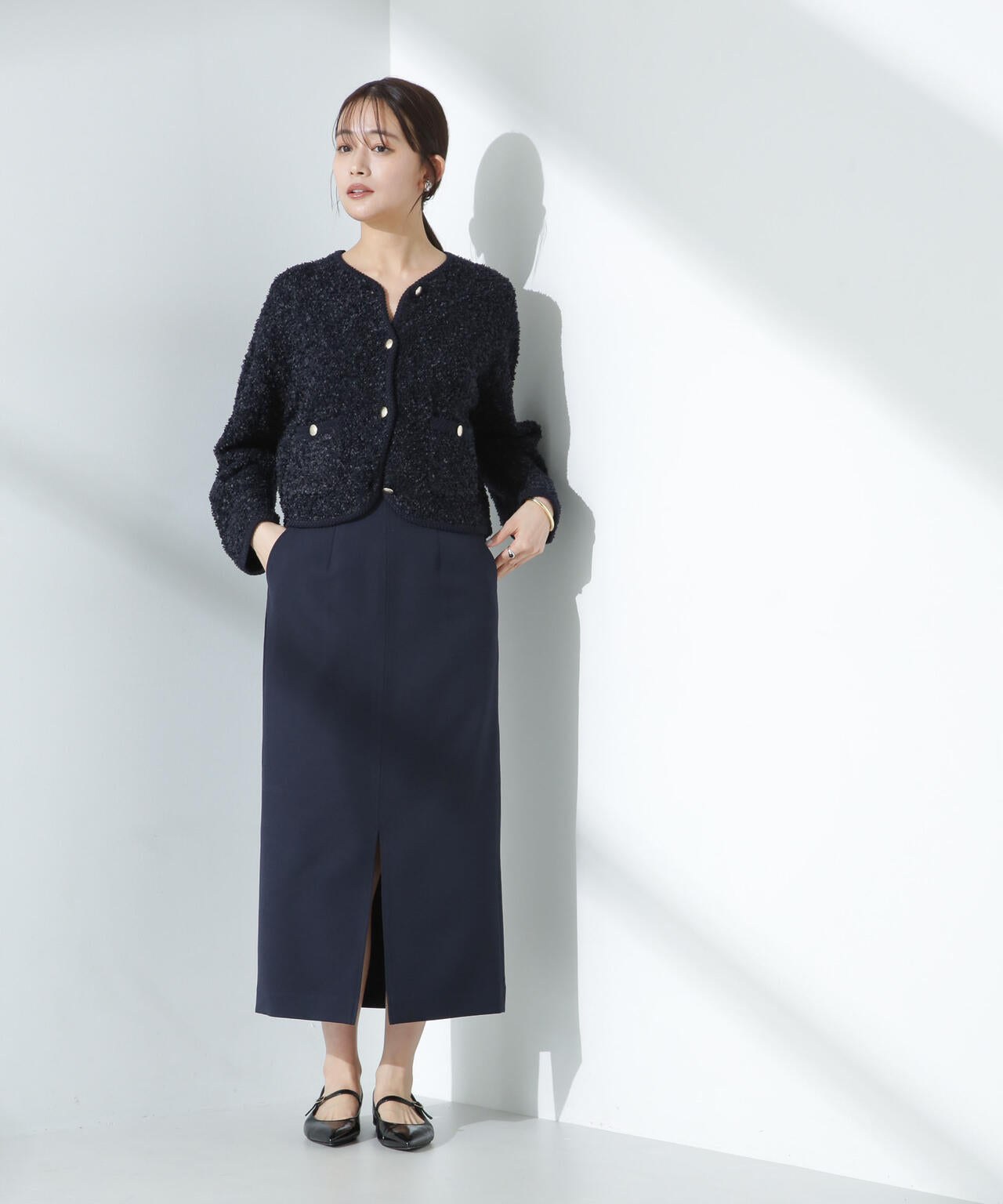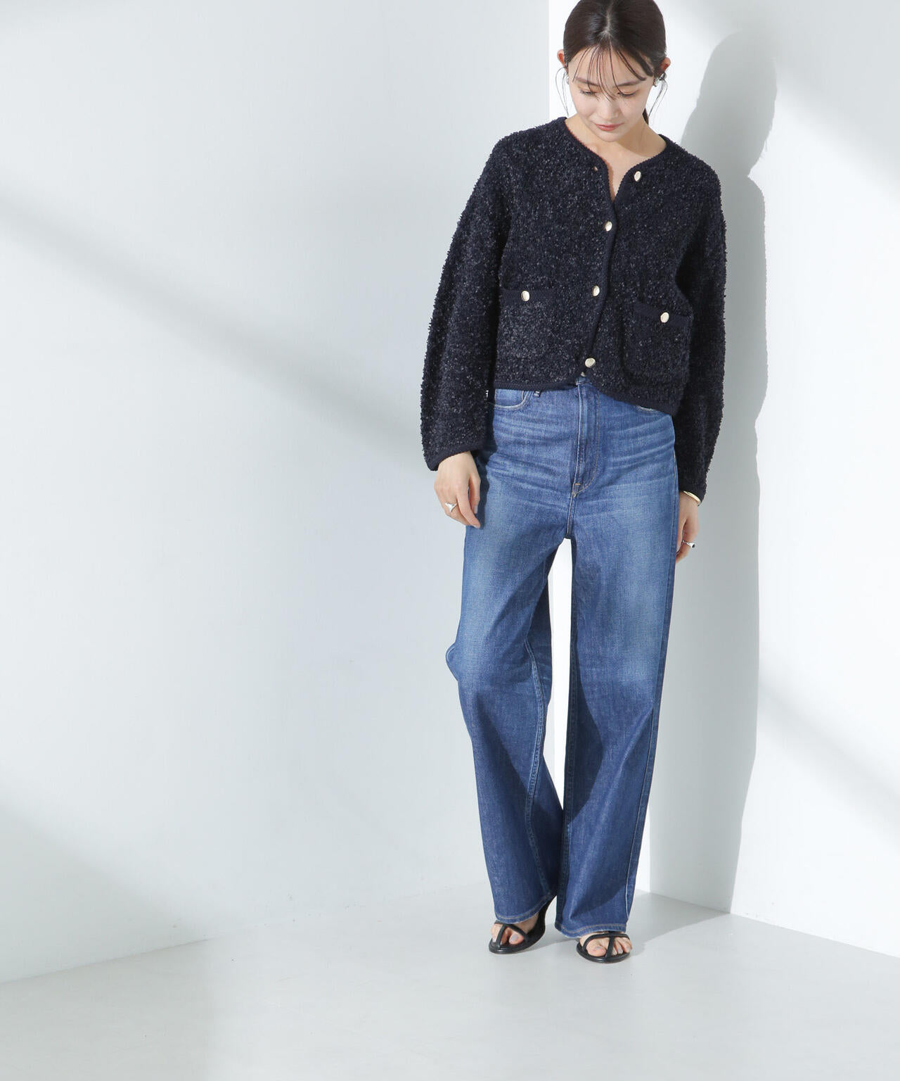 フサフサとしたリボンヤーンが華やかなニットジャケット。ツイードジャケットのような華やかさでしっかりとした見え方もありながらも、ニット特有の着心地の良さがありジャケットとカーディガンの間のようなアイテムです。