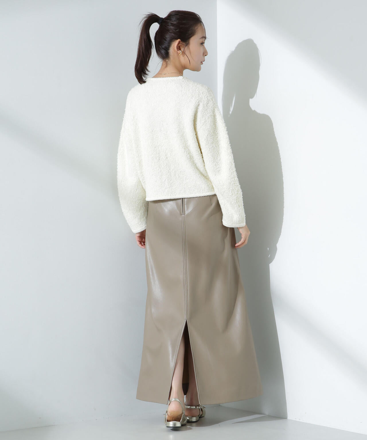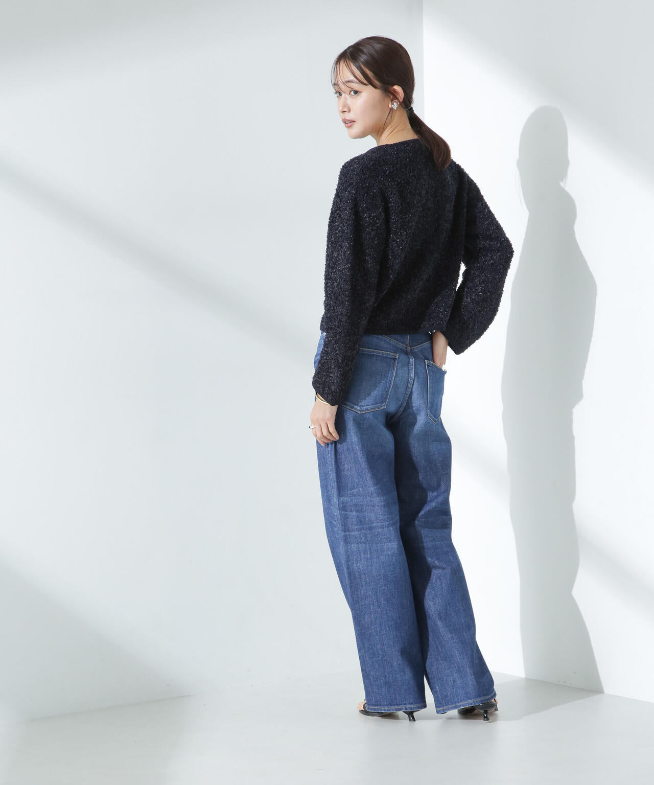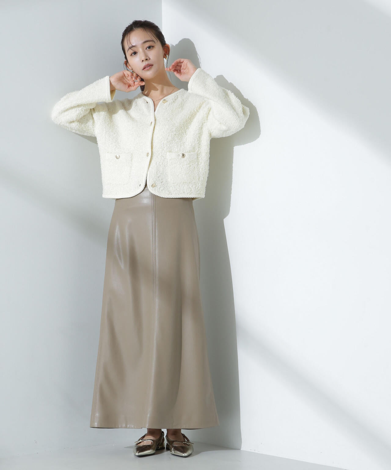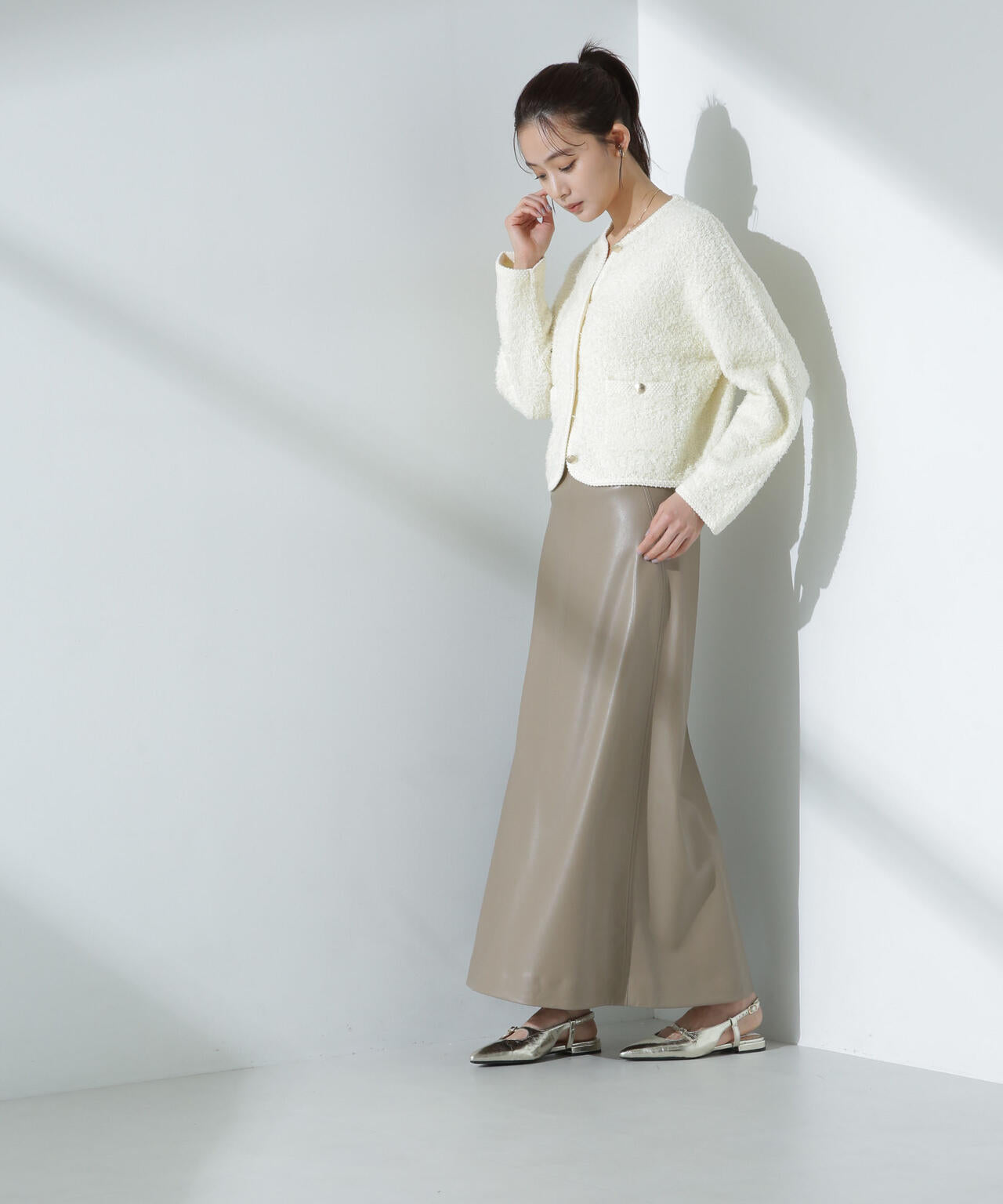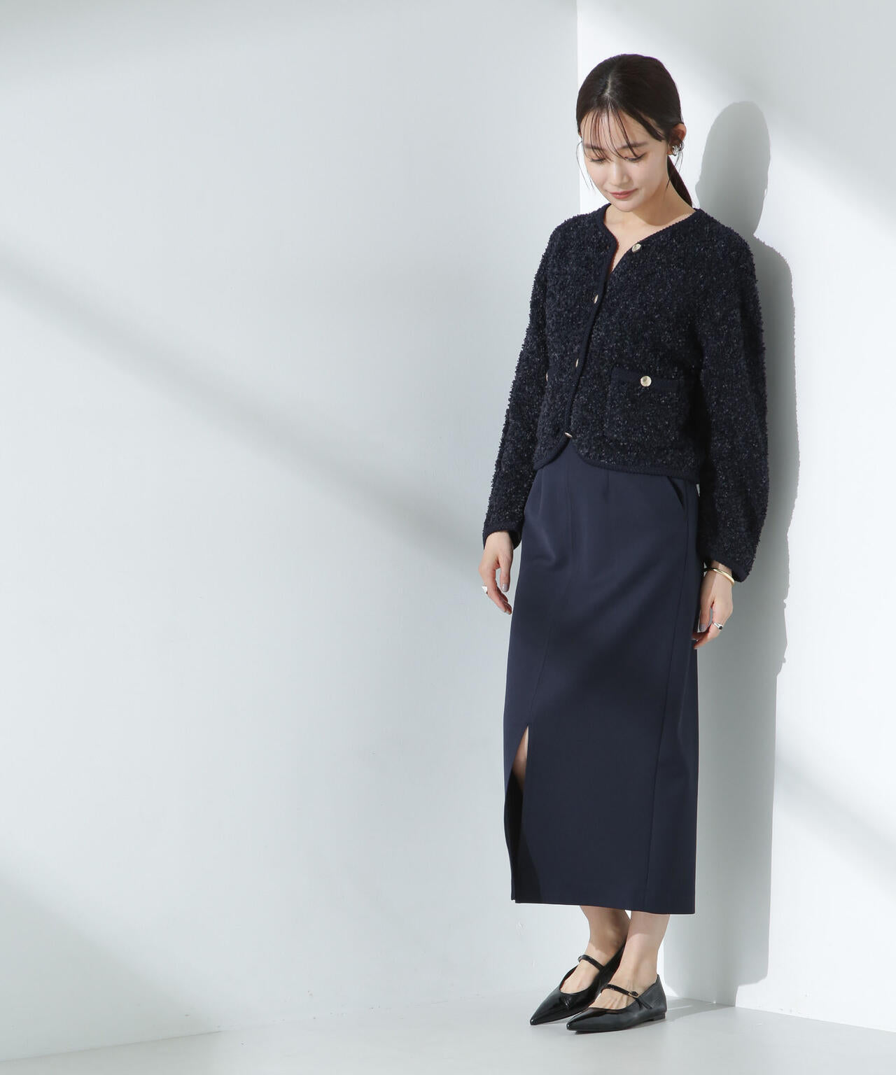 フサフサとしたリボンヤーンが華やかなニットジャケット。ツイードジャケットのような華やかさでしっかりとした見え方もありながらも、ニット特有の着心地の良さがありジャケットとカーディガンの間のようなアイテムです。