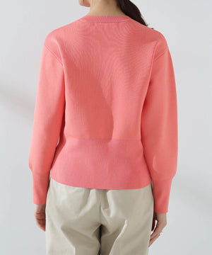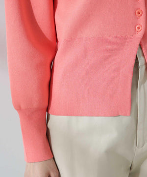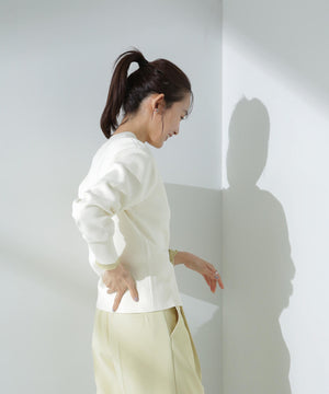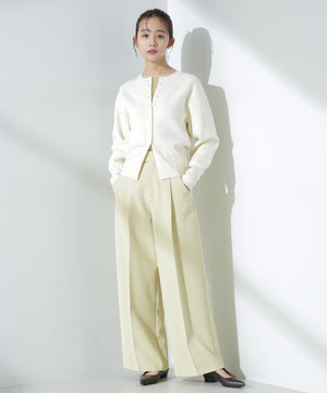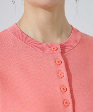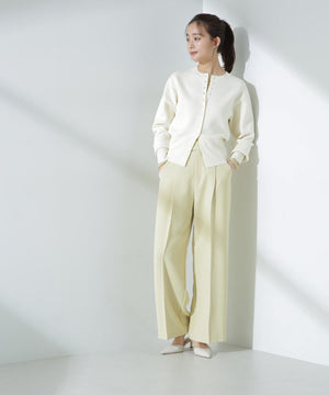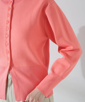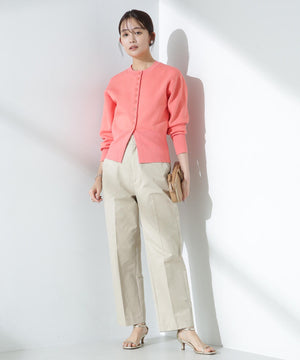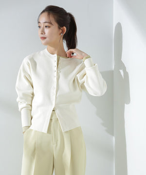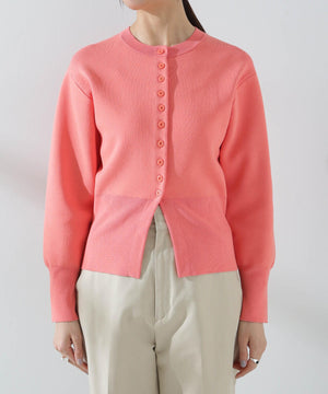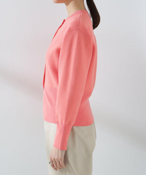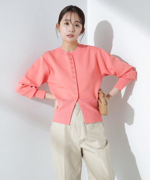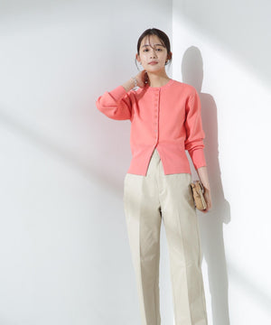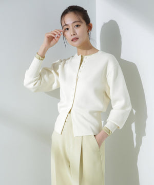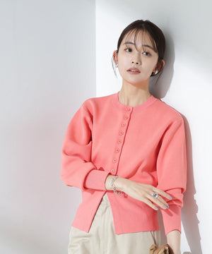 ダブルジャガードで程よい肉厚とシルエットを出したクルーネックのニットカーディガン。キレイめなムードがありながら、ややカジュアル感もあるので様々なスタイルに合わせられるデザイン。羽織にはもちろん、プルオーバーとして釦をポイントにして着ていただくのもおすすめです。