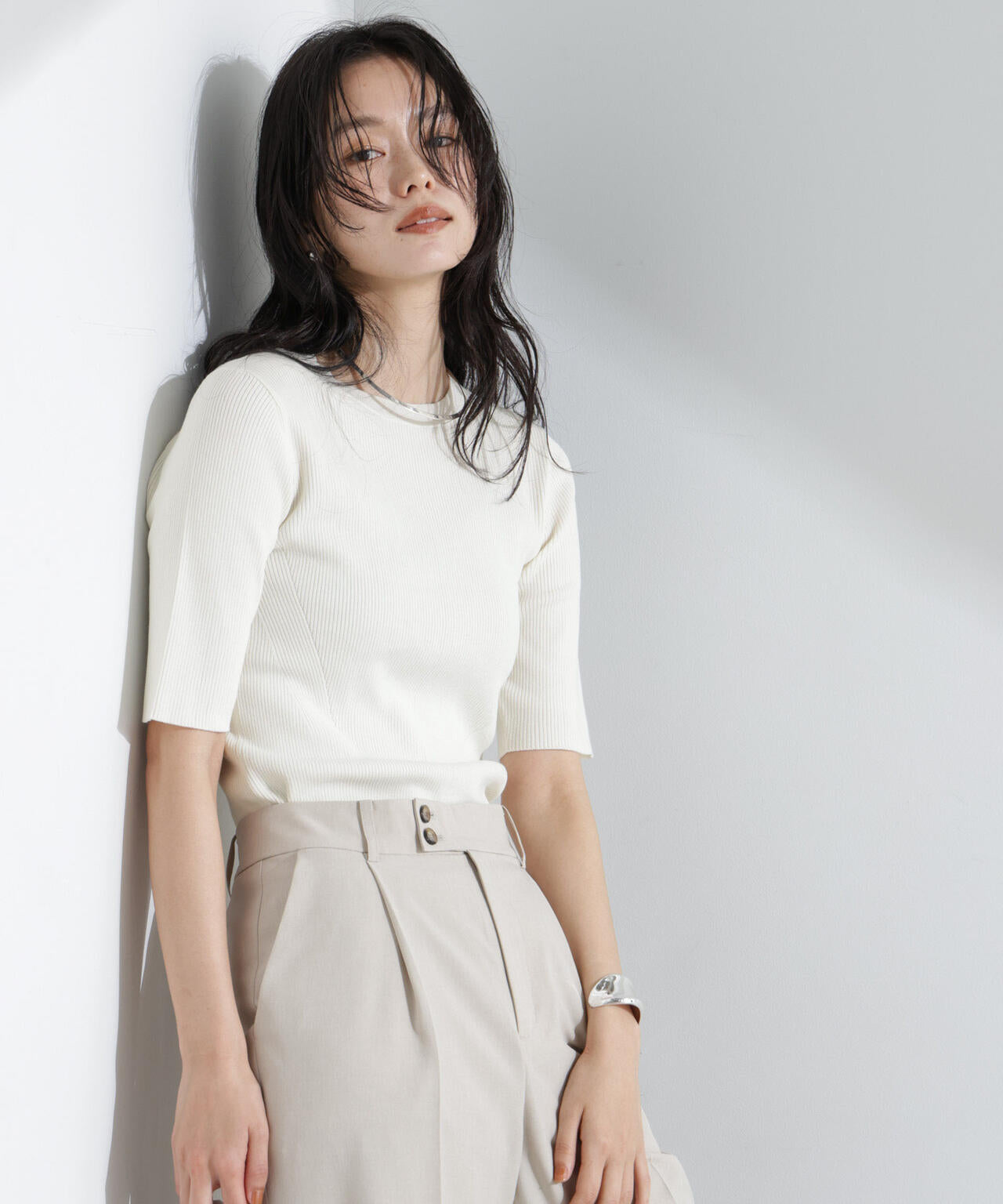 UVカットとマシンウォッシャブルに優れた機能性が嬉しい五分袖リブニット。リブ仕様と身体のラインを拾いすぎない程よい細身のシルエットで、女性らしく着こなせる一枚。コンパクトなデザインと五分袖丈が春ニットとして大活躍してくれます。