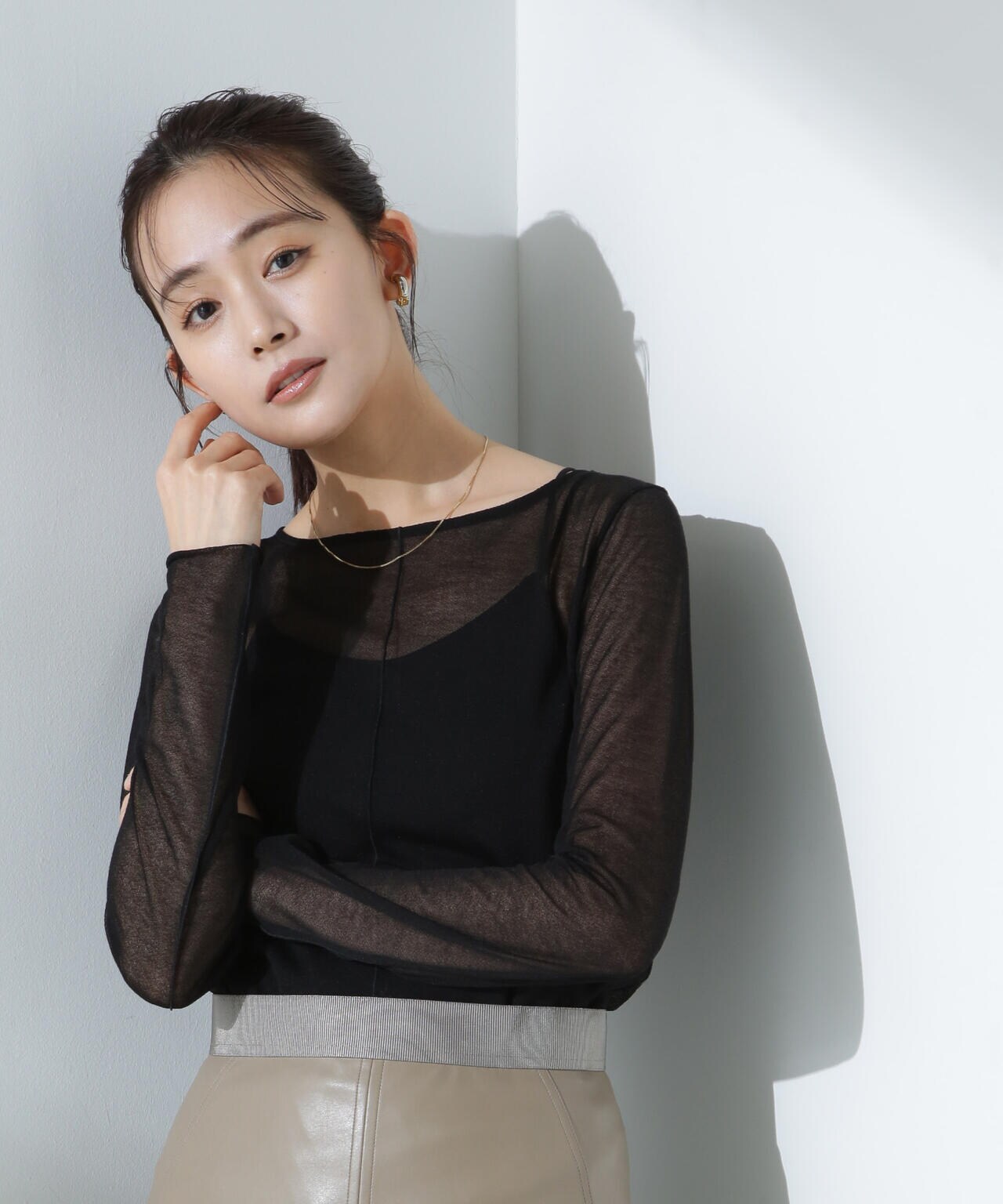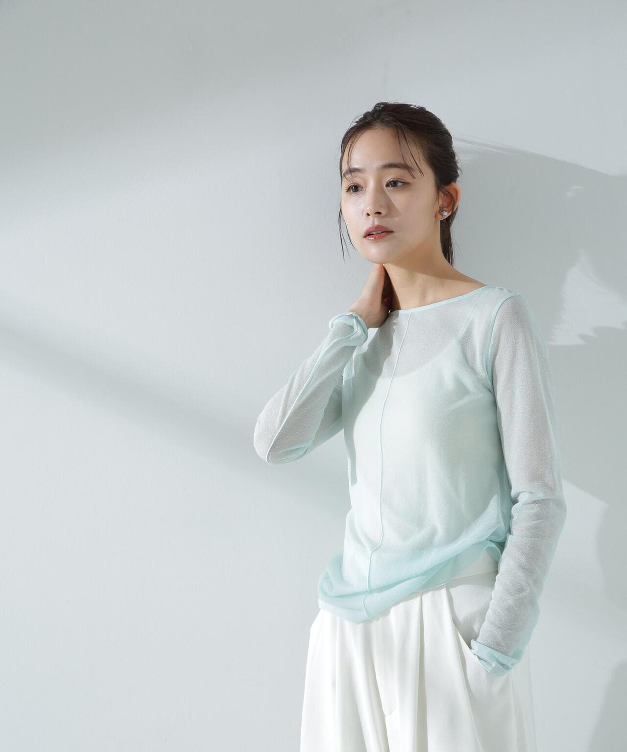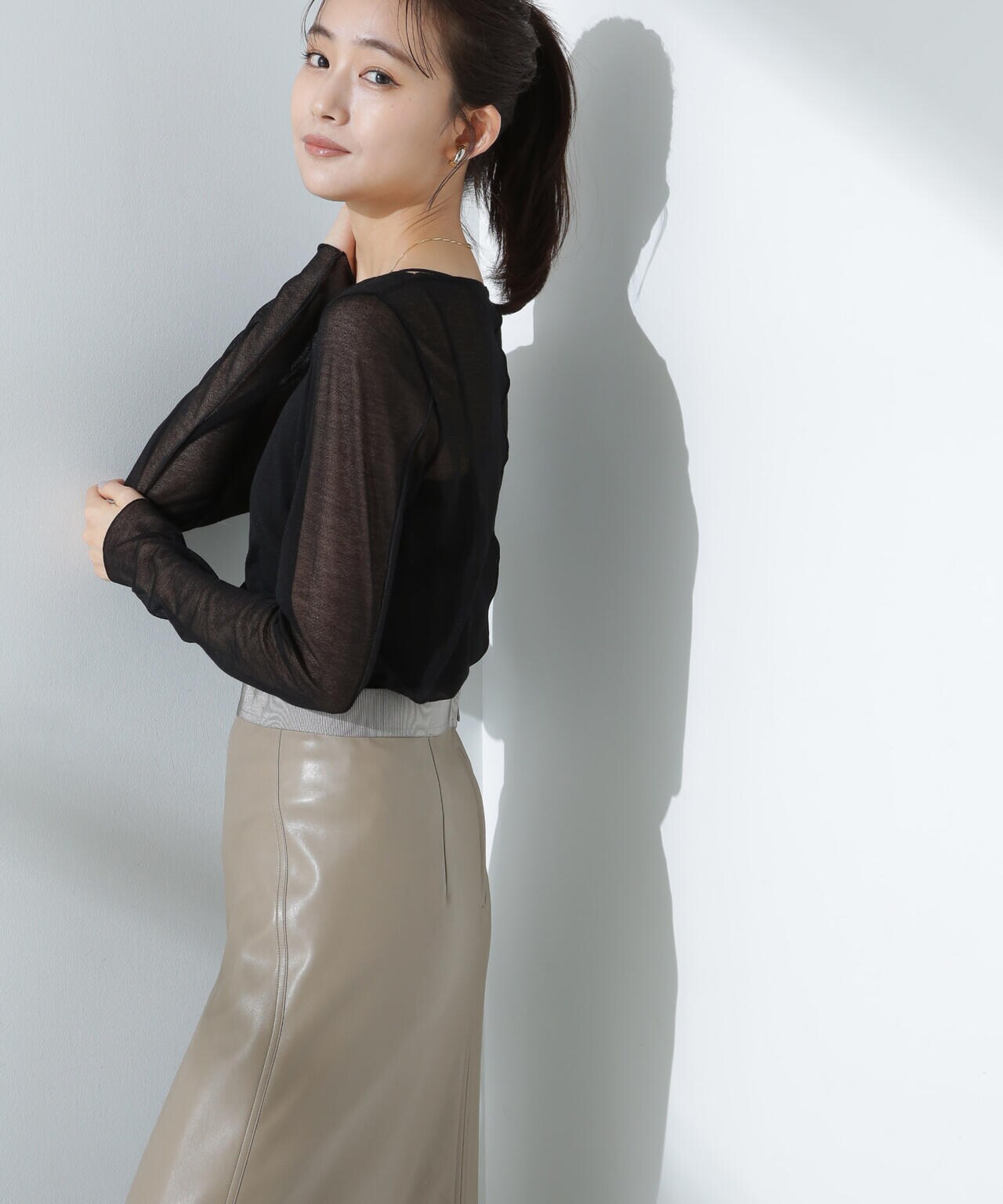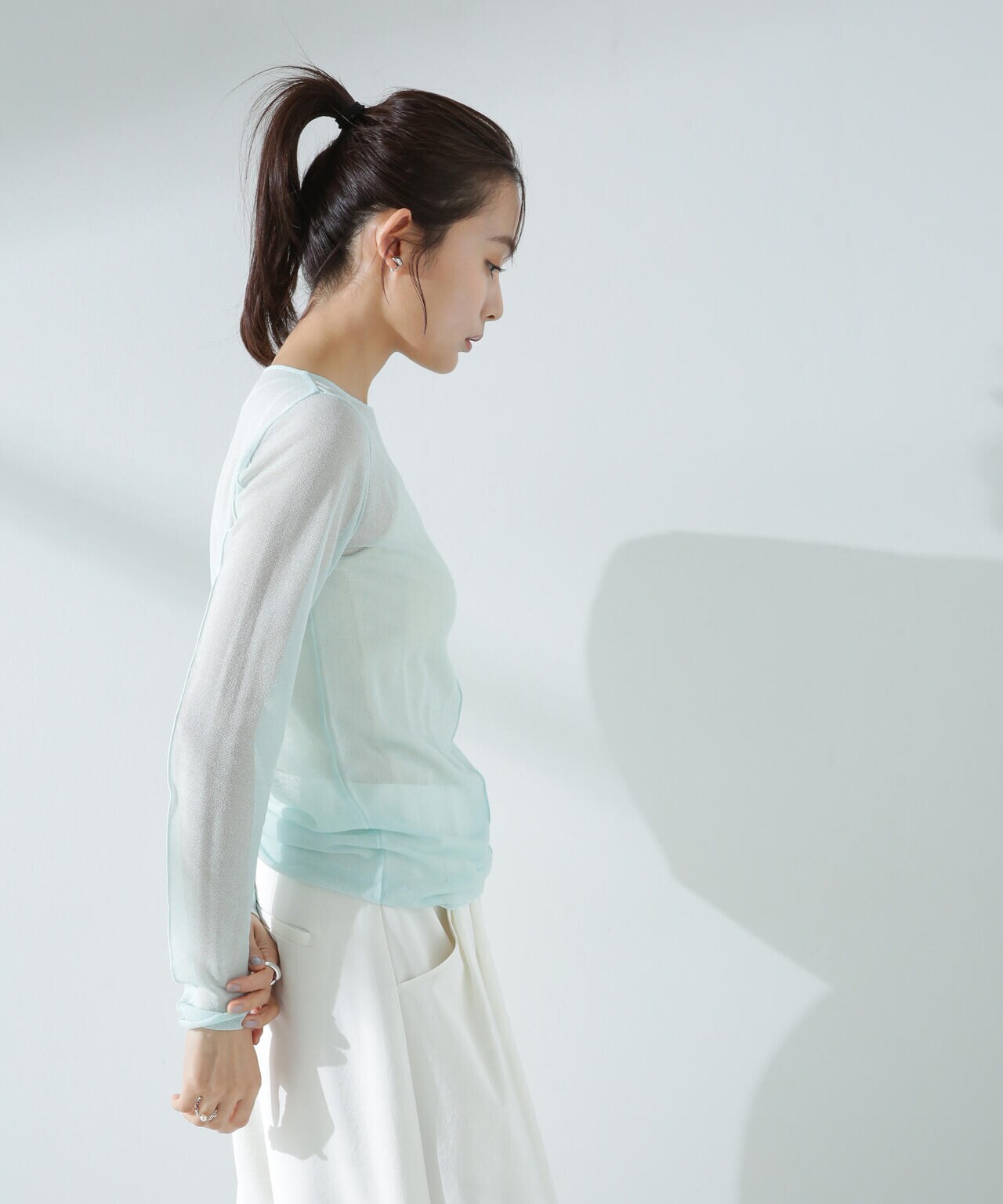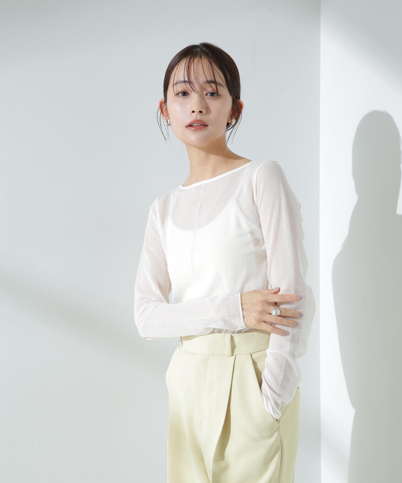 ほんのり素肌が透けるシアートップス。寒い時期には、ニットやカーディガンとのレイヤードスタイルにも活躍する一枚。手首をクシュっとさせることで華奢さを演出するスタイリングをご提案します。