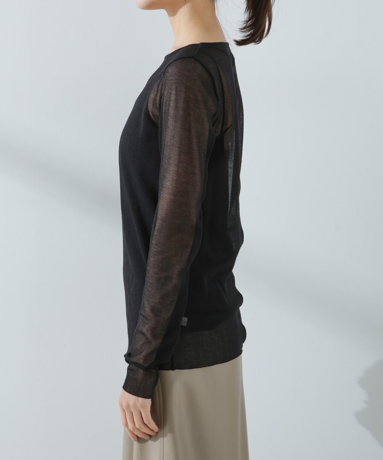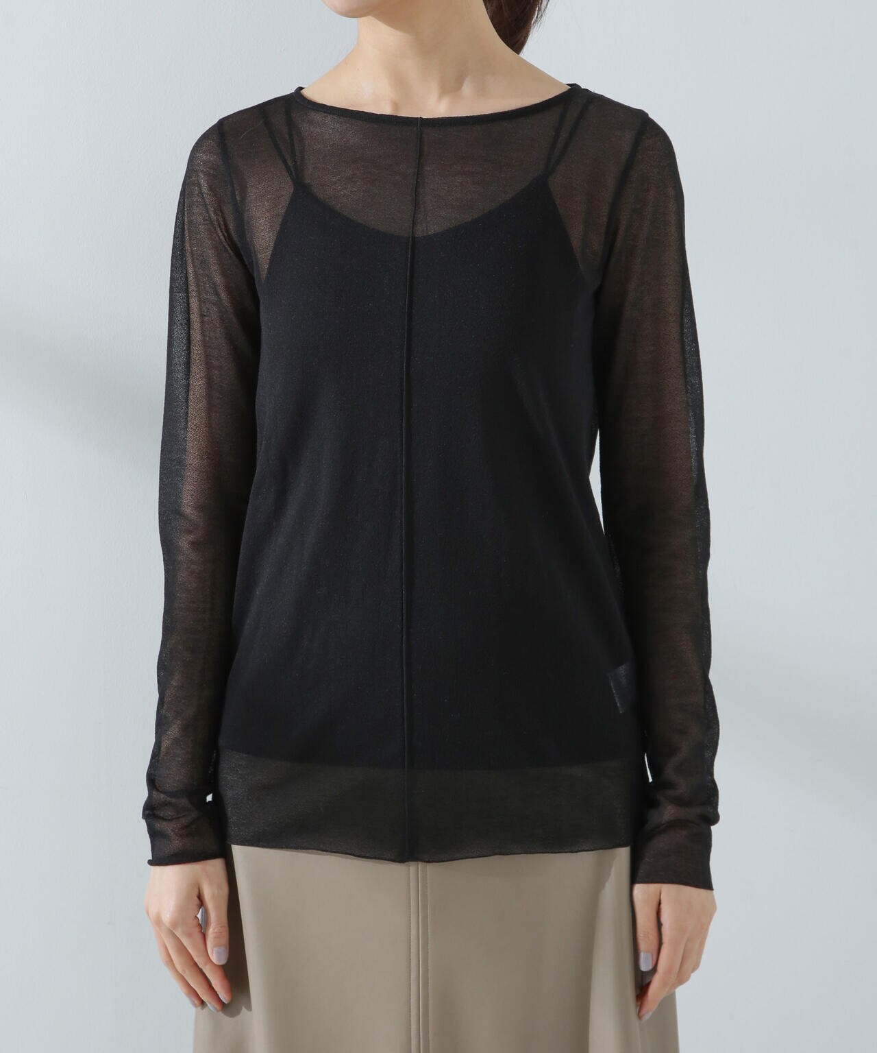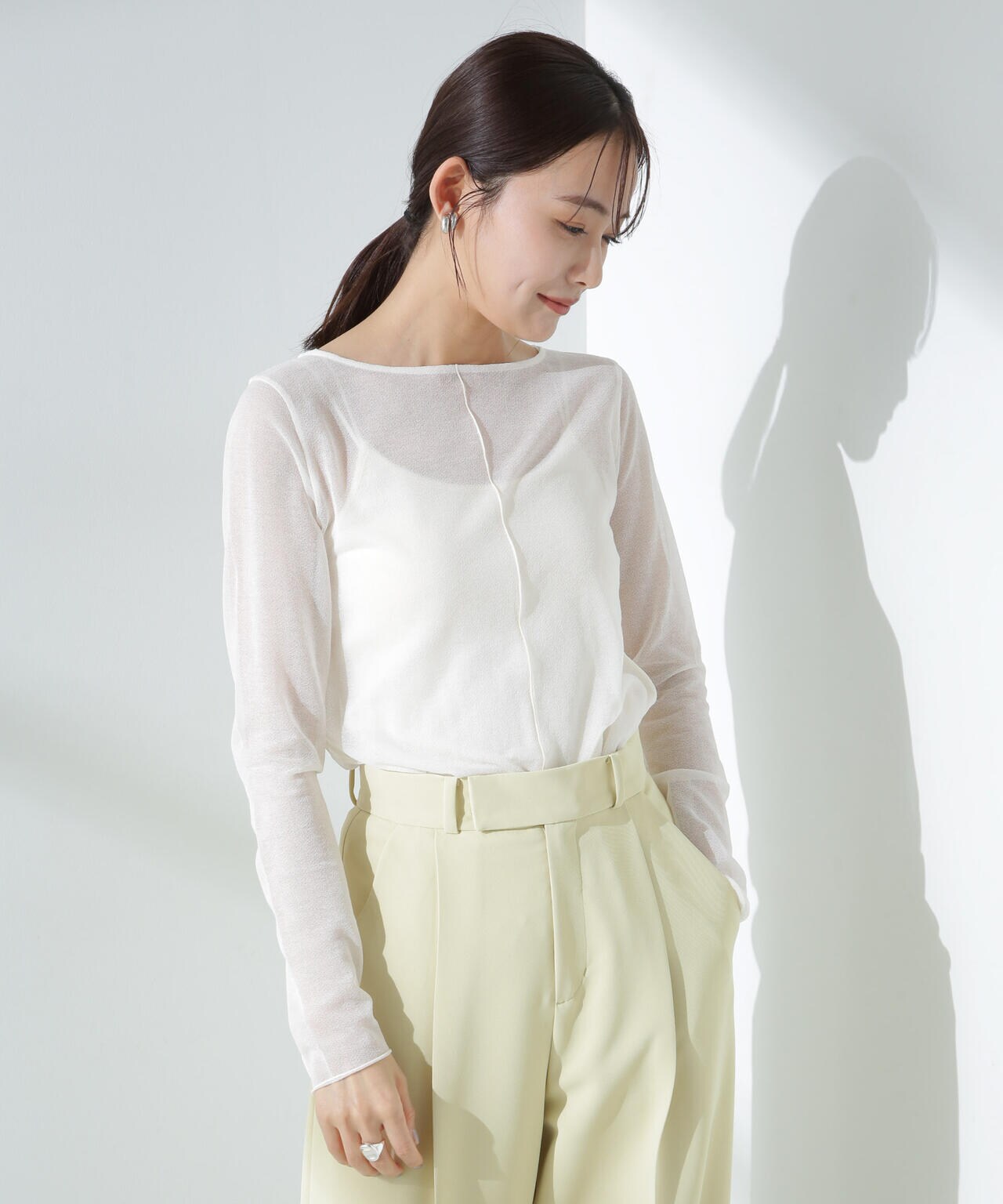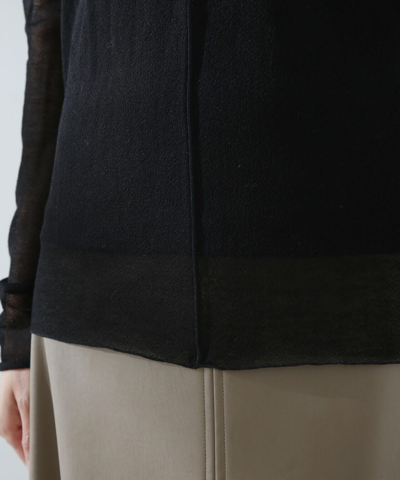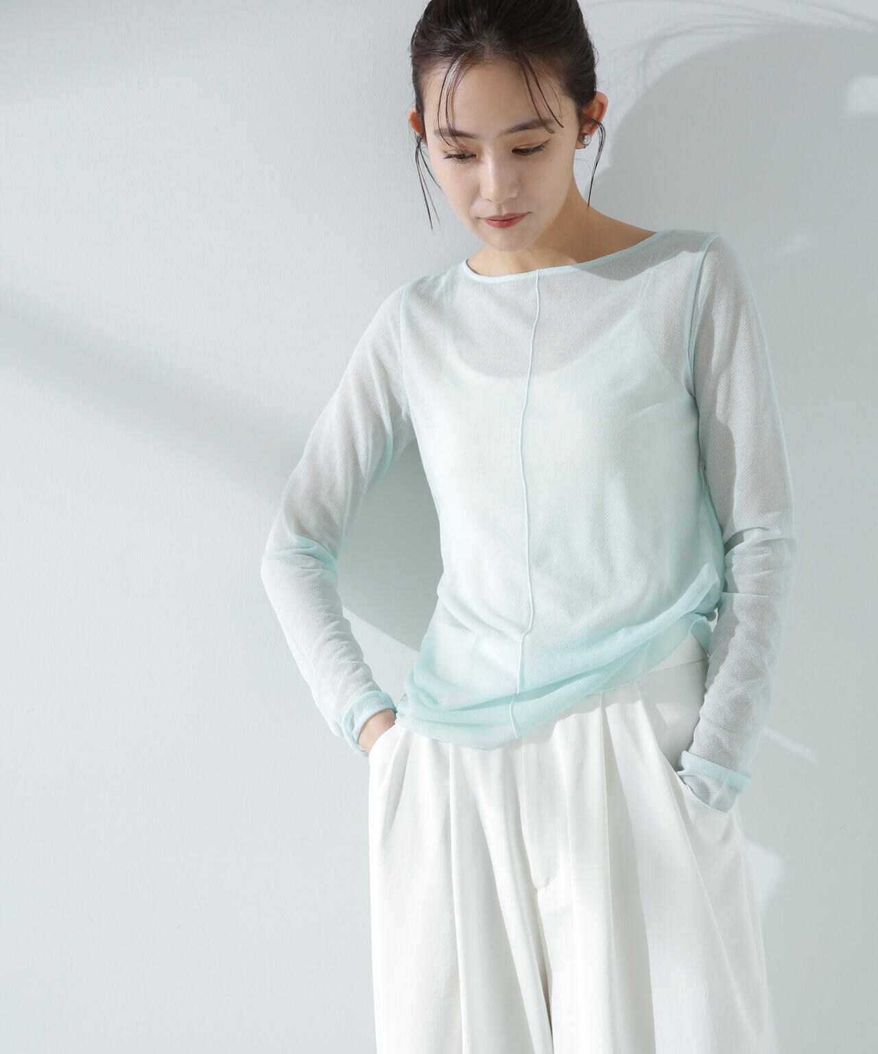 ほんのり素肌が透けるシアートップス。寒い時期には、ニットやカーディガンとのレイヤードスタイルにも活躍する一枚。手首をクシュっとさせることで華奢さを演出するスタイリングをご提案します。