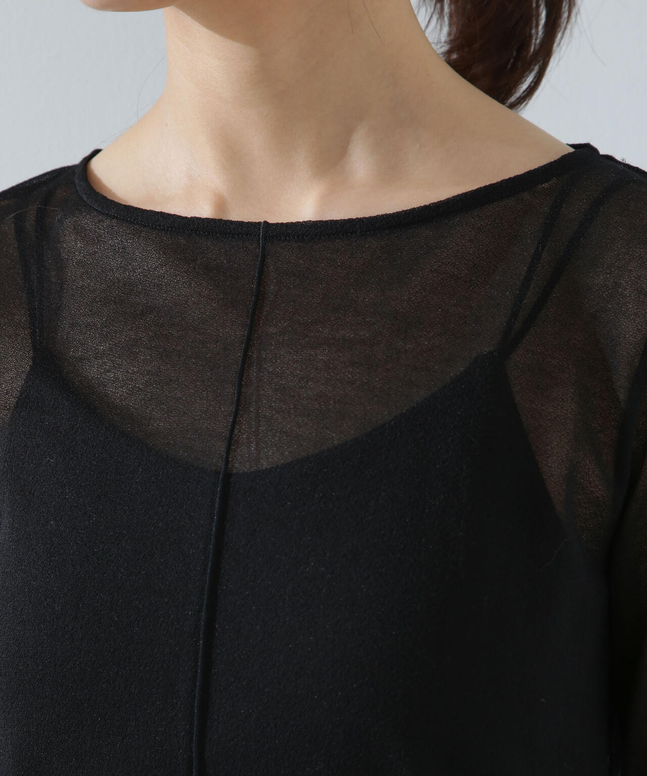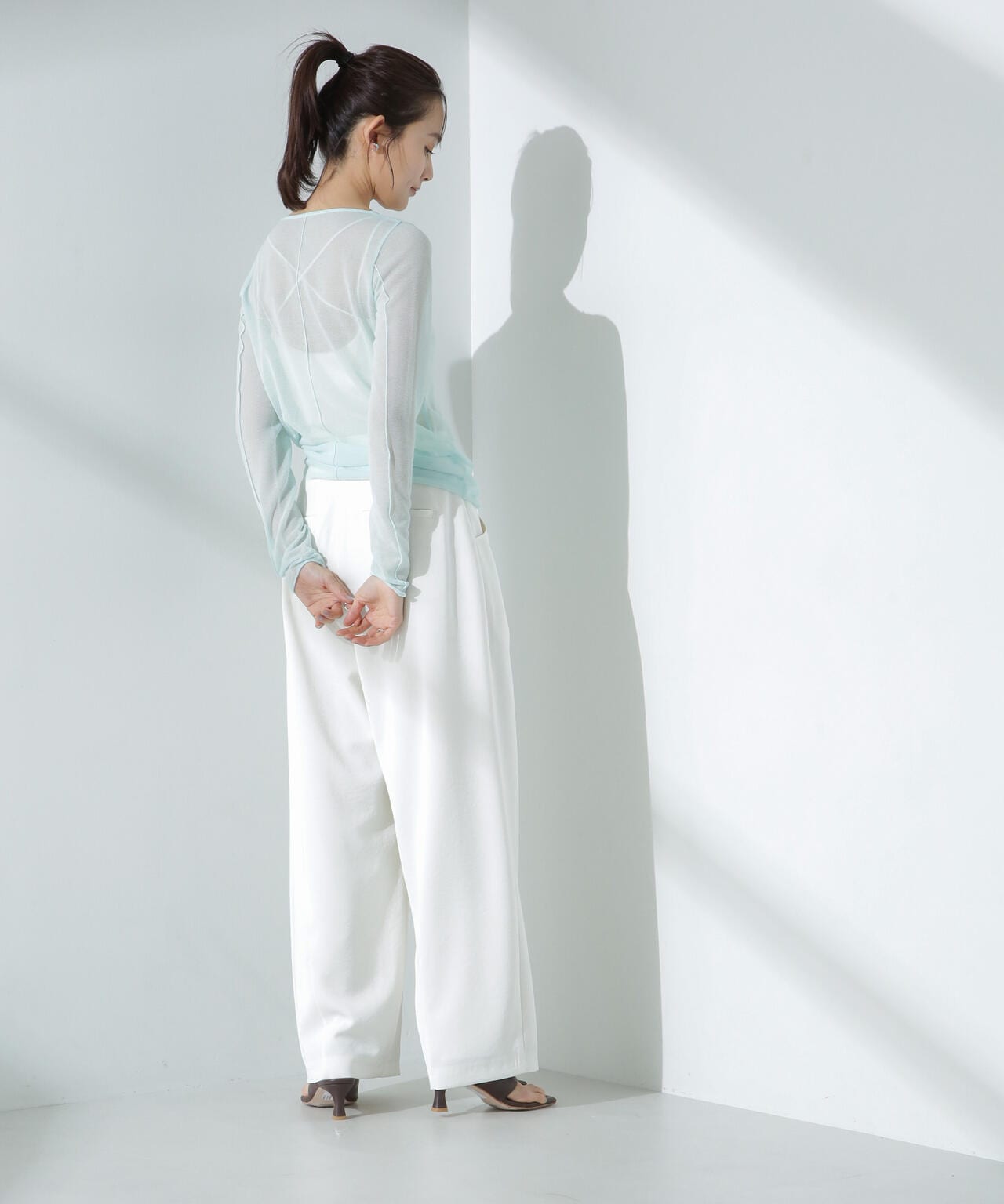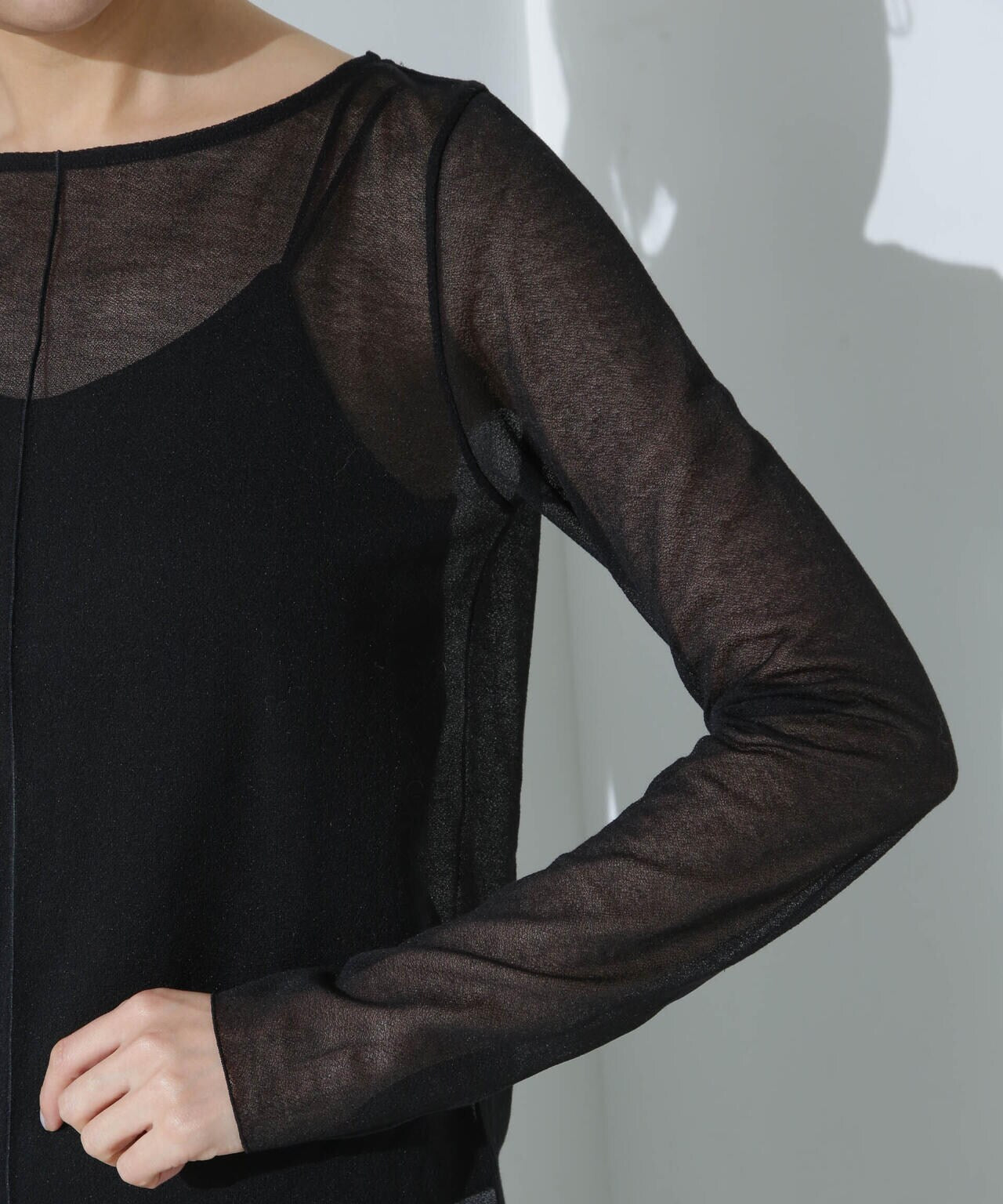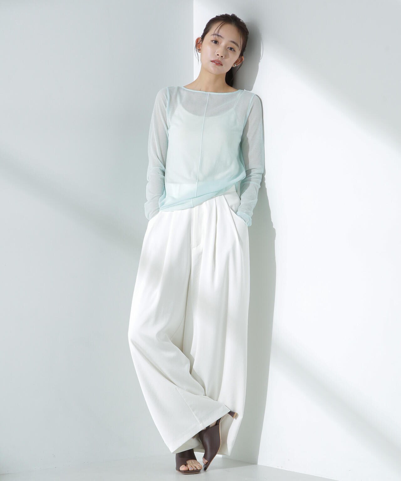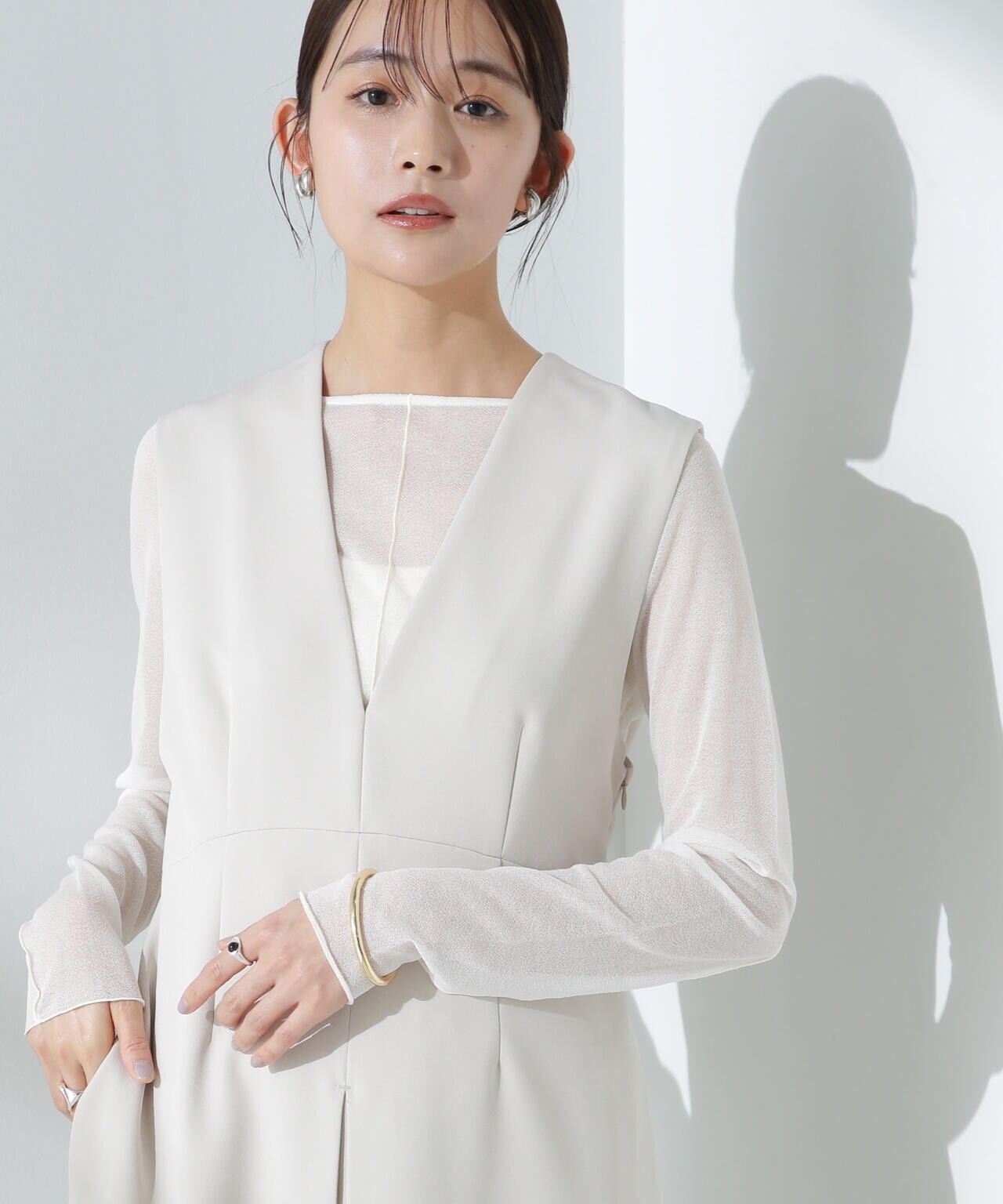 ほんのり素肌が透けるシアートップス。寒い時期には、ニットやカーディガンとのレイヤードスタイルにも活躍する一枚。手首をクシュっとさせることで華奢さを演出するスタイリングをご提案します。