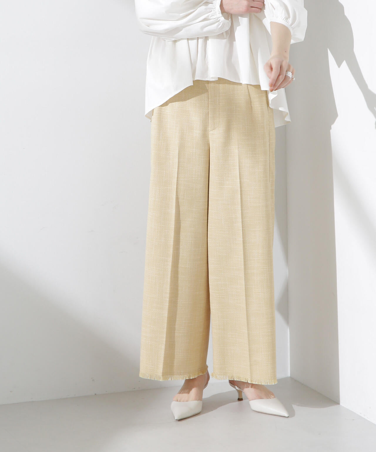ツイード素材が特徴的で上品な仕上がりのフリンジパンツ。センタープレスが脚をまっすぐに見せすっきりとしたシルエットを実現。洗練されたパンツスタイルを演出するオンオフで着回しの効く一枚です。