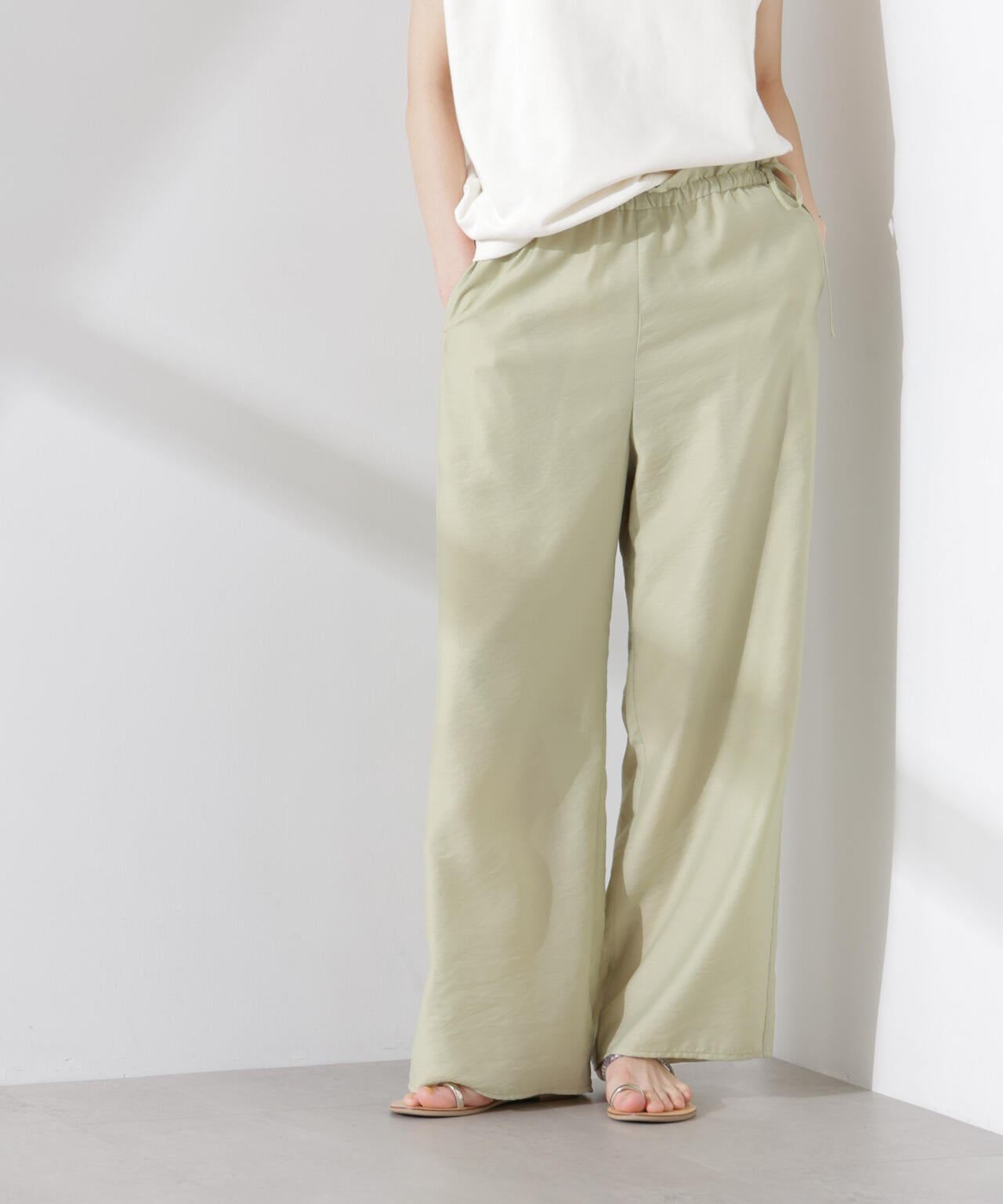 シアー素材がトレンド感のあるワイドパンツ。ウエストのフリルデザインとさりげないリボンディティールが女性らしさをプラス。同素材展開のミディ丈のキャミソールと合わせた抜け感のあるセットアップスタイルがおすすめです。