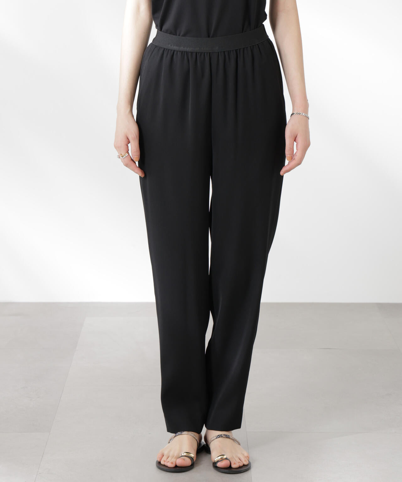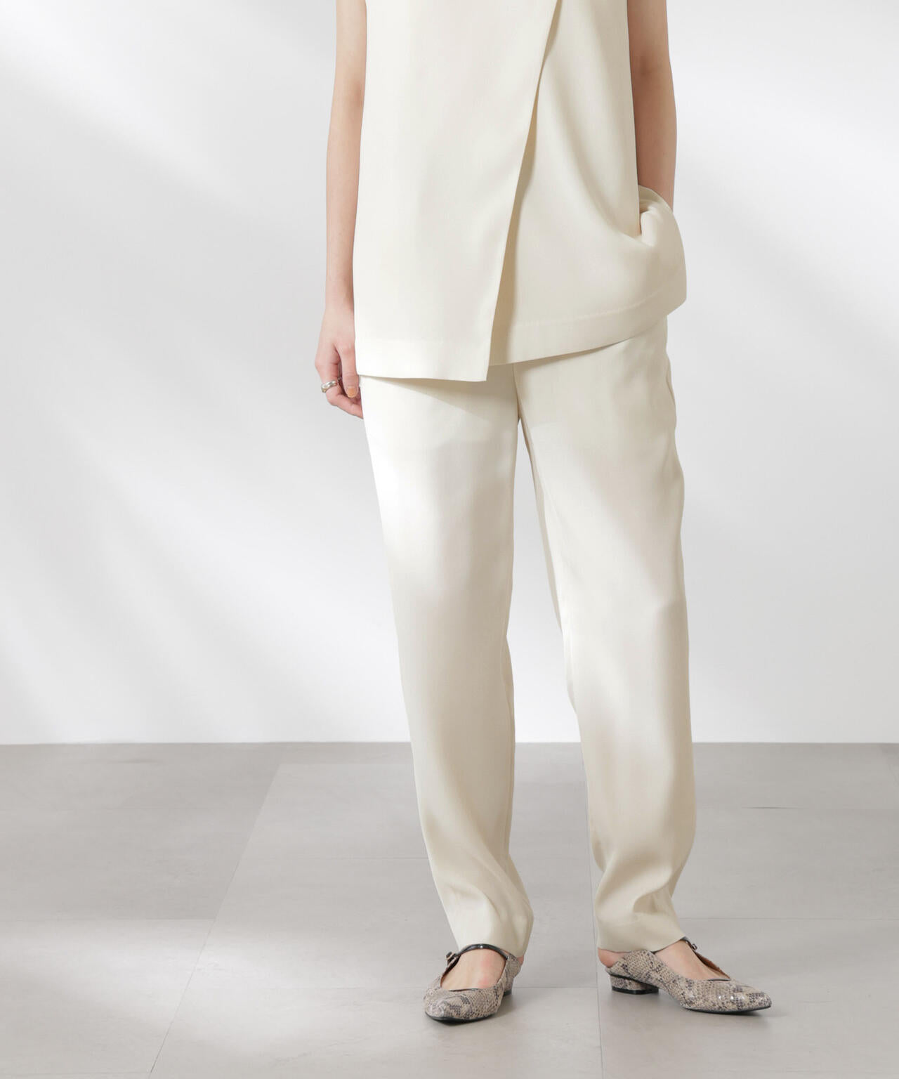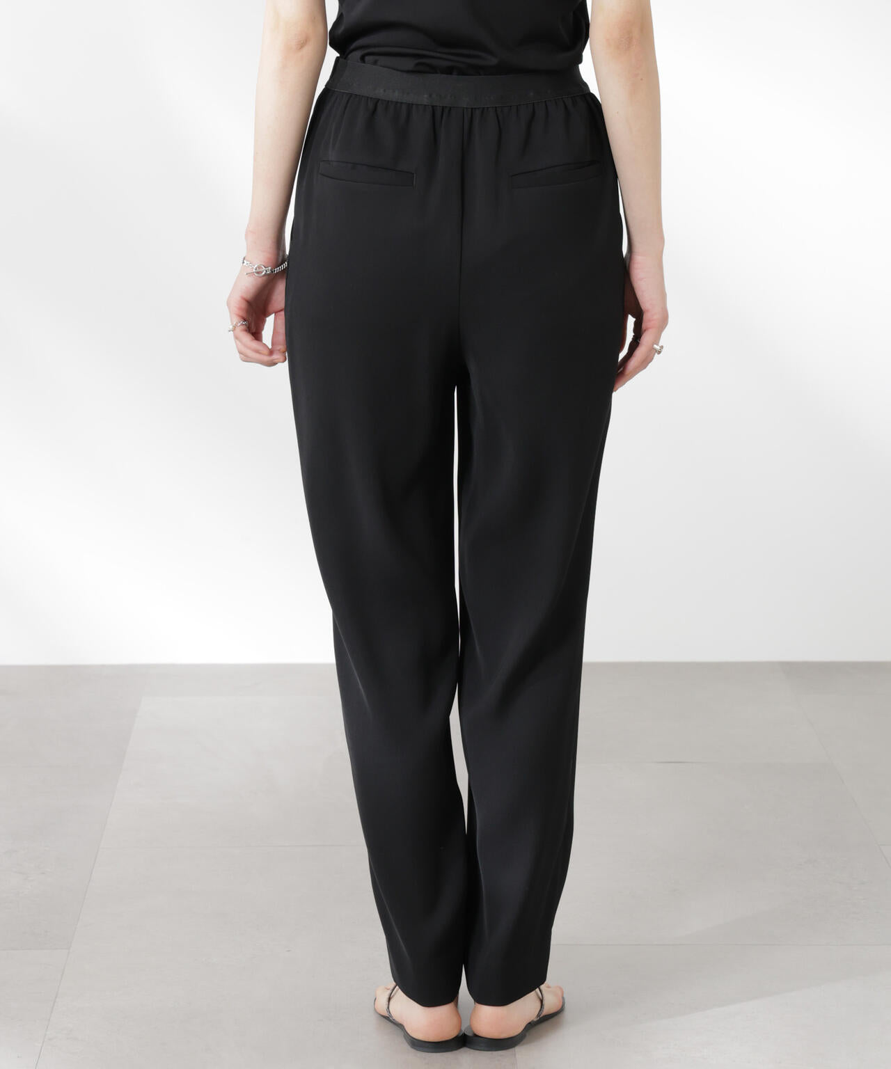 モード感あるダブルクロスのイージーテーパードパンツ。きれいめな印象ながらも着心地がラクで着回しが効くので、ワードローブ追加しておくと頼れるイージーパンツです。