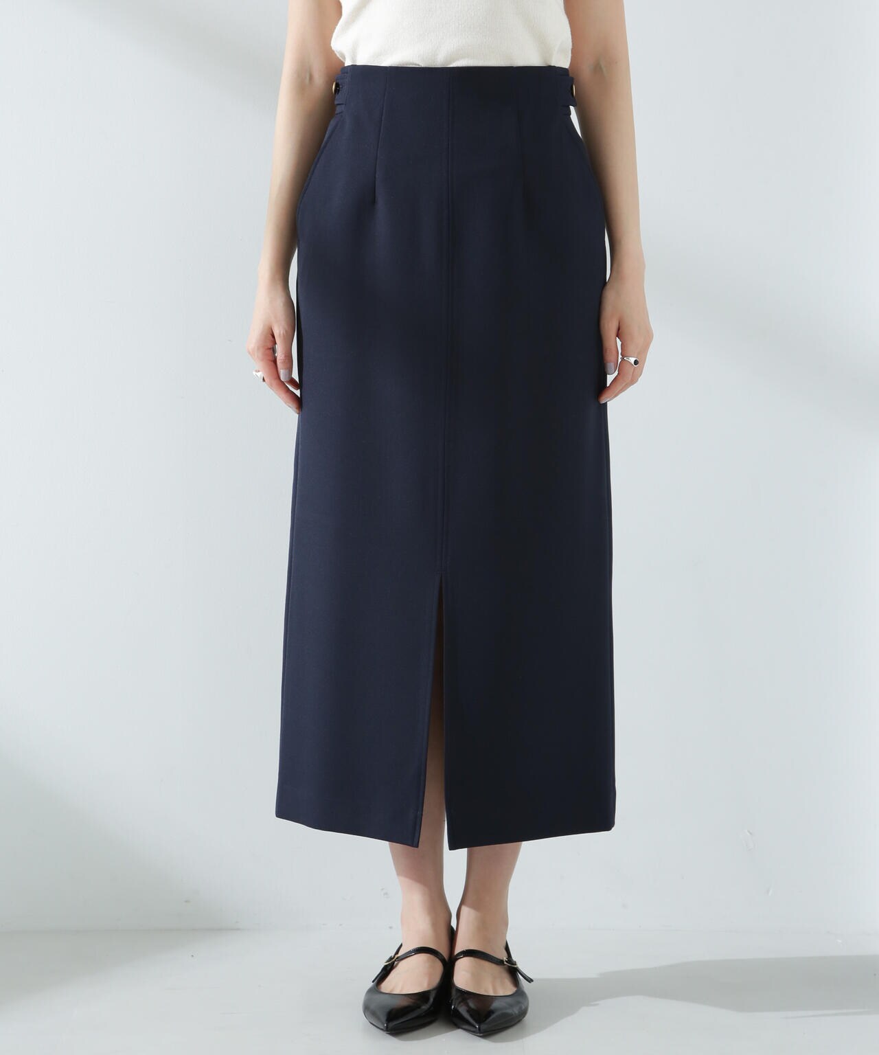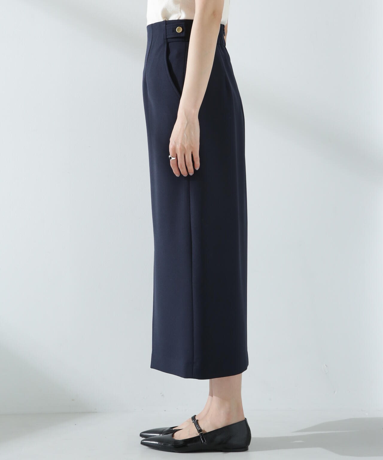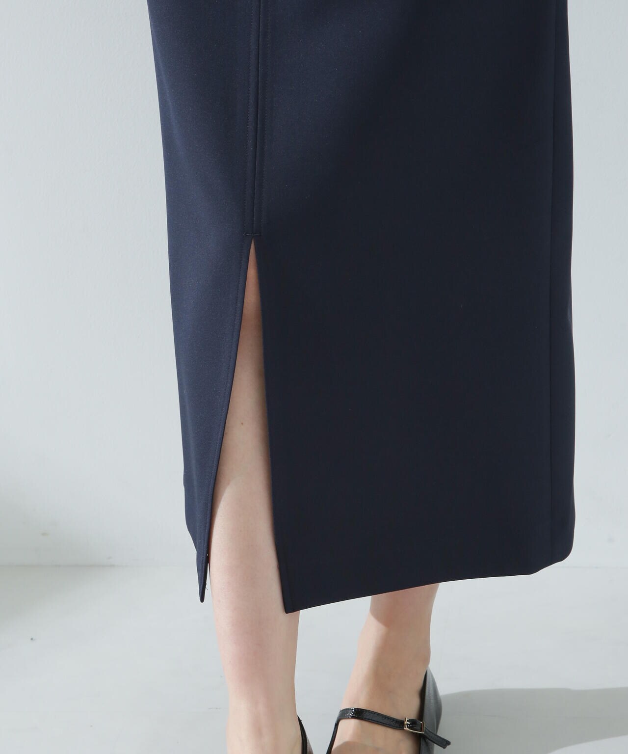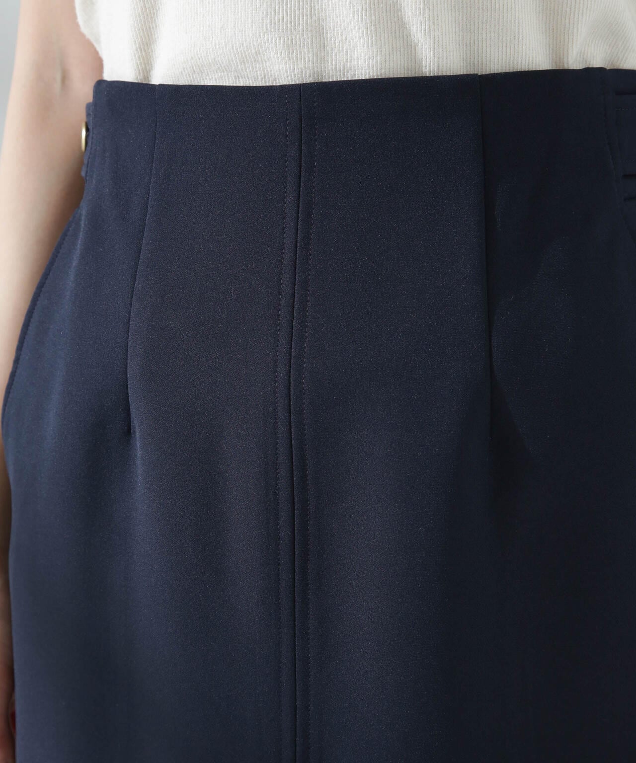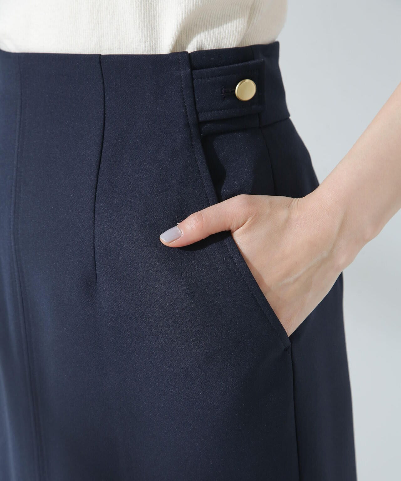 多機能で快適な着心地が叶う、「デイリーファンクション」シリーズのタイトスカート。ゴールドボタン付きのタブデザインがポイントになるので、コンパクトなトップスをインするだけでサマになります。