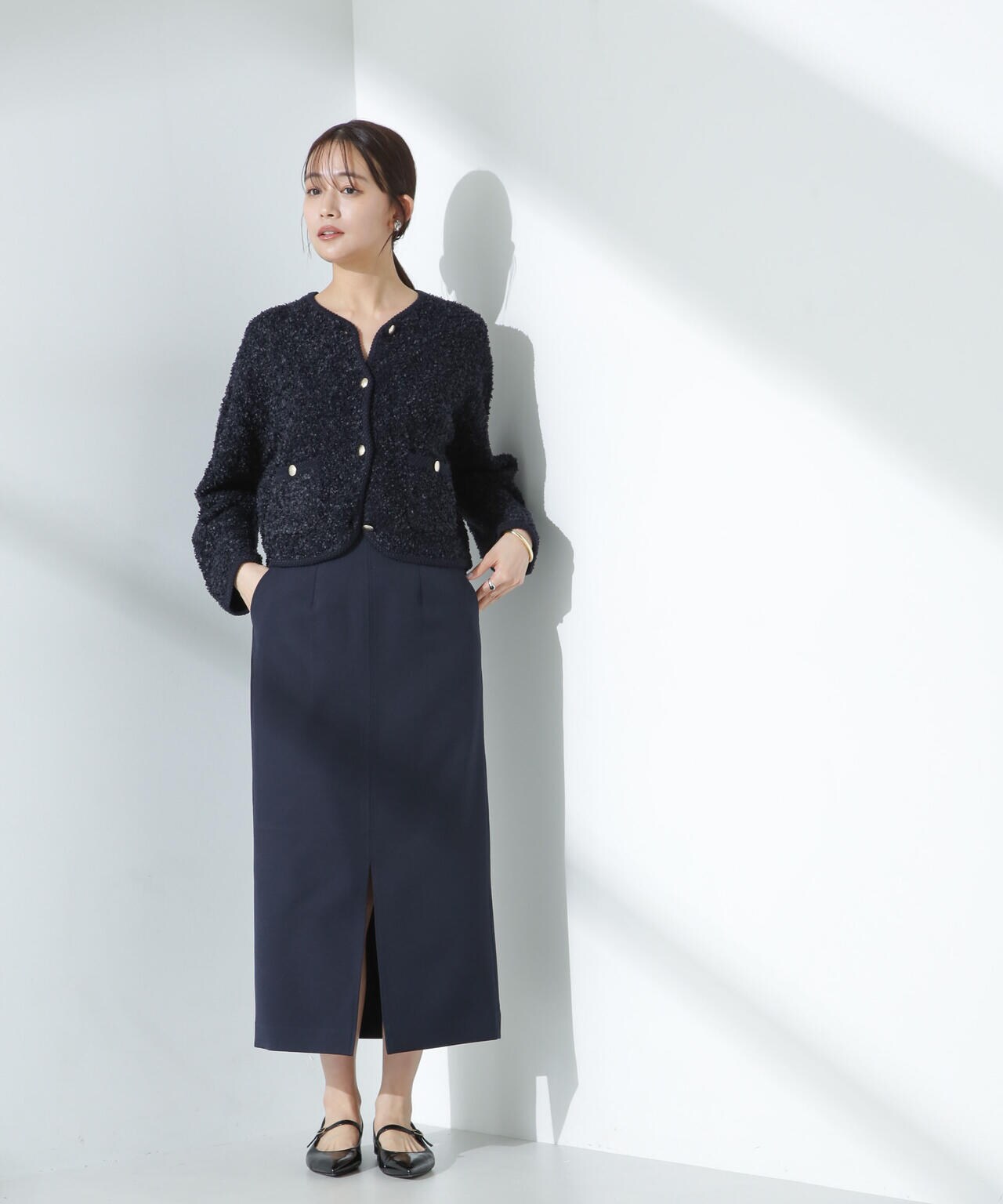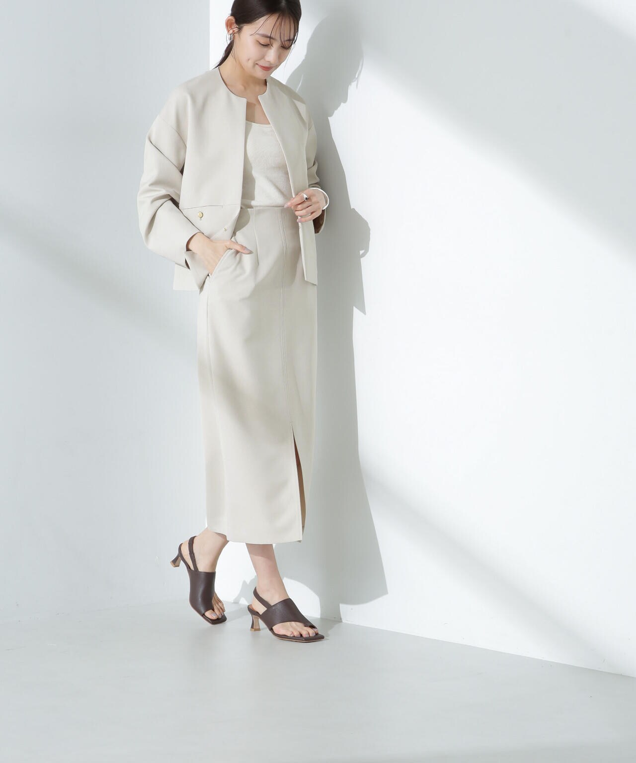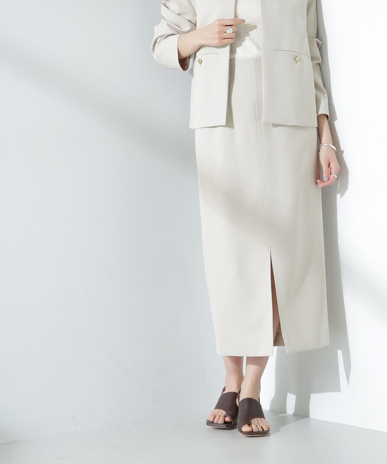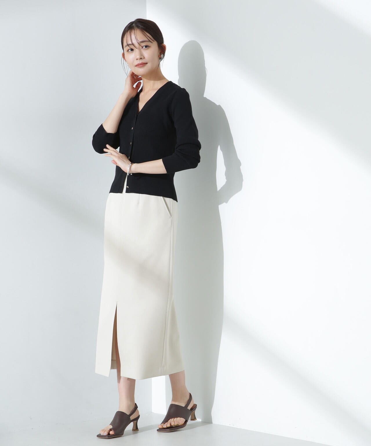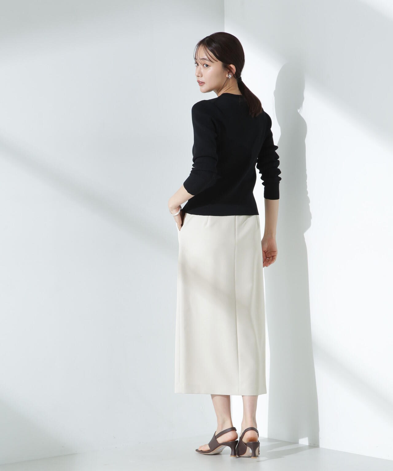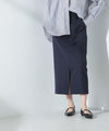多機能で快適な着心地が叶う、「デイリーファンクション」シリーズのタイトスカート。ゴールドボタン付きのタブデザインがポイントになるので、コンパクトなトップスをインするだけでサマになります。