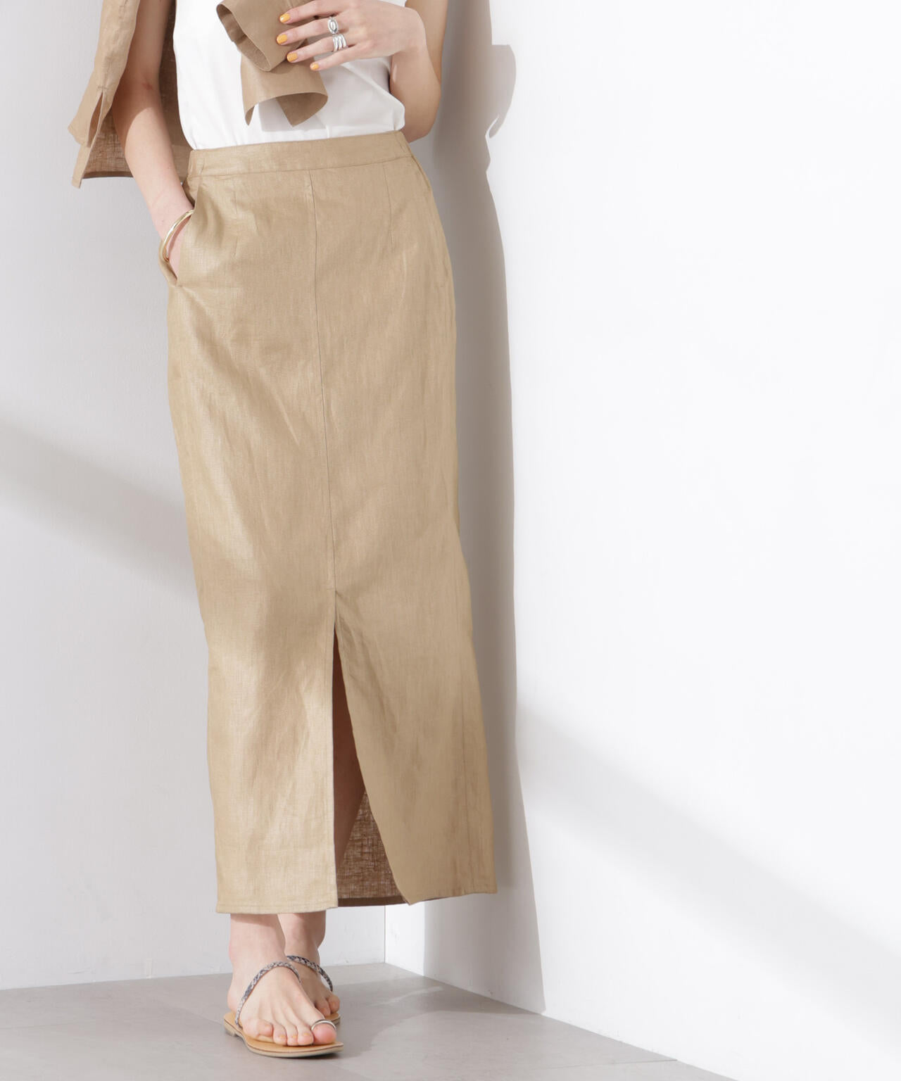 涼し気なリネン生地で仕立てたフレアスカート。ウエストゴムで履き心地が良く、きれいめなIラインシルエットでスタイルアップが叶う一枚。サイドに切り替えを入れることによりデザイン性のあるスカートに仕上がりました。