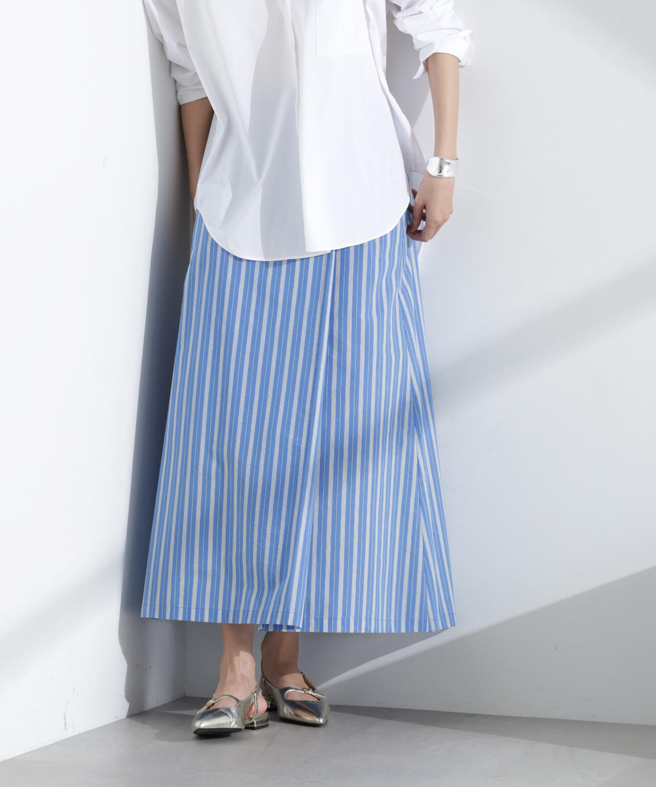 爽やかなストライプの生地がコーディネートのポイントになるロングスカート。Aラインのややフレアシルエットで、すっきりとしながらも動くと揺れ感が出て雰囲気のある仕上がりに。生地違いで色合わせした同シリーズのシアーストライプシャツとのセットアップスタイルがおすすめです。