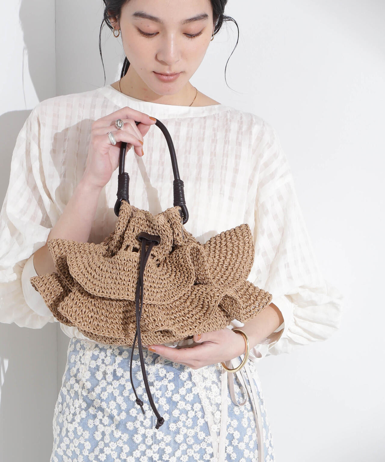 フリルが目を惹く夏にぴったりなサマーバック。フリルが2段入っていて立体感のある華やかな印象の一品。可愛いデザインながらハンドル部分には合皮を使用した、大人見えするスタイリングが叶うアイテムです。
