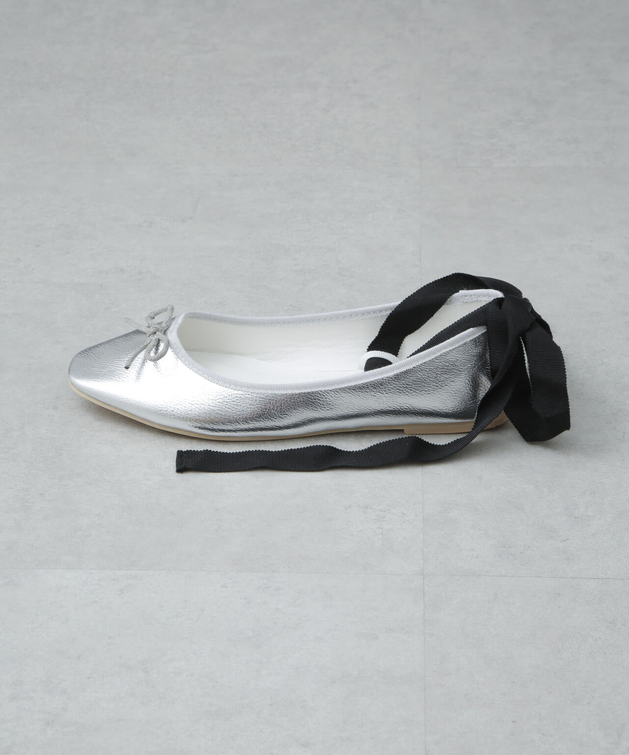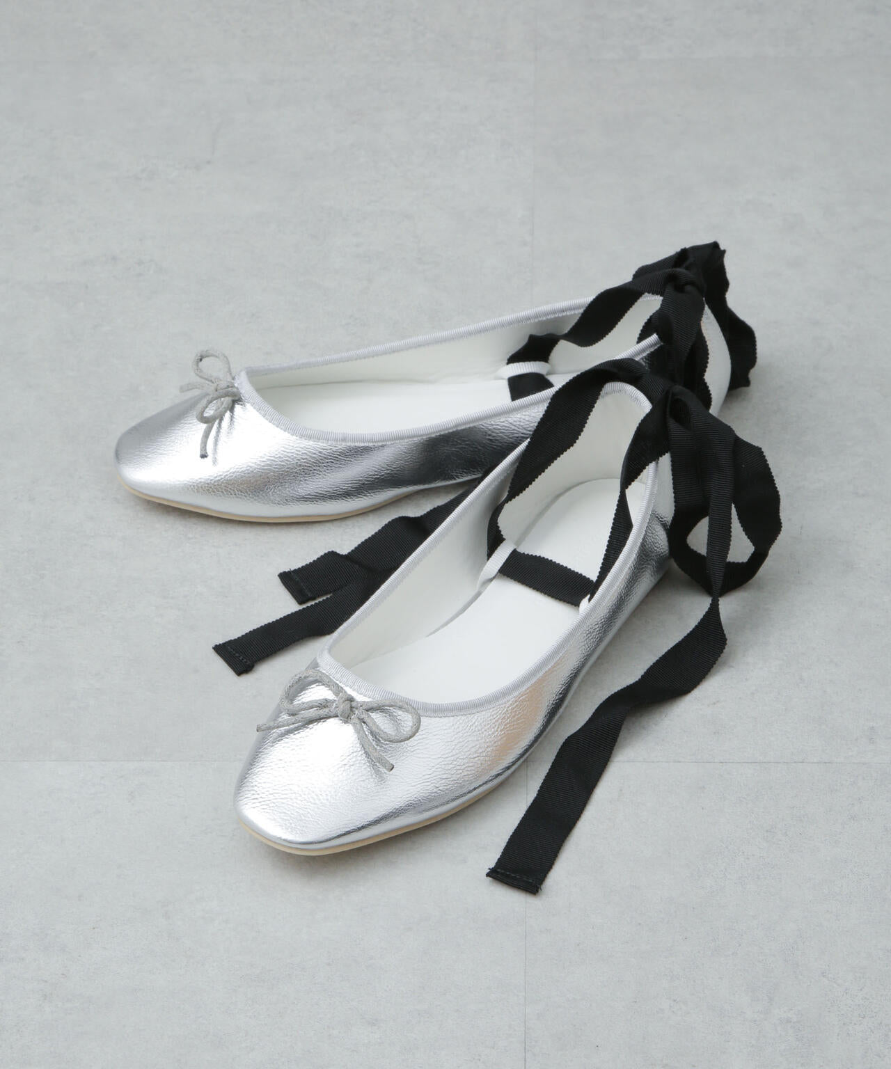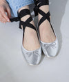 カジュアルな印象で合わせられるラフな印象のバレエシューズ。シンプルなバレエシューズタイプと、セットのリボンテープを甲上でクロスして足首に巻いて履くタイプの2WAY仕様。キラッと光るメタリックカラーが足元にトレンド感を与えてくれる旬なアイテムです。