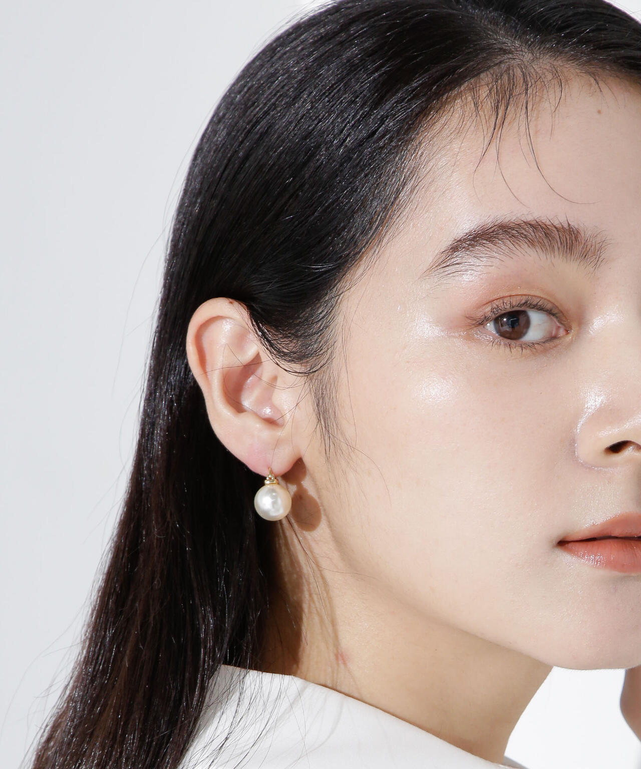 ゴールドとパールの異素材コンビが上品なピアス。着けた際にパールが垂れるようなドロップパールのデザインが、顔周りにパッと華やぎを演出してくれるプラスワンアイテムです。