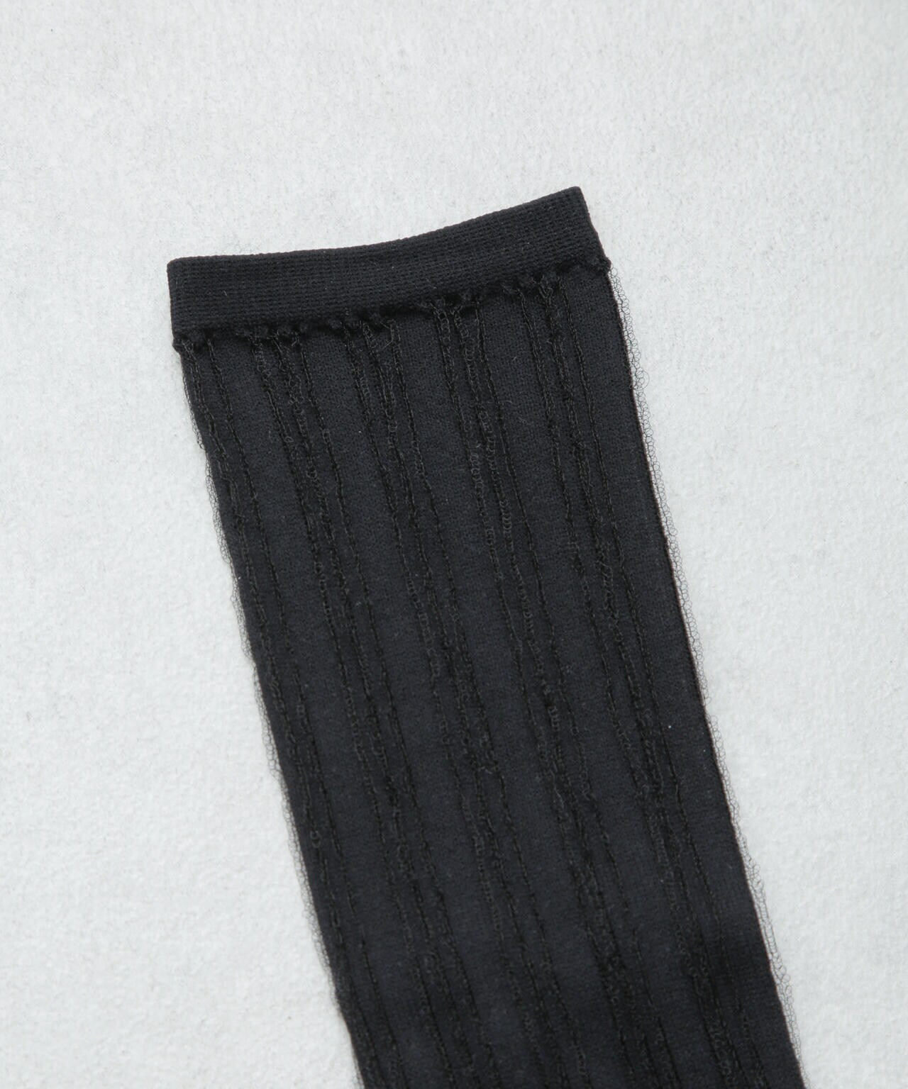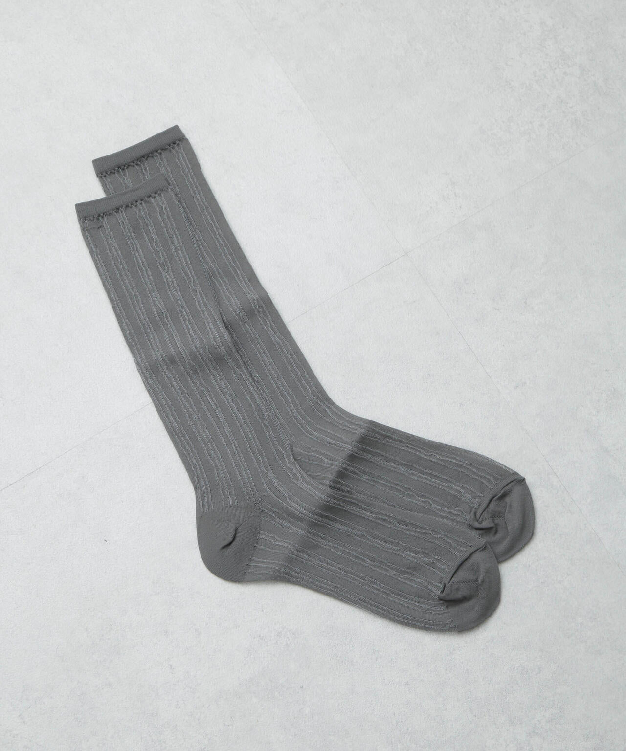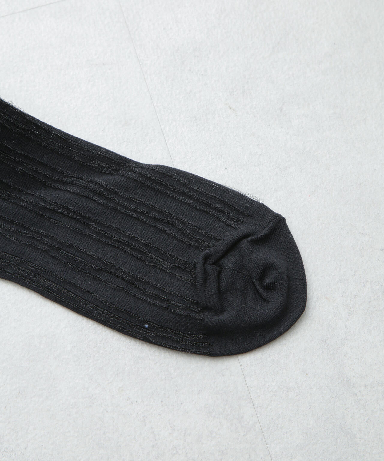 特徴のあるシアーリブ編みがポイントのソックス。シアーと普通の糸ミックス編みのリブ仕様で、履くと透け感のあるストライプデザイン。トレンドのシアーを取り入れているので、お持ちのシューズに合わせていただくと今年らしい足元が完成します!