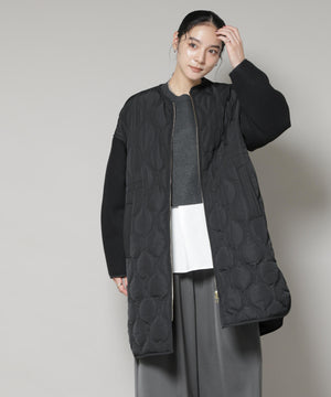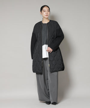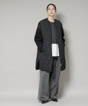 異素材コンビがポイントのカジュアル中綿キルティングコート。異素材の組み合わせによって単調になりがちなキルティングコートにワンテクニックをプラスし、カジュアルながらも洗練されたデザインに仕上げた一着です。