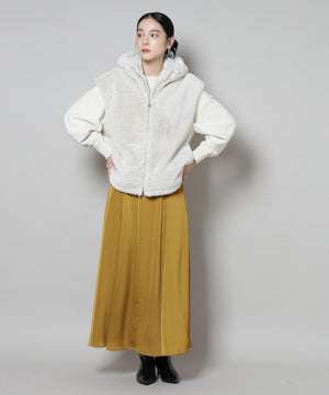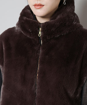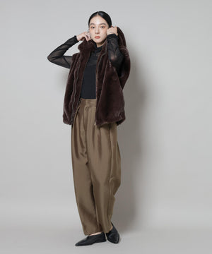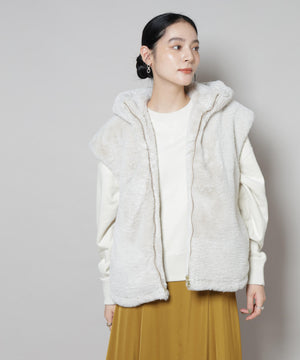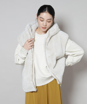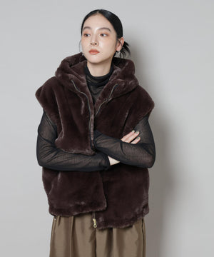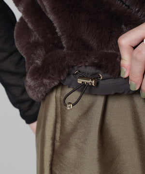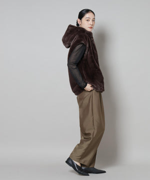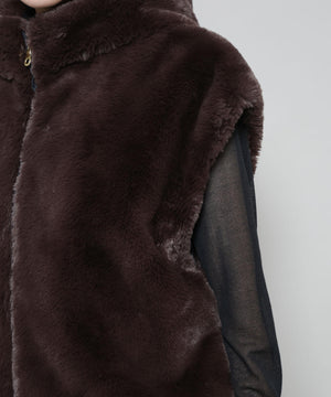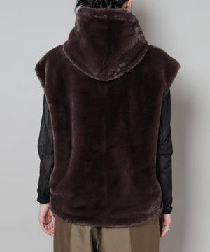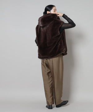 高密度の滑らかなフェイクファーを使用したフードベスト。とても柔らかく落ち感があり、しっとりとした肌触りで思わず触れたくなるような質感が特徴の一品。中綿やライナーがなくても十分に暖かく、初秋のレイヤードアイテムとして重宝してくれます!