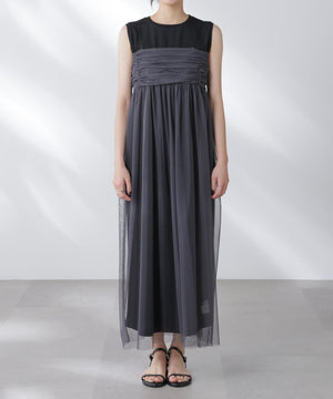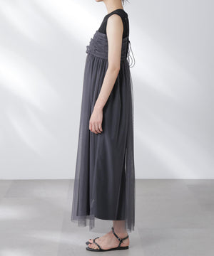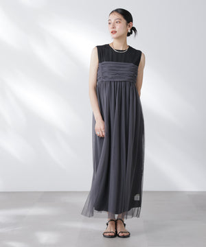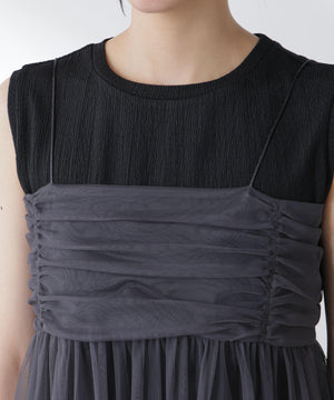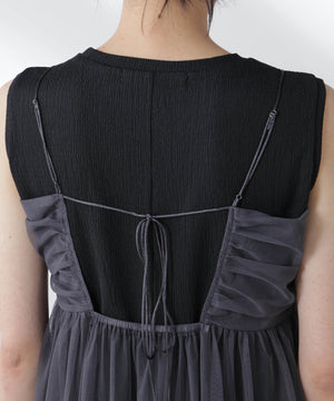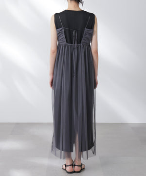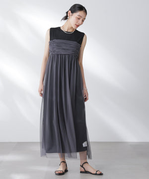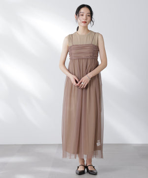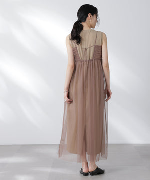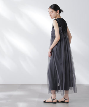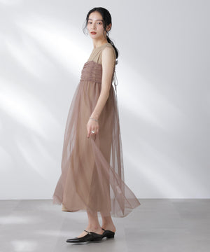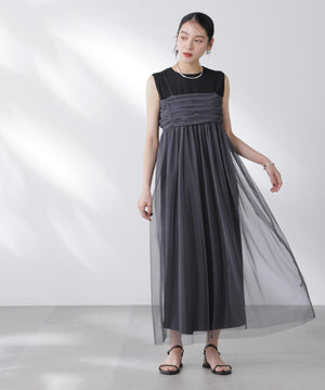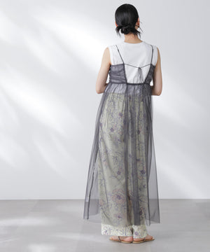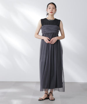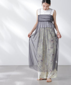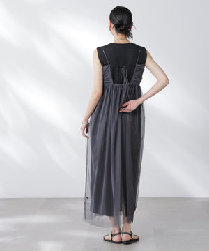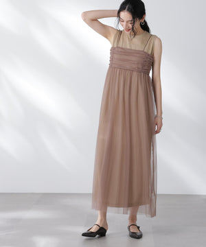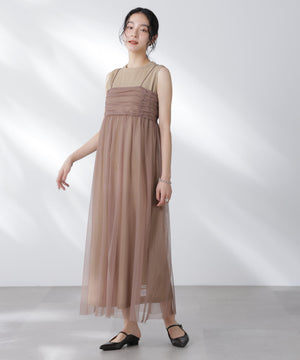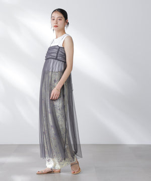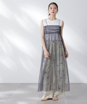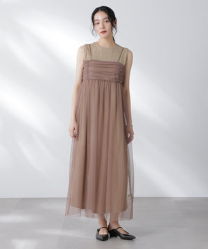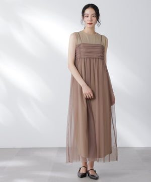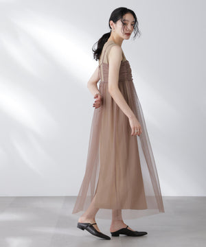ニュアンシーなカラーでおしゃれな抜け感のあるワンピースセット。カットワンピースの色と重なり、チュールのグラデージョンの透け感が合わさった色合いがポイント◎。細かい表面変化素材が上品な印象のカットワンピースは、1枚ではもちろん上からジレやビスチェを合わせてレイヤード楽しむのもおすすめです。