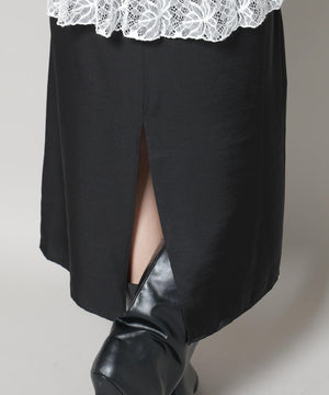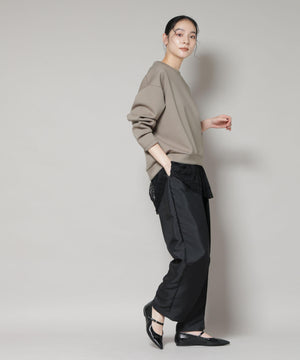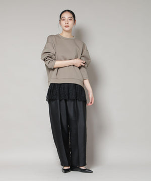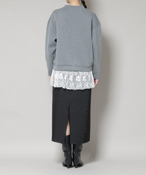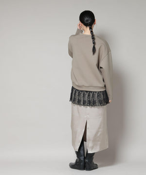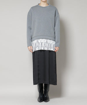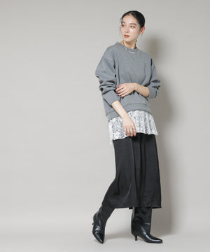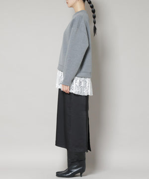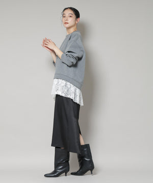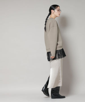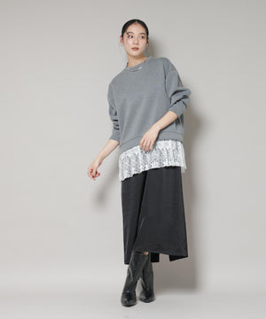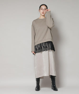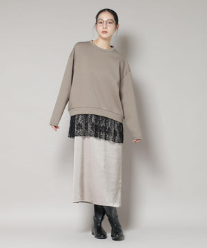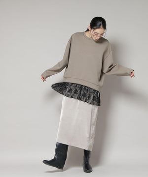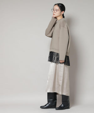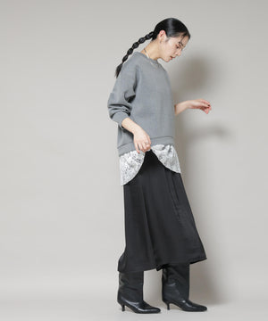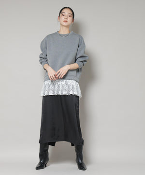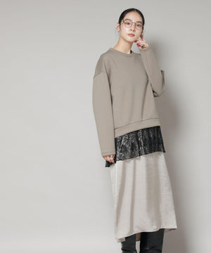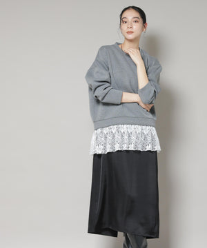 異素材トップスとキャミワンピースがセットになったレイヤード風ワンピース。膨らみのあるダンボール素材のトップスは丸みのある立体的なシルエットで、裾の繊細なレースがフェミニンさをプラス。一枚で簡単に旬のレイヤードスタイルが完成する便利なアイテムです。