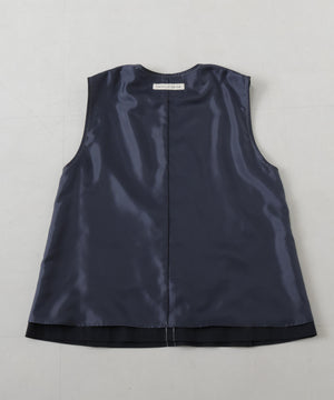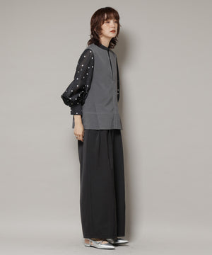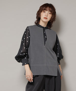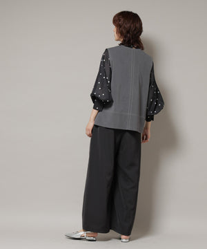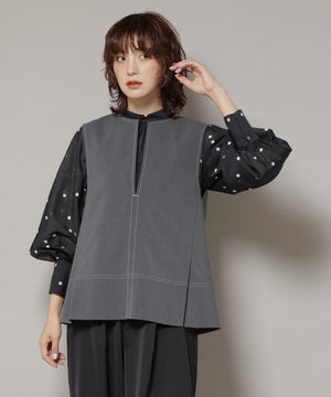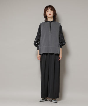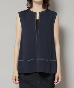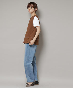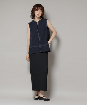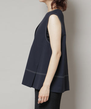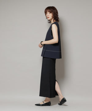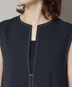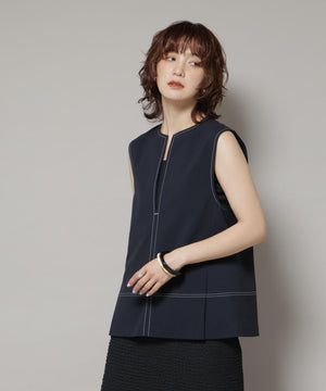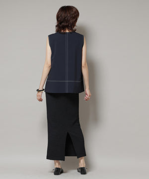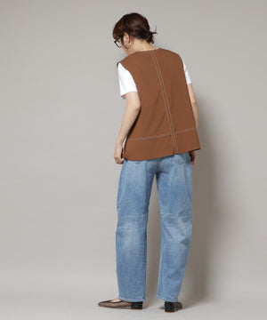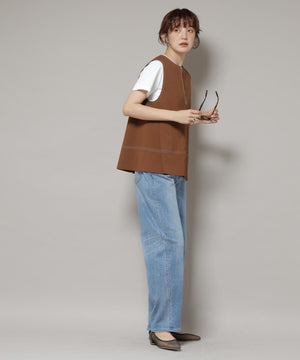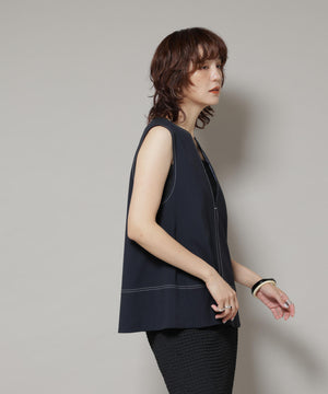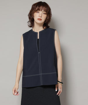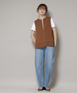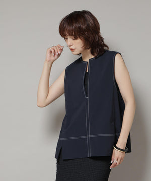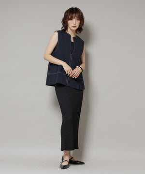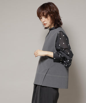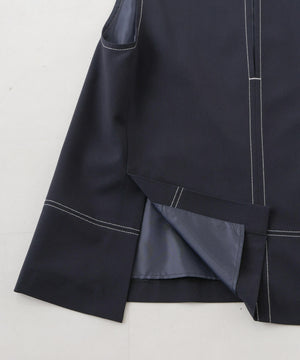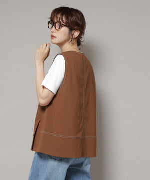 初秋におすすめの梳毛ライクで仕立てたセットアップシリーズのキーネックベストトップス。少し長めの着丈に、ベンツやステッチを入れてポイントを付けた拘りの光るデザインも魅力。同素材シリーズのパンツとのセットアップスタイルがおすすめです。