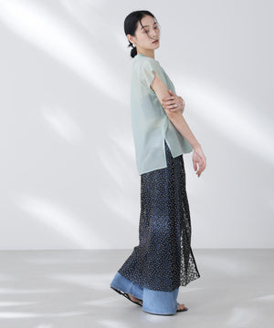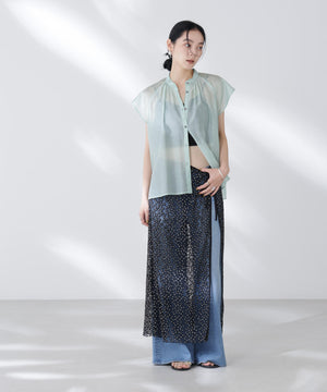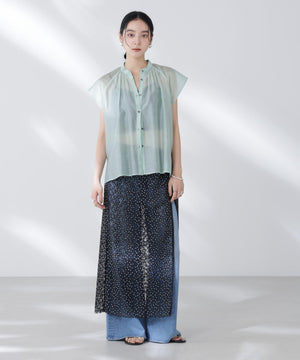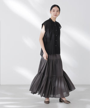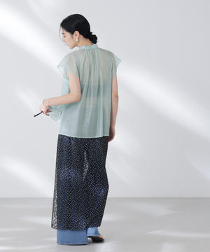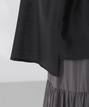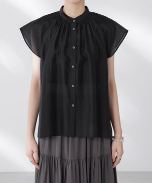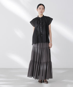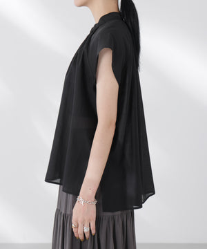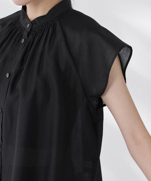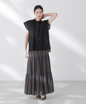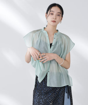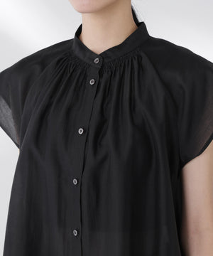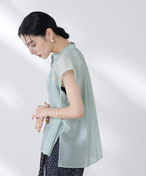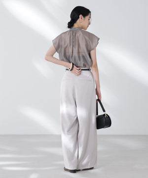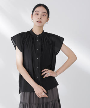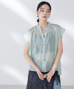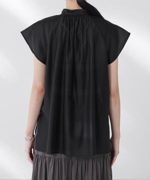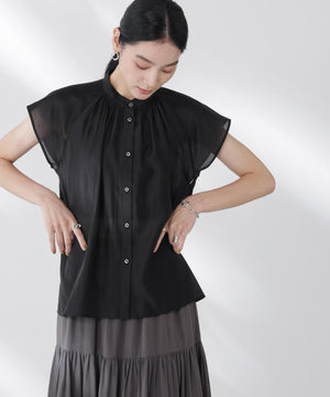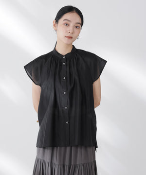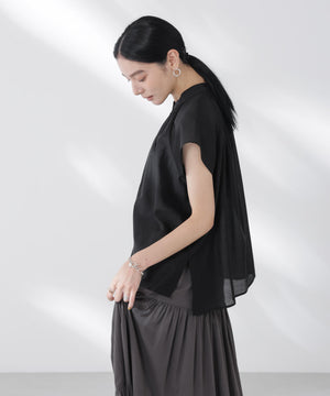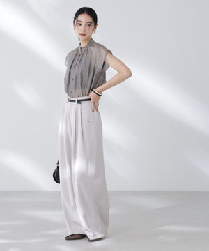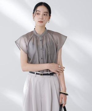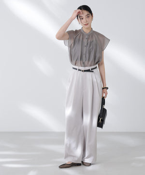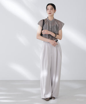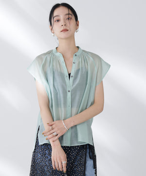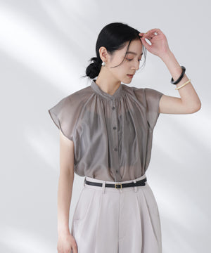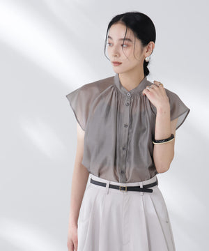 昨年ご好評頂いたシアーサテンのスタンドカラーブラウスが、今季デザインをアップデートして再登場!スタンドカラーの衿ぐりに入ったギャザーがふわっと女性らしいドレープ感を演出。光沢感のある上品な素材感がカジュアルにもきれいめにも重宝する一着です。