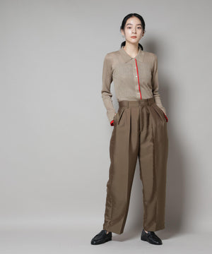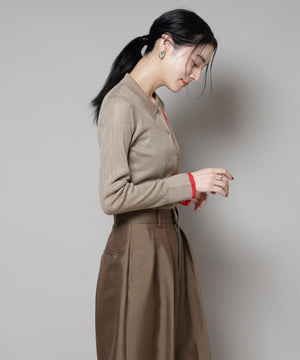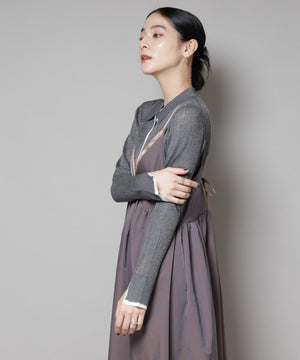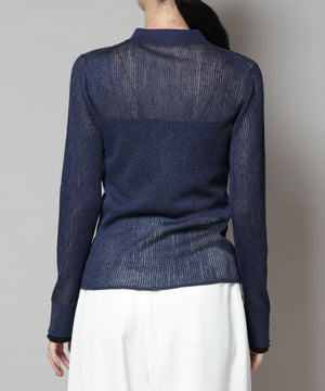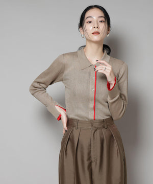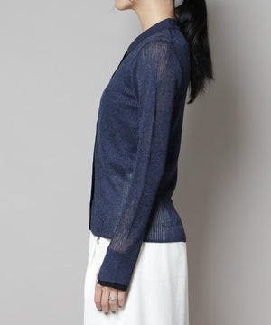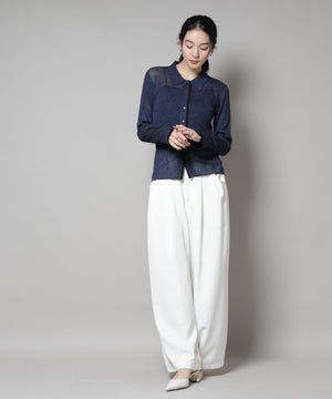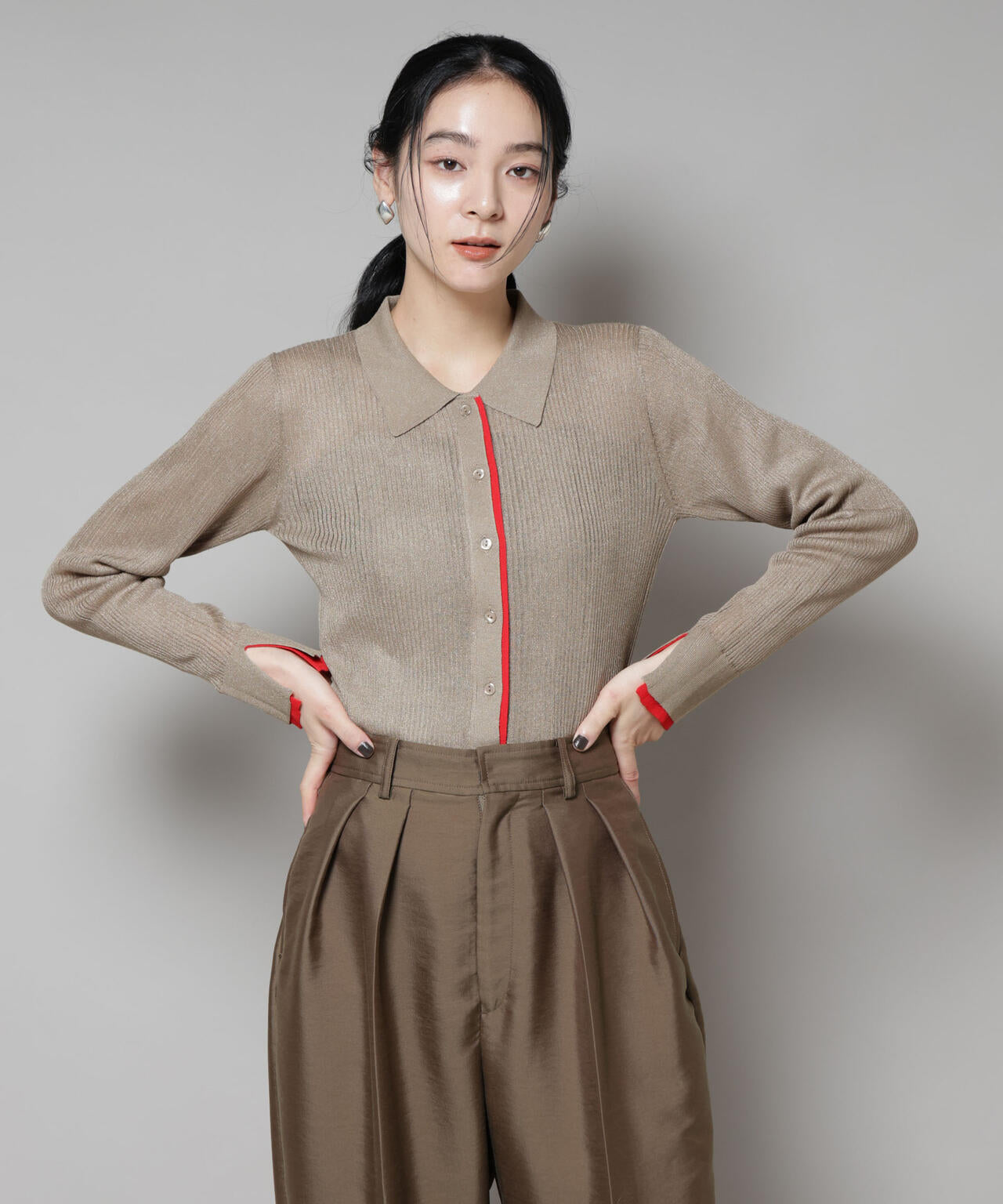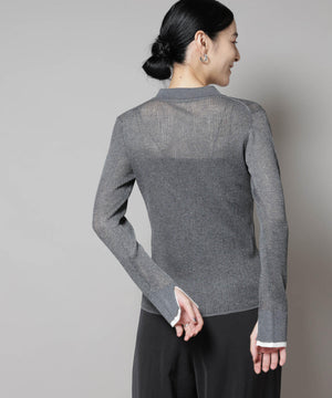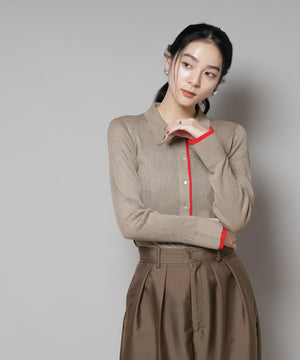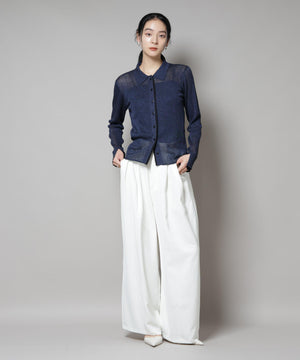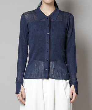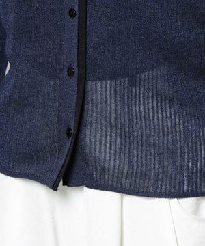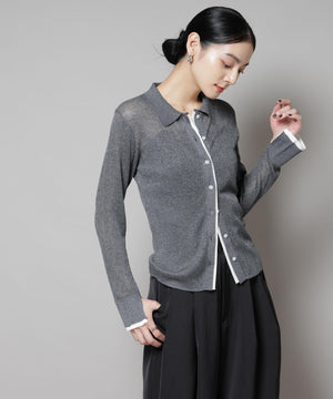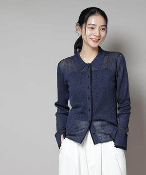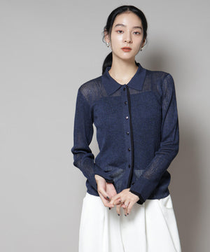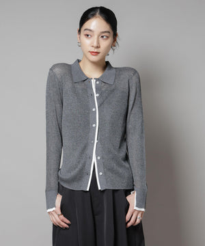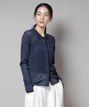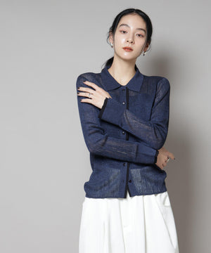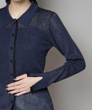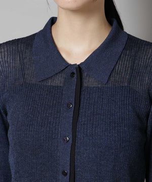 ほんのり透けるシアーリブが女性らしい柔らかさと抜け感を演出するニットカーディガン。トレンド感のある衿付きデザインや、前立てと袖口から覗くバイカラーパーツも魅力のポイント。インナー次第でロングシーズン活躍してくれる一着です。